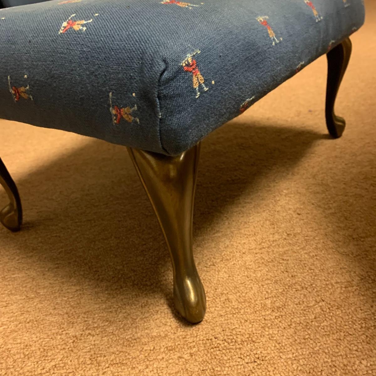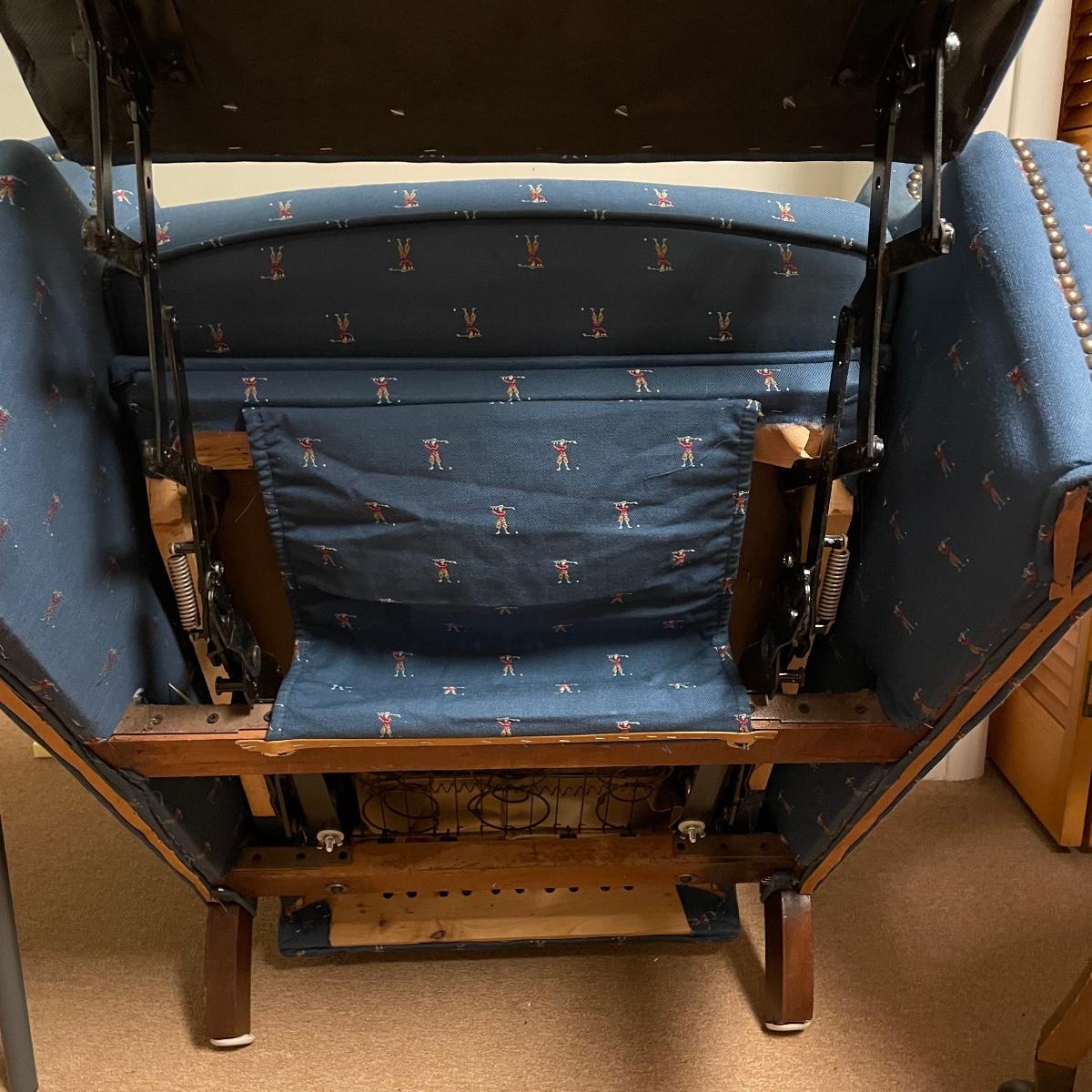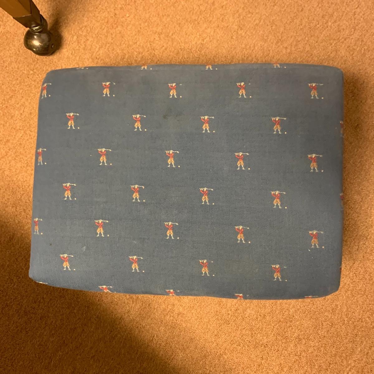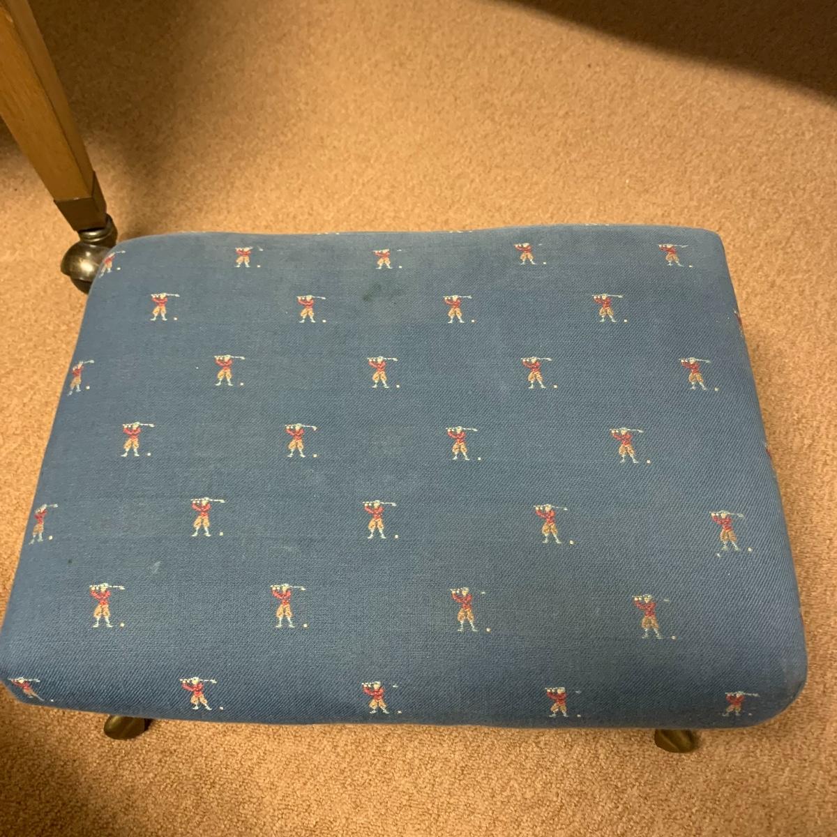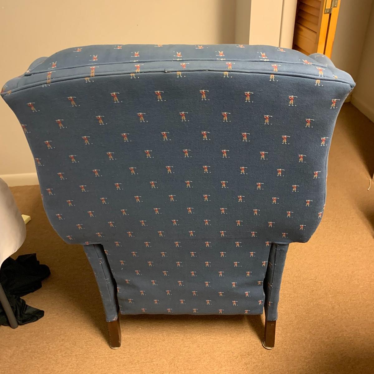 Relax after golfing 18 holes in this comfy recliner. This chair features a golf motif on a handsome navy blue background as well as a padded head rest. The chair reclines nicely and a foot stool is included. However there are a few stains that possibly could be steam cleaned out. The measurements are 33” wide X 41” tall X 36” deep. See pics for details and condition. Please bring help to move this item