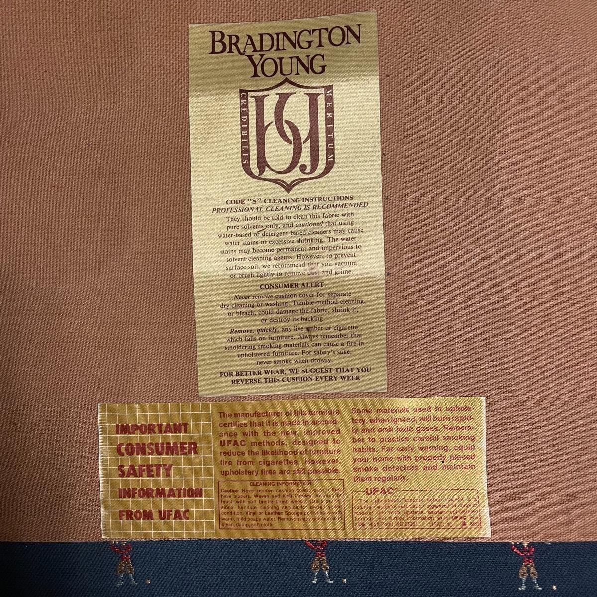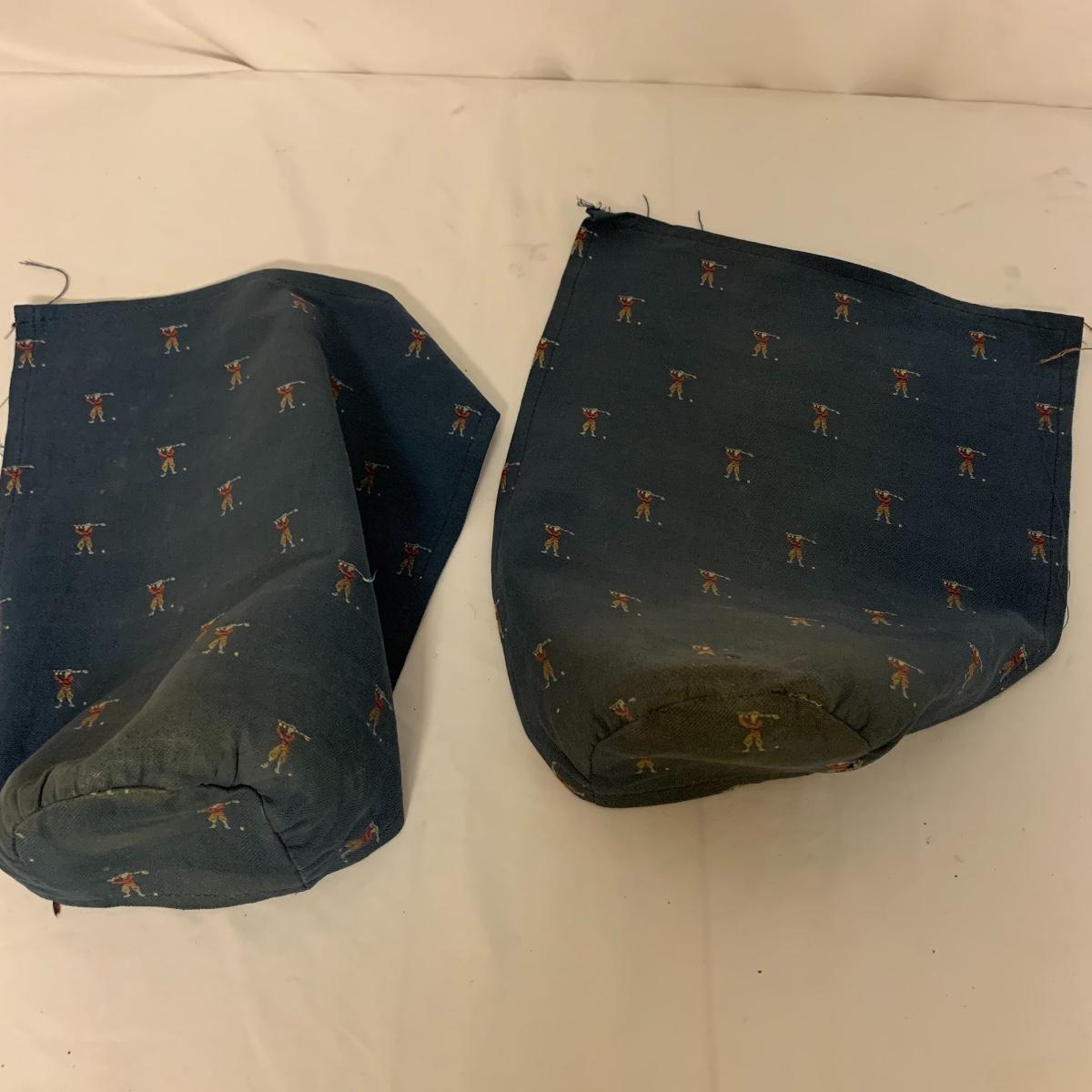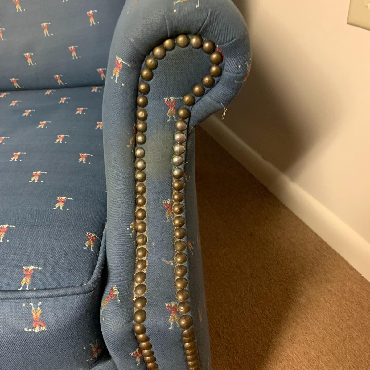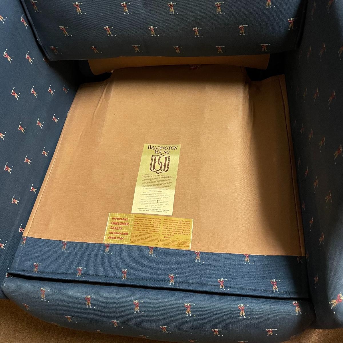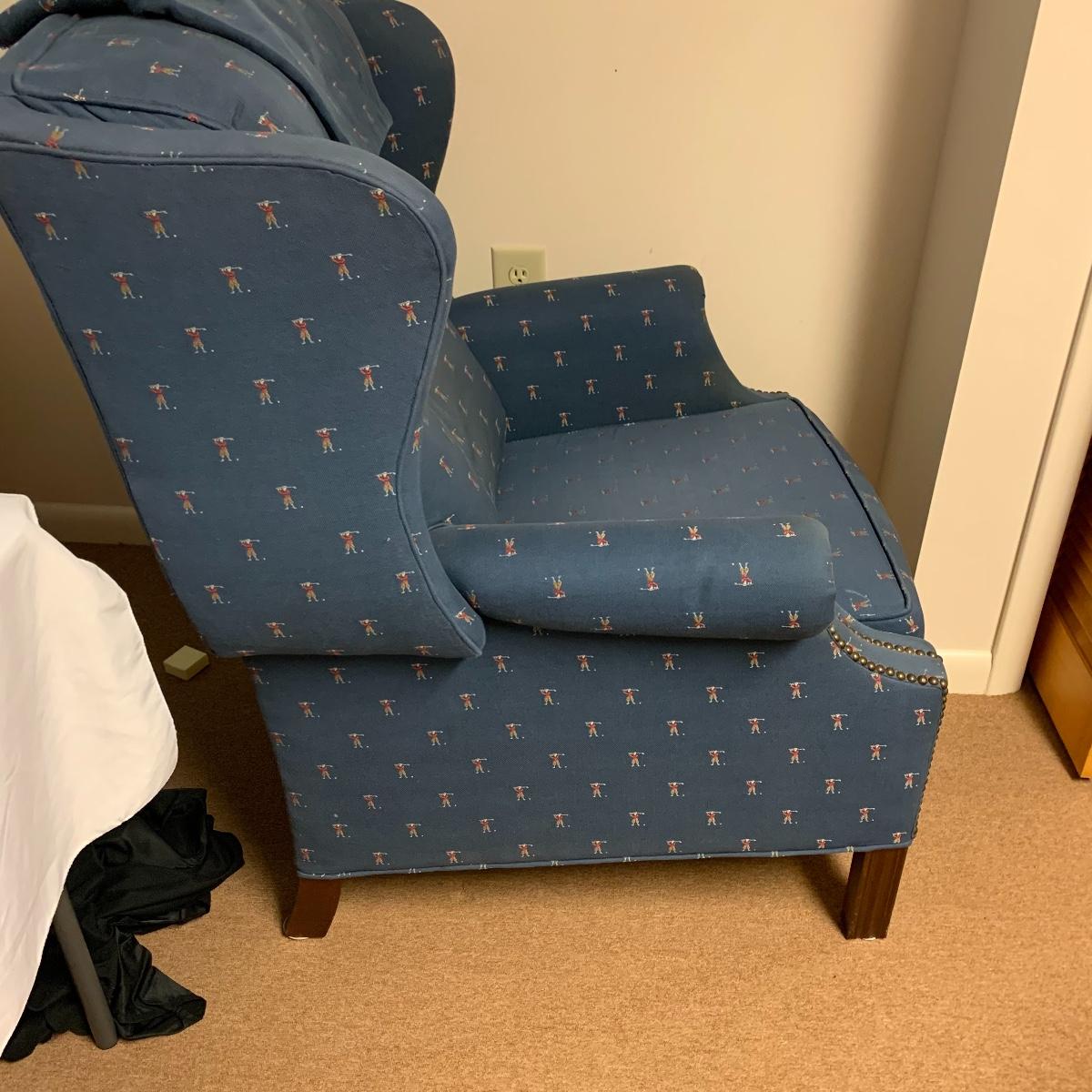 Relax after golfing 18 holes in this comfy recliner. This chair features a golf motif on a handsome navy blue background as well as a padded head rest. The chair reclines nicely and a foot stool is included. However there are a few stains that possibly could be steam cleaned out. The measurements are 33” wide X 41” tall X 36” deep. See pics for details and condition. Please bring help to move this item