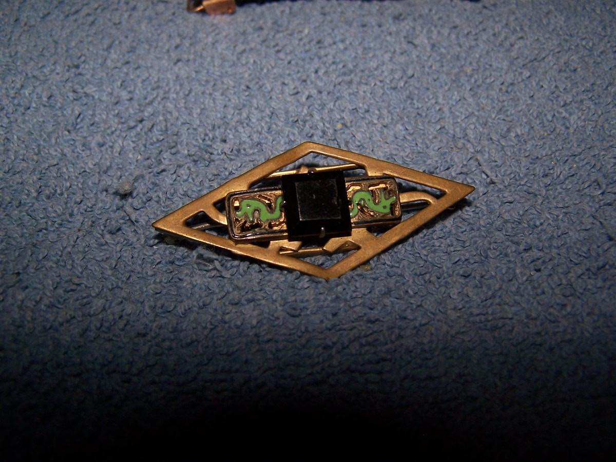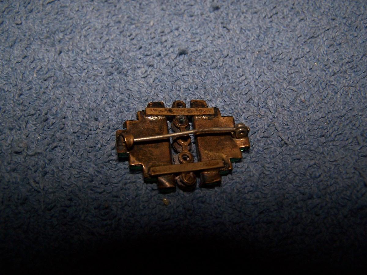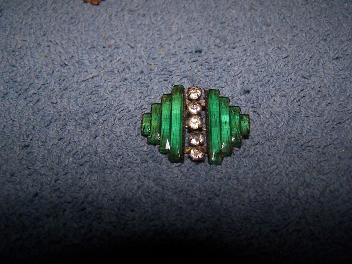 THIS IS SOME GRAND OLD JEWELRY!!! UNMARKED.. ART DECO, GREEN GLASS, PIN IS 7/8'' X 1 1/4''. LIGHT WEAR..