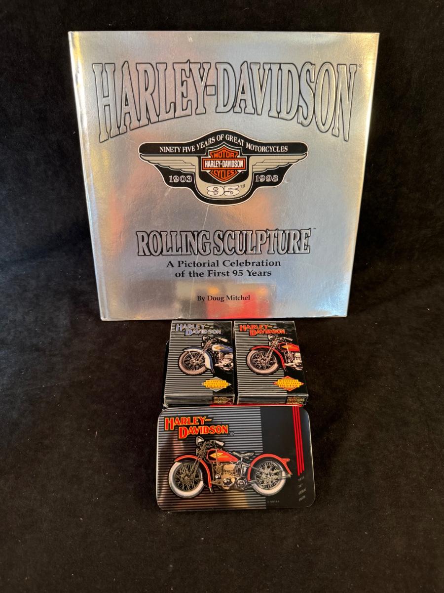 Includes Harley-Davidson Rolling Sculpture book and 2 decks of brand new Harley-Davidson playing cards with metal tin