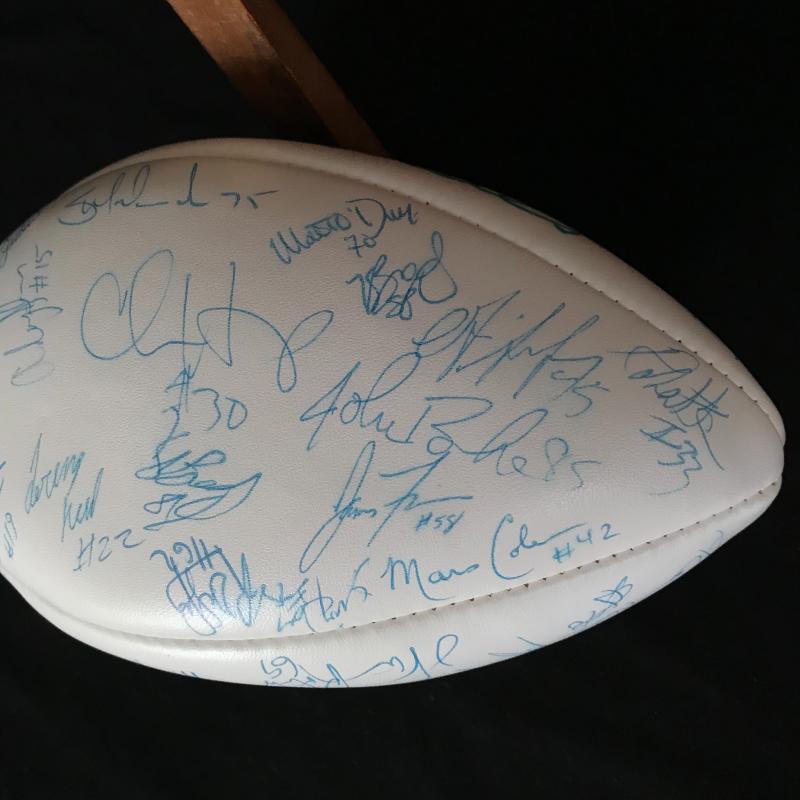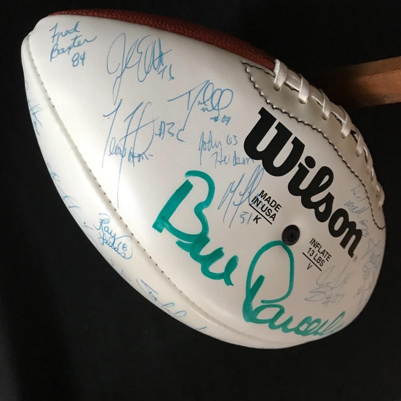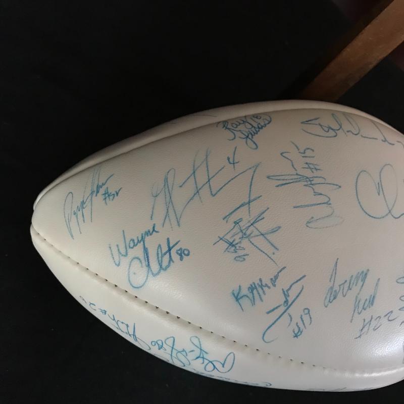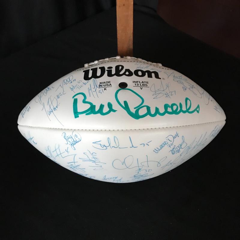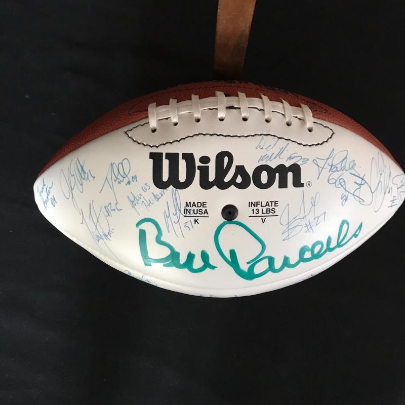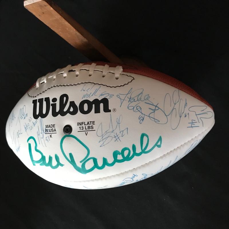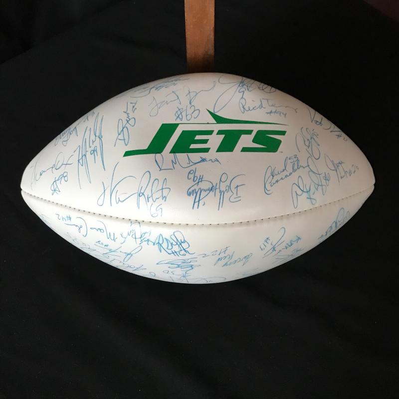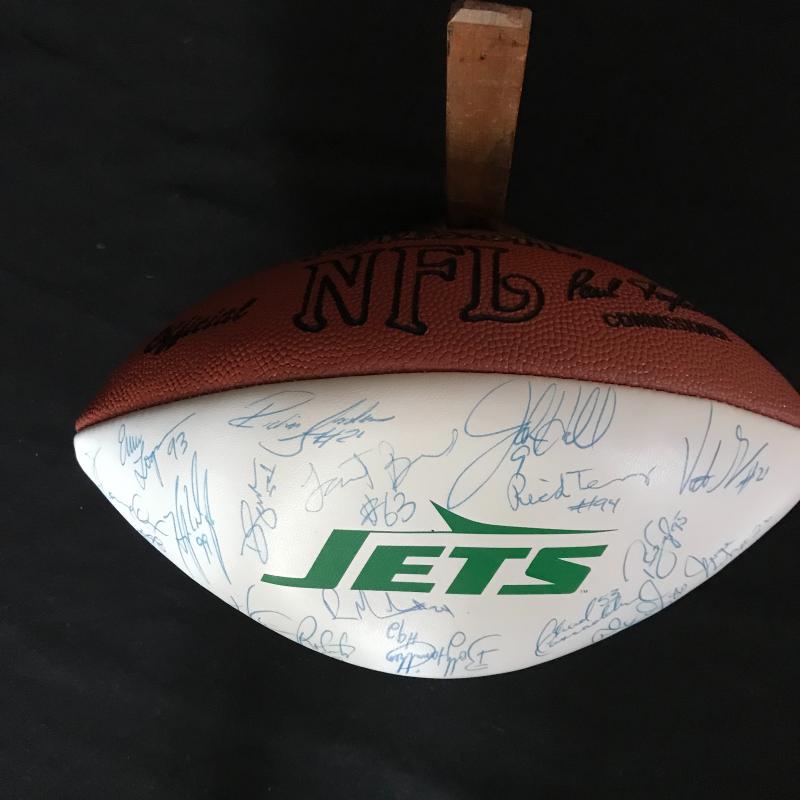 Full sized Wilson Jets’ football signed by Coach Bill Parcells and team. ST team could not locate a date of signing, but probably sometime 1997-2000. See and enlarge photos for signatures. Not authenticated. Stand In photos is not included. Shipping available.