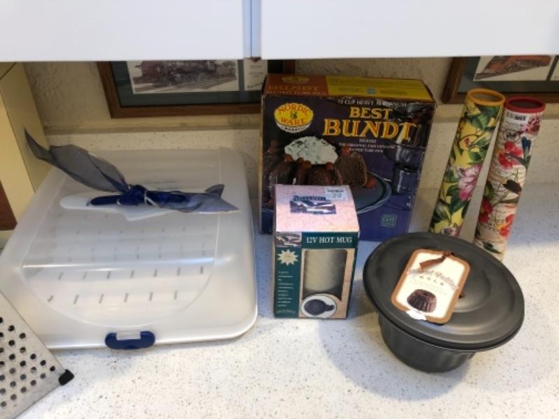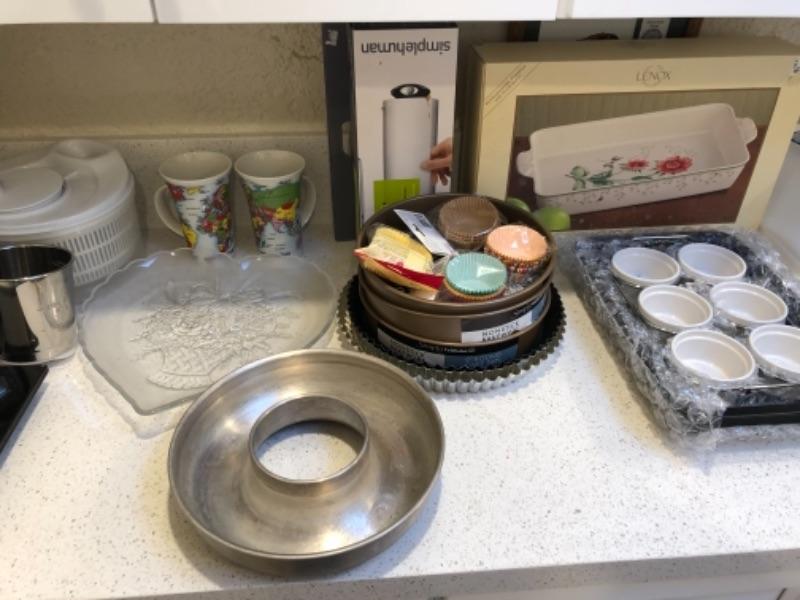 Lot 60. Digital kitchen scale, sifters, salad spinner, new cake pans, cupcake papers, mugs, paper towel holder, tart pans, custard cups, pan rack, Lenox casserole dish, cheese grater, cake carrier, travel mug, bundt cake pan, fireplace matches, etc.--WAS $65““NOW $48.50