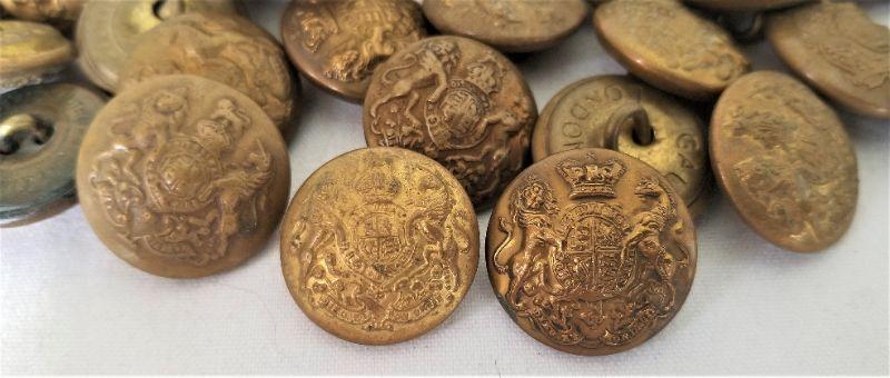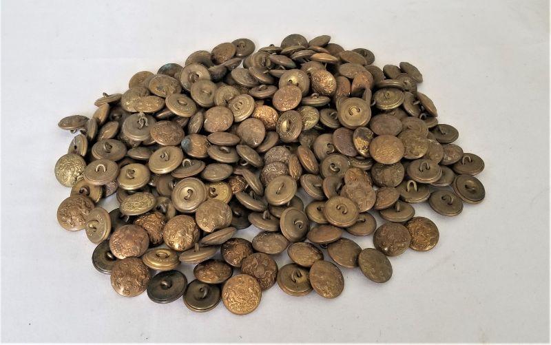 These vintage military coat buttons appear to all be the same style - made in England by Gaunt of London or a Birmingham (UK) firm. Brass with shank on the back. You get this entire pile. These routinely sell on ebay for $3-4 each.