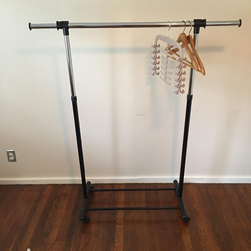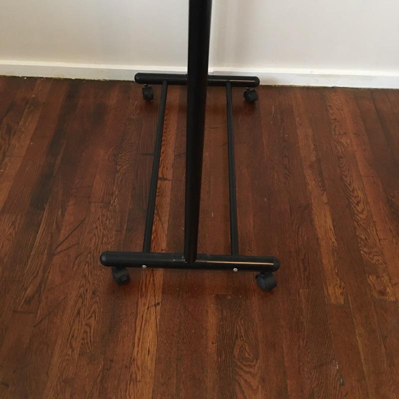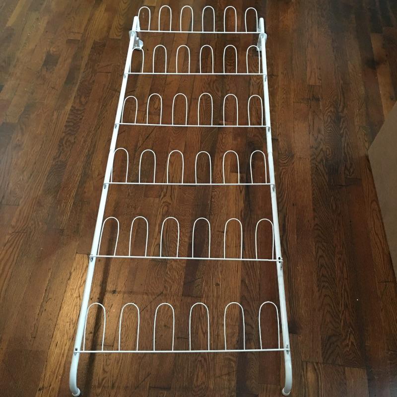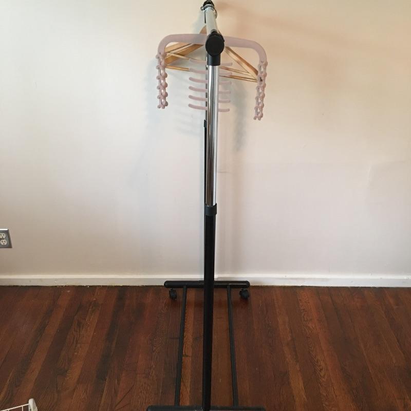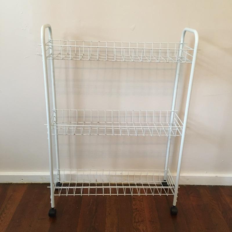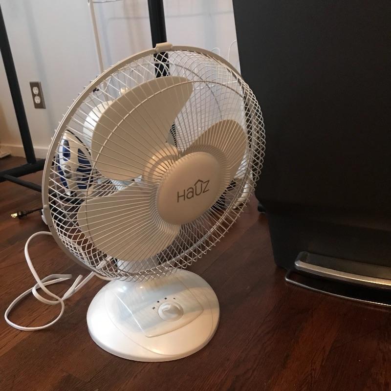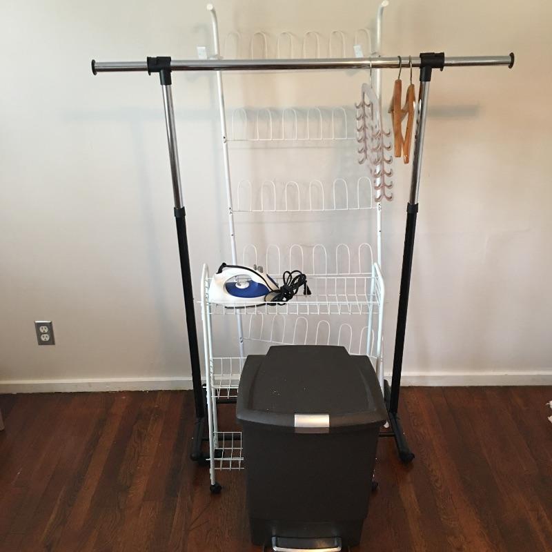 These laundry and home essentials includes rolling clothes rack, door shoe rack, rolling three tray cart, garbage bin and iron. Lot also features an 18” oscillating tabletop fan by Hauz. The fan works when tested, but appears to need some sort of adjustment in order to tilt the fan head to a neutral or higher angle. It is currently facing slightly downwards , see photos.