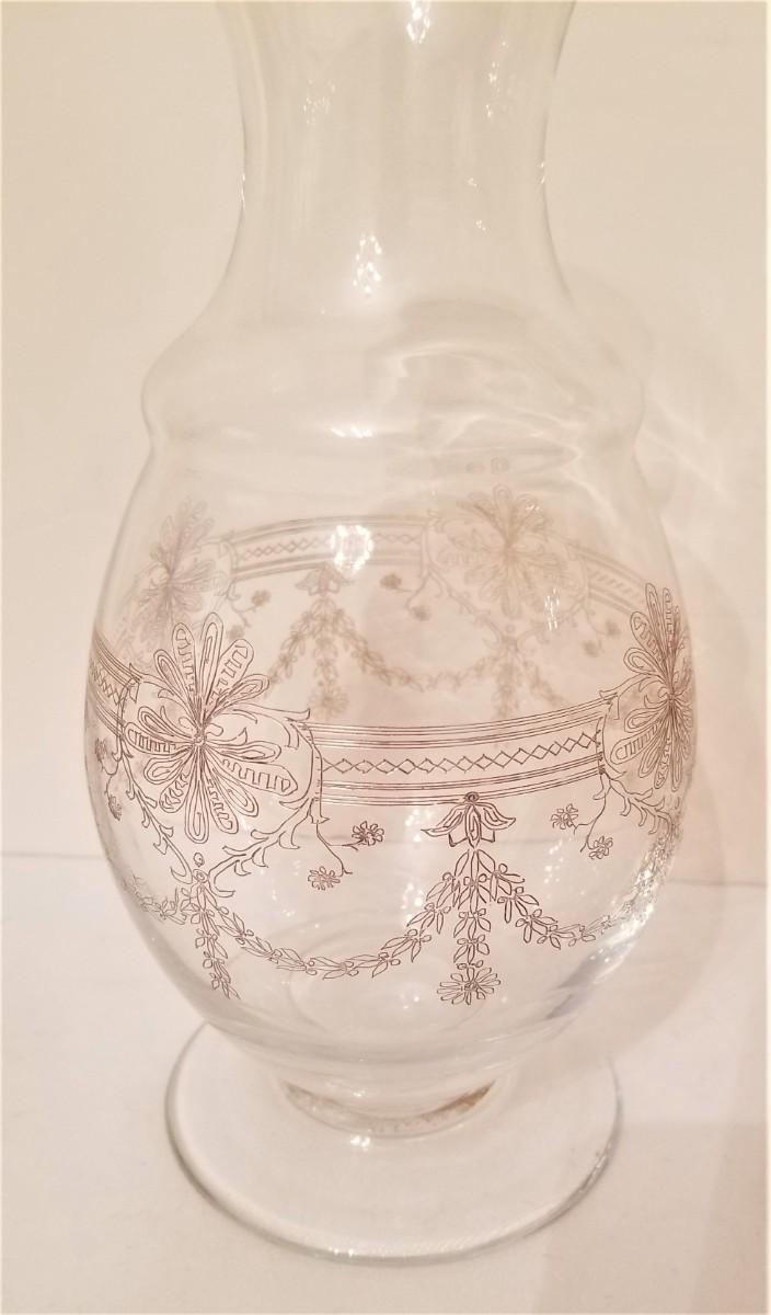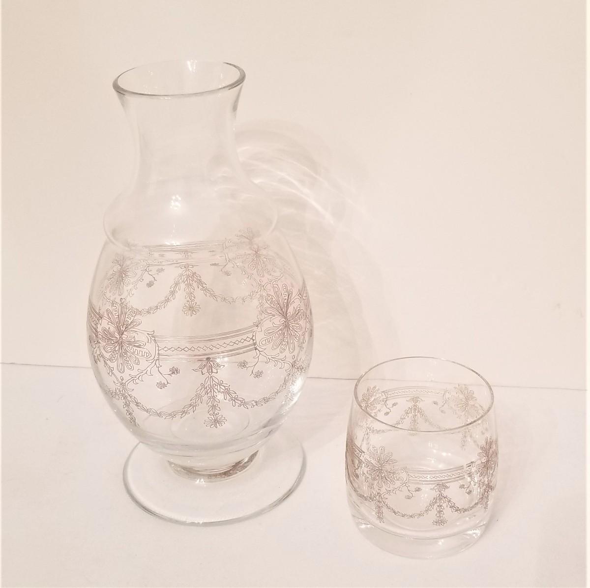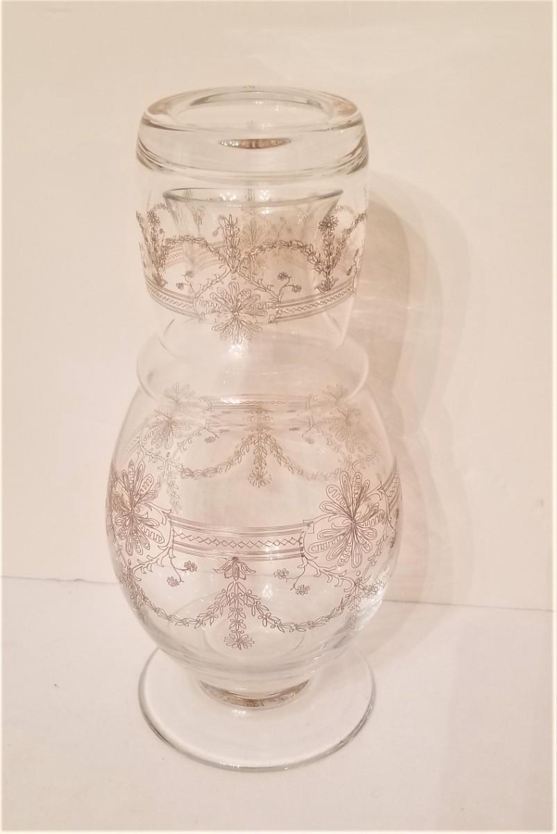 This pretty thing is meant to serve as a nighttime water carafe in a guest room (usually referred to as a "topsy turvy" - the drinking glass sits inverted on the top. This is a large, beautiful example and it's in excellent condition. 9.75" tall.