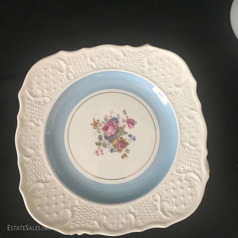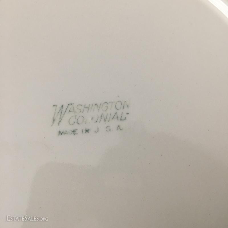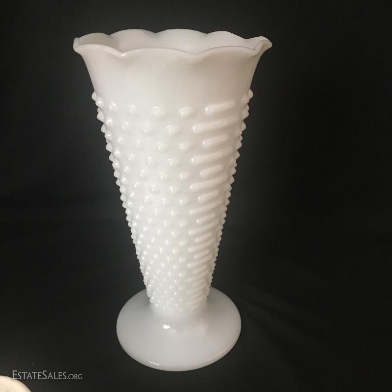 Tall white milk glass vase measures 9.5" tall. 8 Desert plates are matching but 4 have a blue stripe and 4 have a pink. They are Washington Colonial. In good condition. This lot is available for shipping or local pick up in adheville, NC.