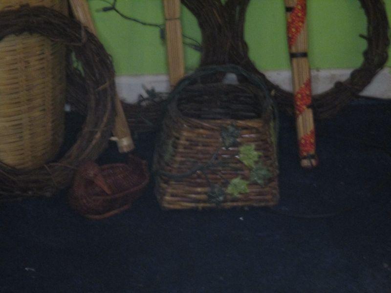 Tall wicker basket, three grapevine wreaths, 3 brooms, duck basket, and a rectangular basket. All in very good condition