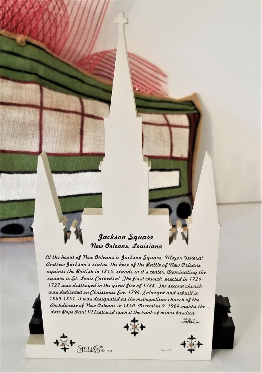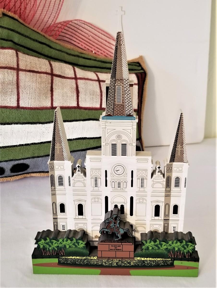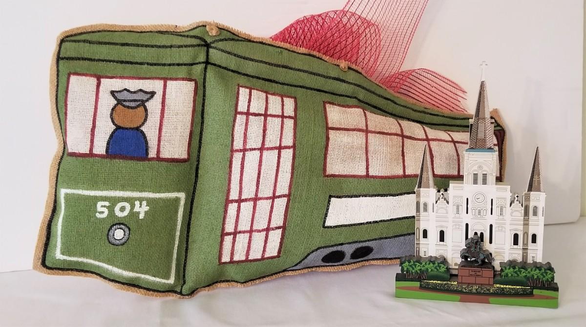 Cute gently used "puff" New Orleans Streetcar door decoration and a large Sheila's St. Louis Cathedral sculpture. Door decoration is about 21" long, Cathedral measures 9.75" tall (it's like new).