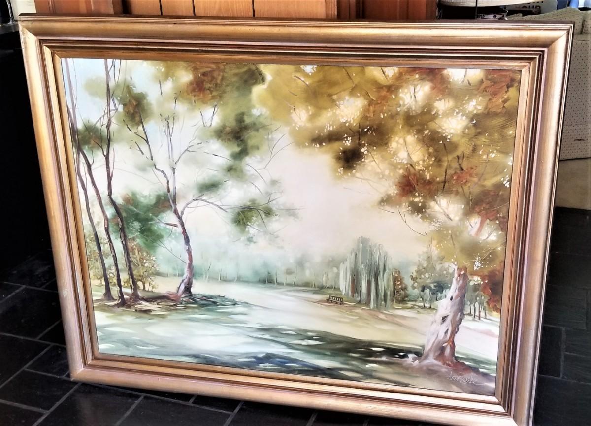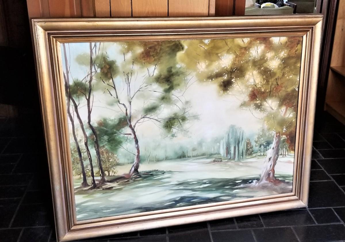 Large (56.6" across - 44.5" tall) original oil on canvas painting by Louisiana Listed artist Gretchen Armbruster, known for her landscapes and portraits. Good condition.