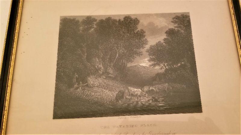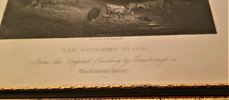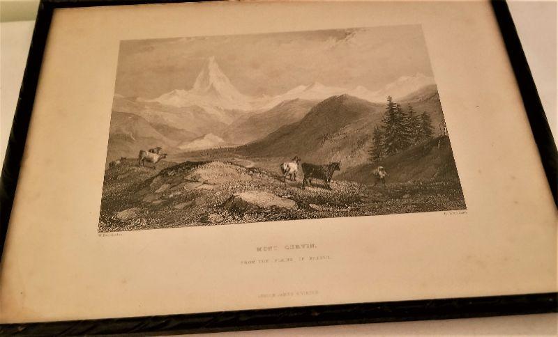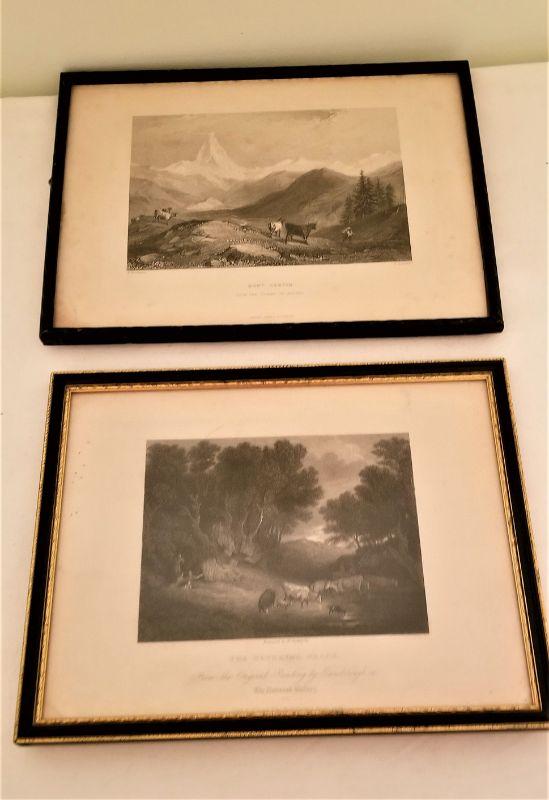 Nice pair of 19th century English engravings - first is "The Watering Hole" from the original by Gainesborough in the National Gallery (London) - engraved by W. Raddclyffe - some dust under glass in one spot (see photo). The other is "Mont Cervin - from the plains of Brieul" Engraved by W. Brockedon and R. Brandard - London" James S. Virtue. One measures 8.5" x 11.5" - the other 11" x 8.75." Antique condition.