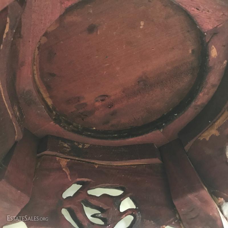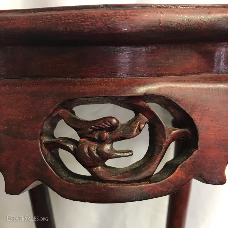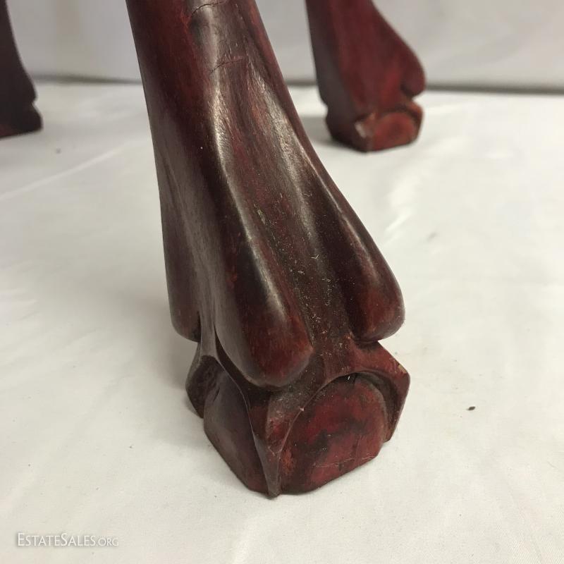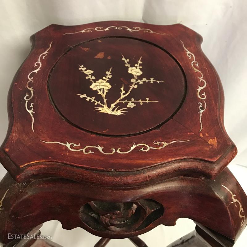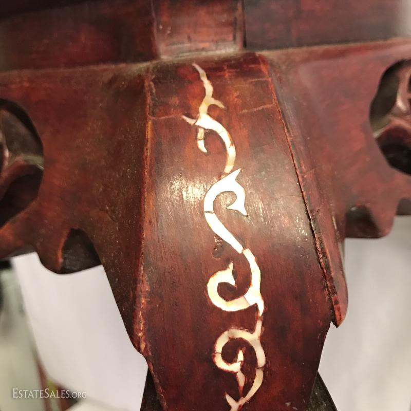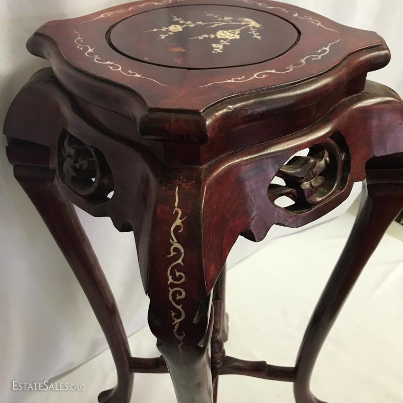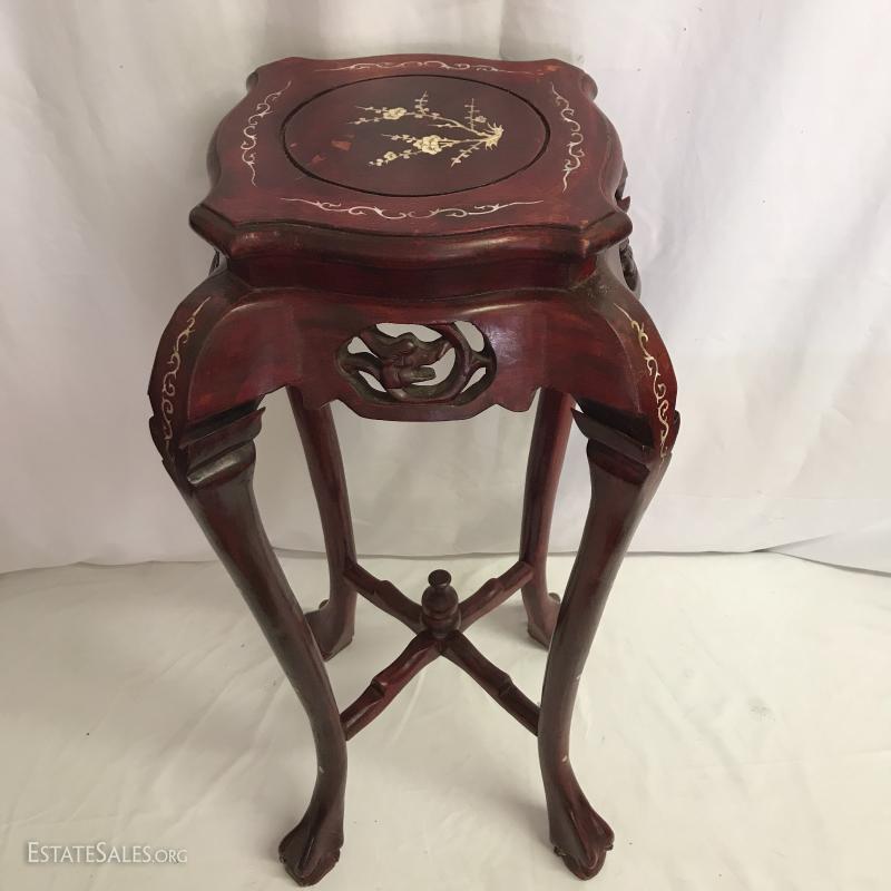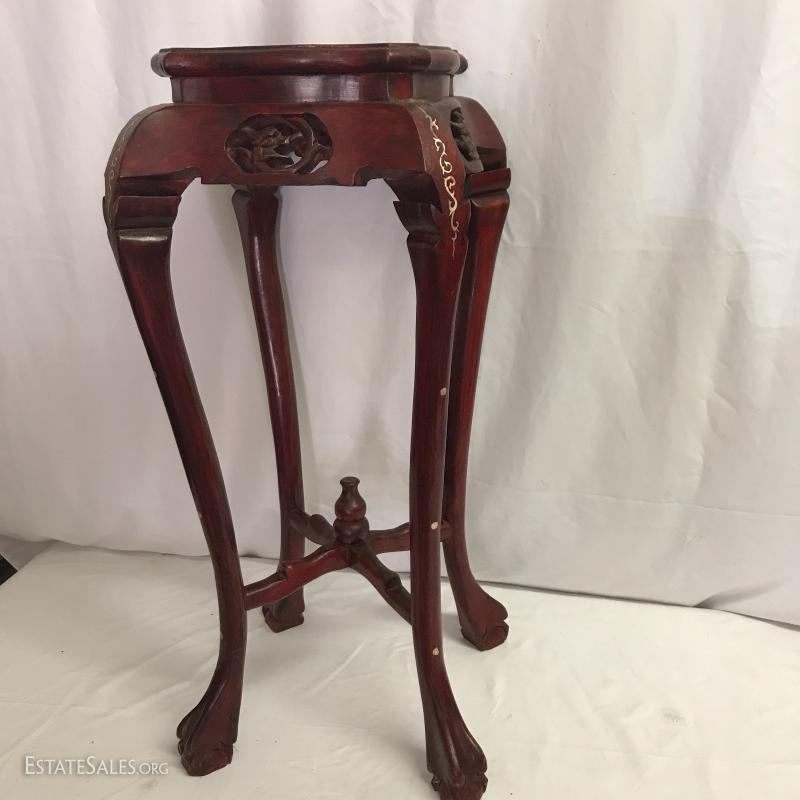 Nice red plant stand with claw feet and inlay design. Carved rustic look. 15"l x 15"w x 32" h.