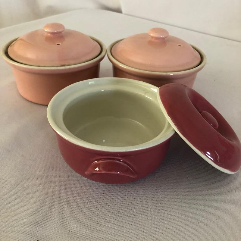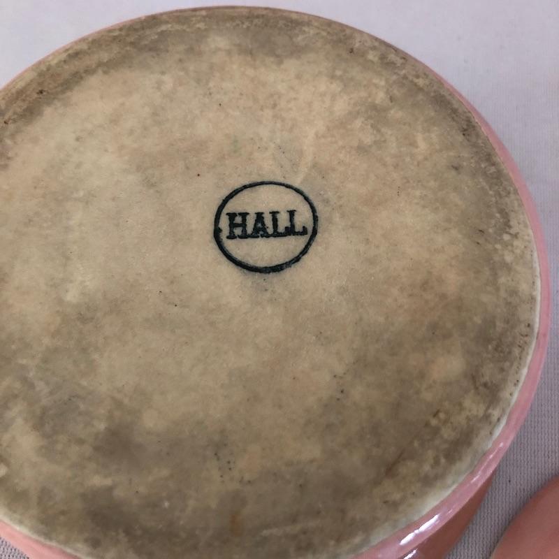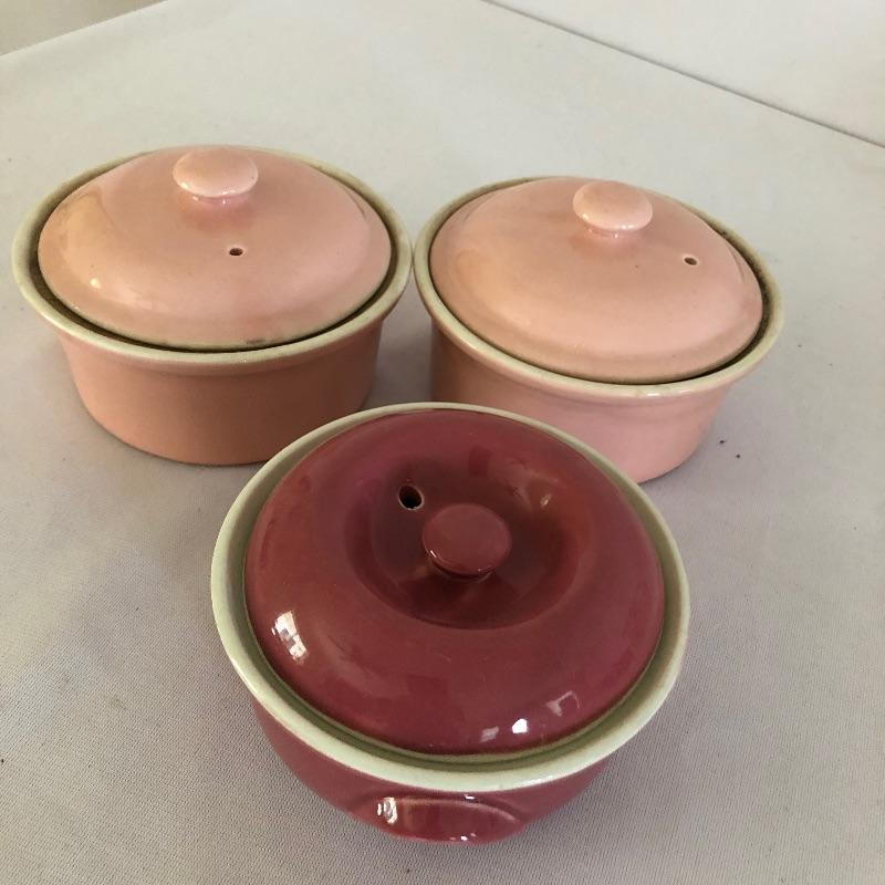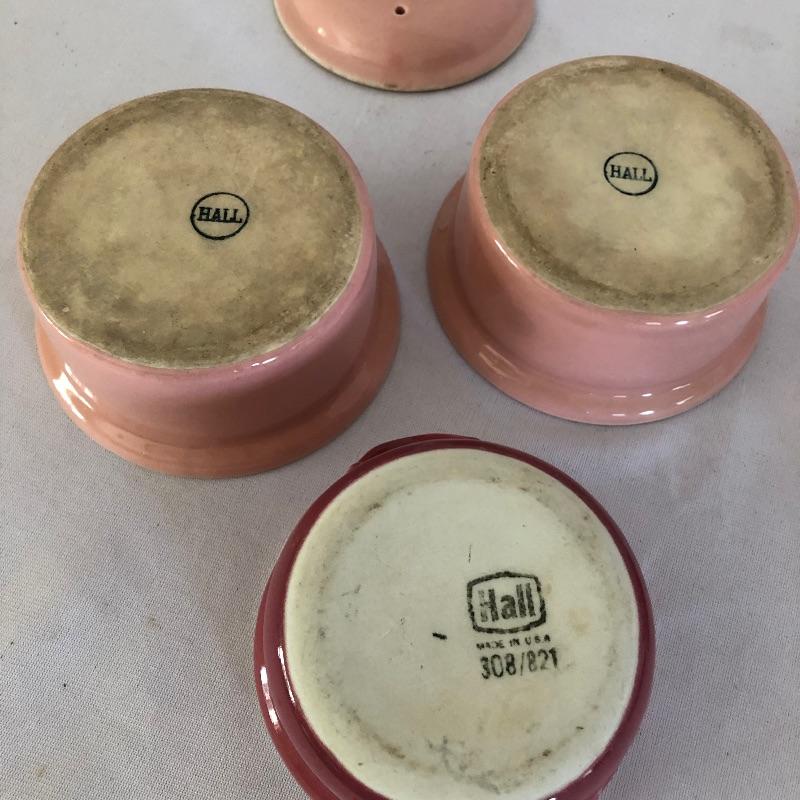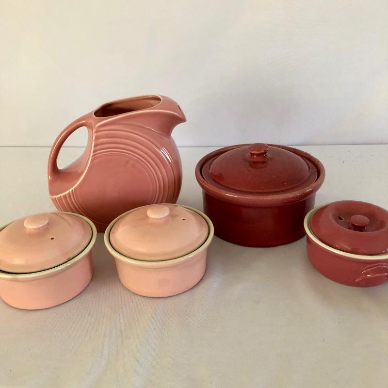 Shade of dusty pinks in this attractive assortment of durable crocks. The pitcher is Fiesta, the larger of the four lidded crocks is Weller; this pitcher has a couple of minor marks on the rim, see images. The three smaller pieces are made by Hall.
