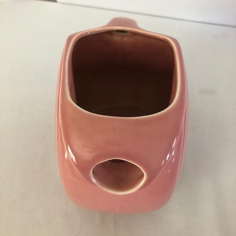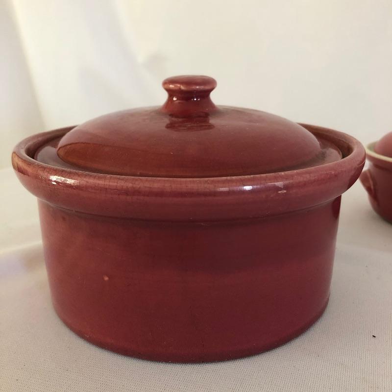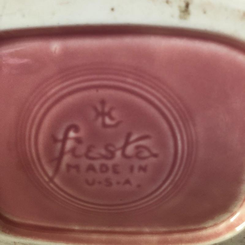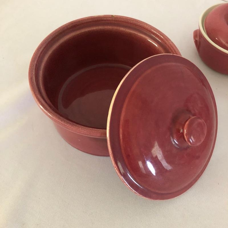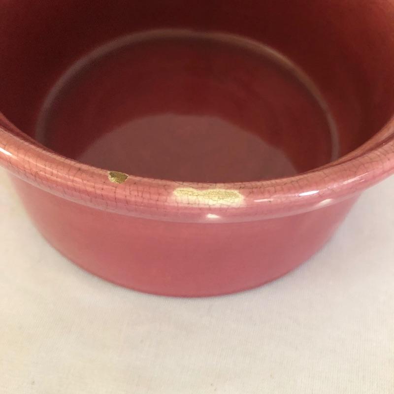 Shade of dusty pinks in this attractive assortment of durable crocks. The pitcher is Fiesta, the larger of the four lidded crocks is Weller; this pitcher has a couple of minor marks on the rim, see images. The three smaller pieces are made by Hall.