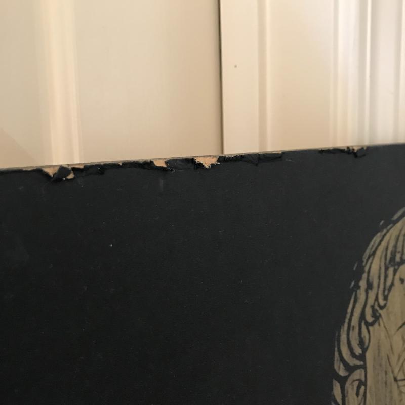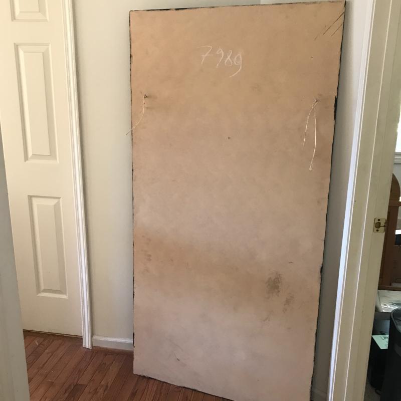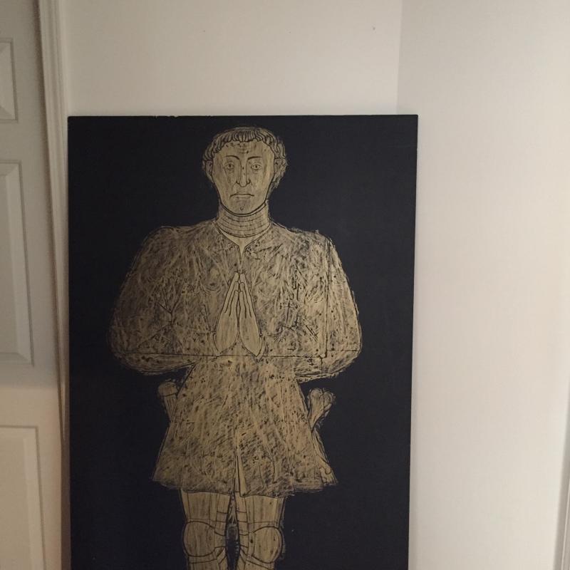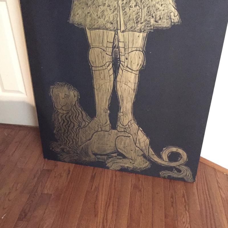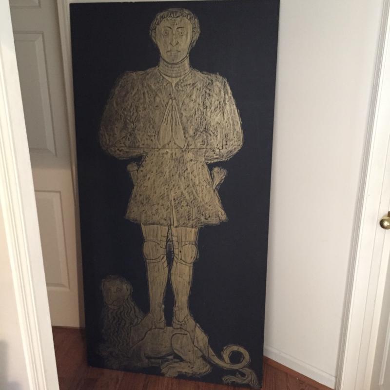 Captivating Rubbing on wood. Bronze color on black paper attached to wooden background. Paper is ripped on some edges. It would make a statement in any room. Brass rubbings are done by stretching a linen rag paper over the deeply etched monumental brass that is usually found at the gravesite. After securing the paper, heelball (a very hard wax) is rubbed vigorously over the paper surface to get an exact copy of the brass plate. A single rubbing can take from 2 hours to 2 days to complete depending in it's size, condition, and complexity. (Description taken from google) Rubbing Measures 34.5” x 68”.