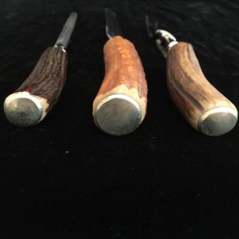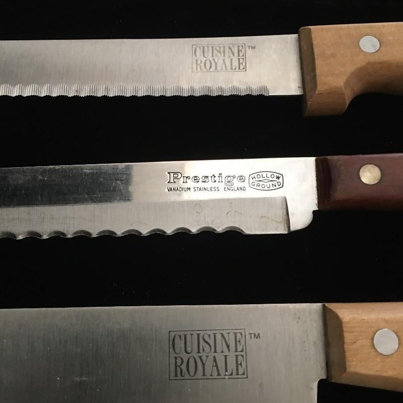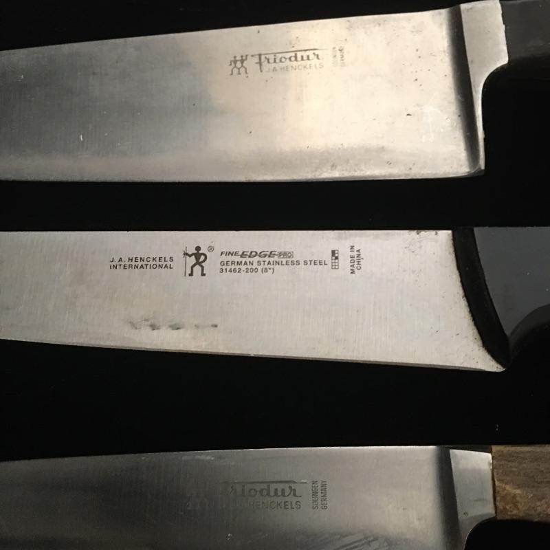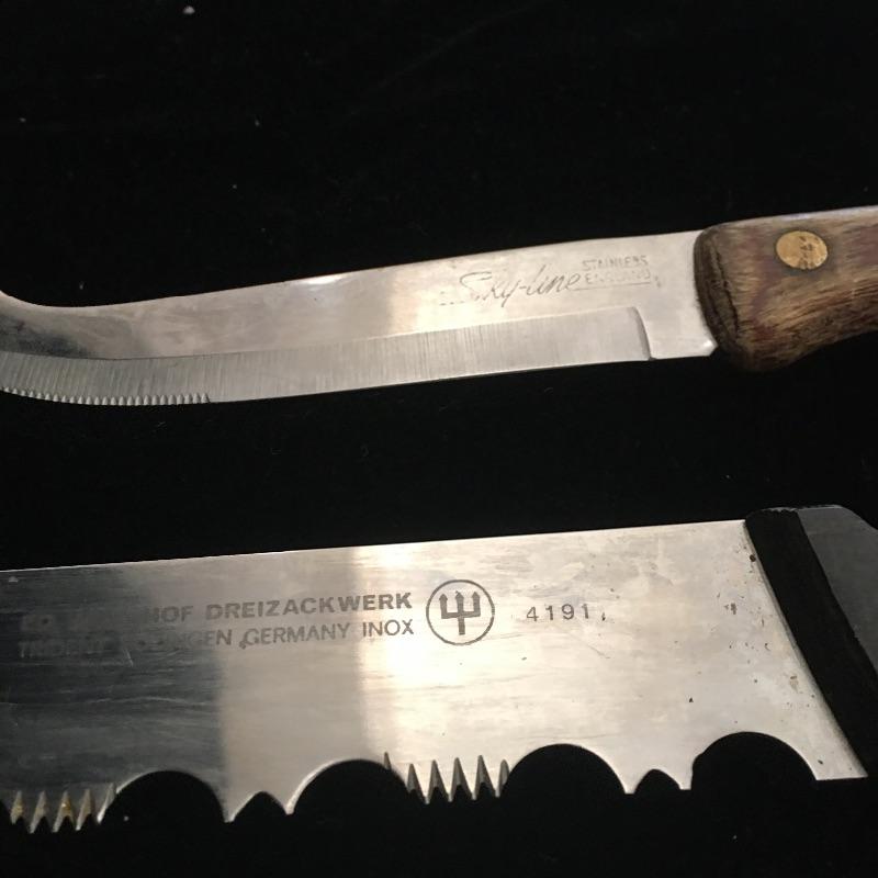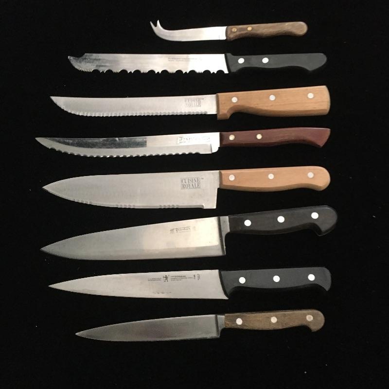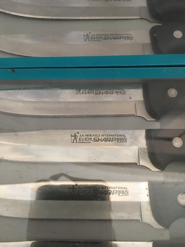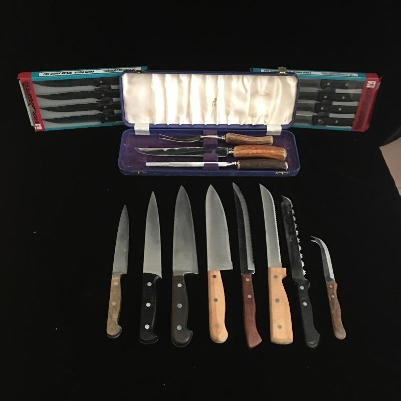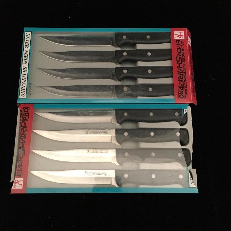 Sheffield bone carving set in case, two 4-packs of J.A. Henckels never need sharpening knives, eight knives including a J. A. Henckels knife, Wustof, and an assortment of others. Be ready for all your carving needs with this really sharp lot. Largest knife measures 13” long.