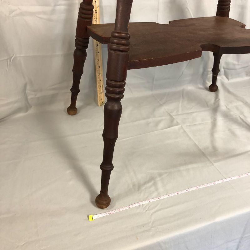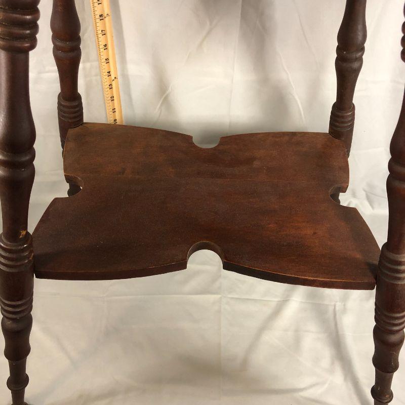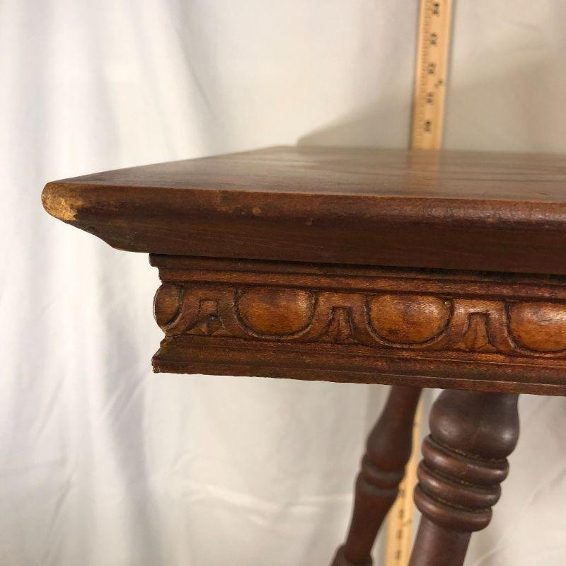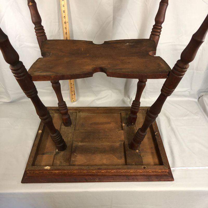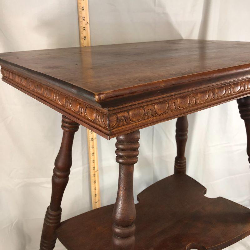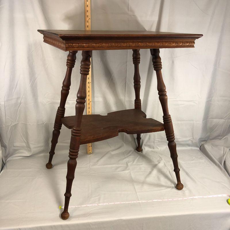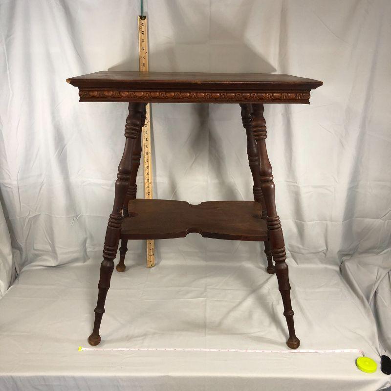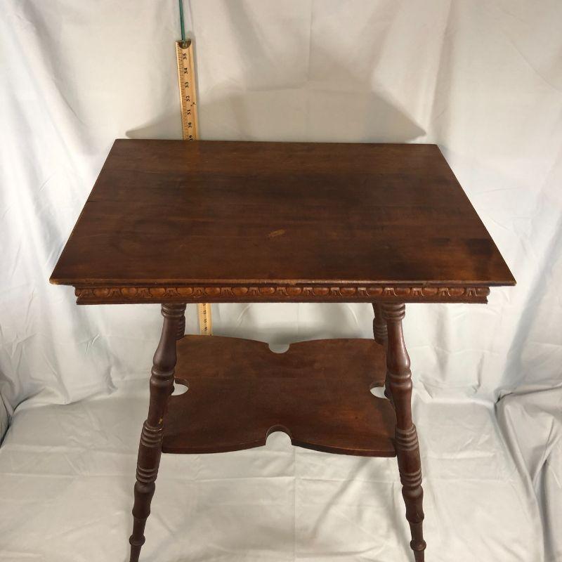 I love this table! It's rectangular (rather than the usual square top) and the trim along the bottom of the top is elegant and not over done. Then there is the piece in the middle that has cut out edges - it's the little things that make a big impact! There is a corner that has lost all of it's finish, but it's isn't damage, it's just bare. There is a scratch in the top which adds to the character. Overall, the piece is in very good condition and could be placed in the home immediately (without work). The top is 24" x 17.5" and the height of the table is about 29".