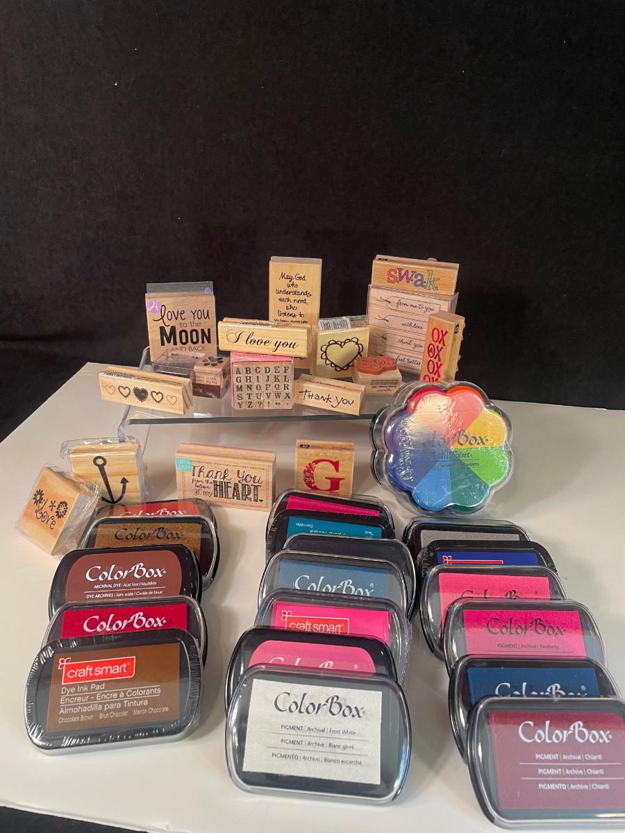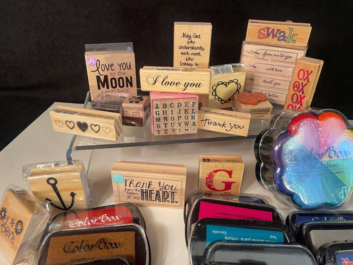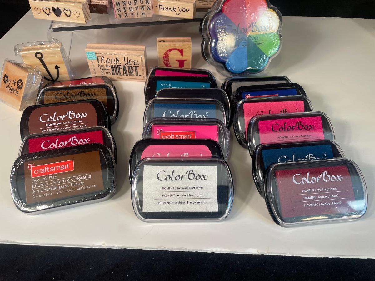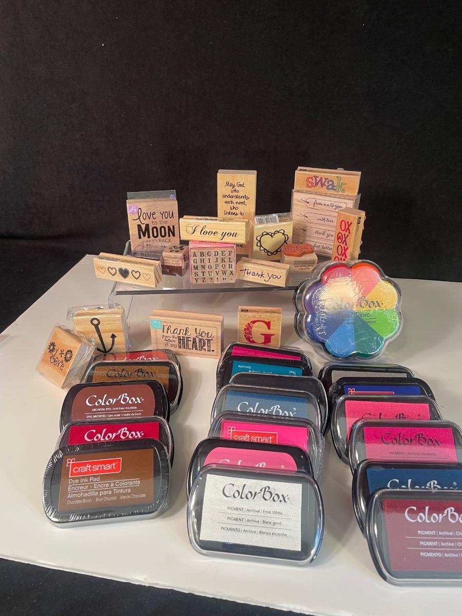 Assortment of stamps for card making and 19 colored ink pads (Most unopened)