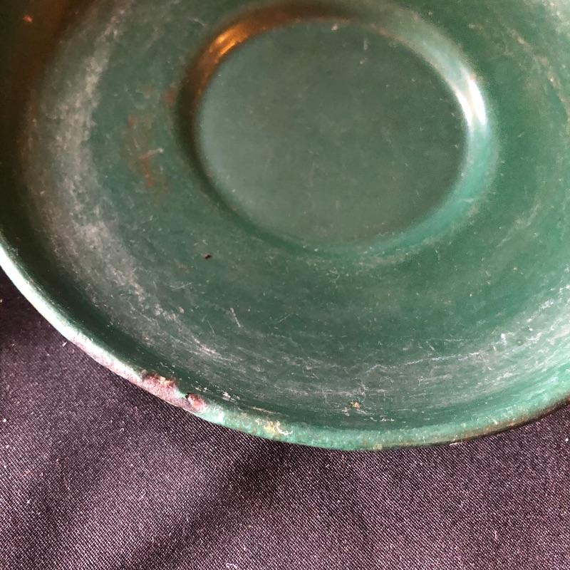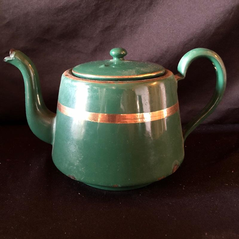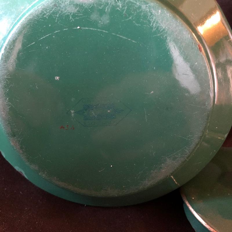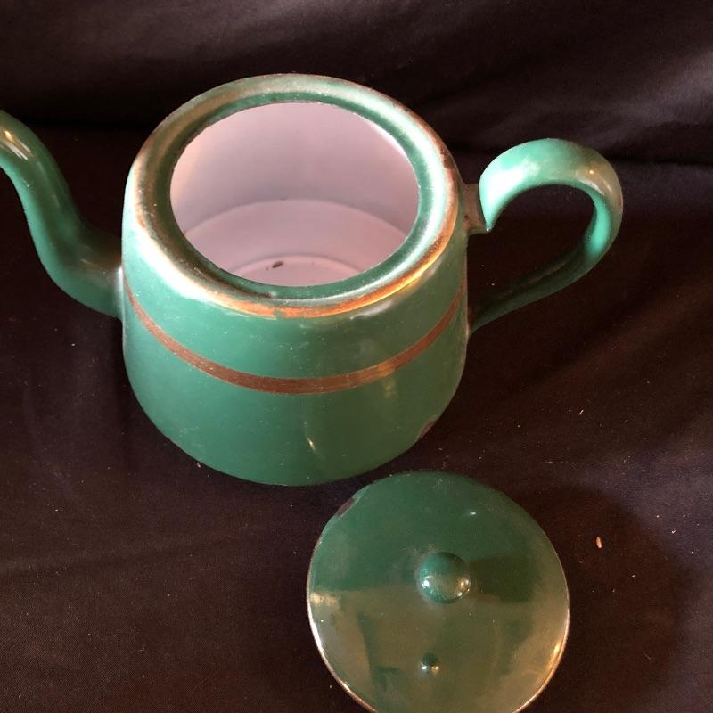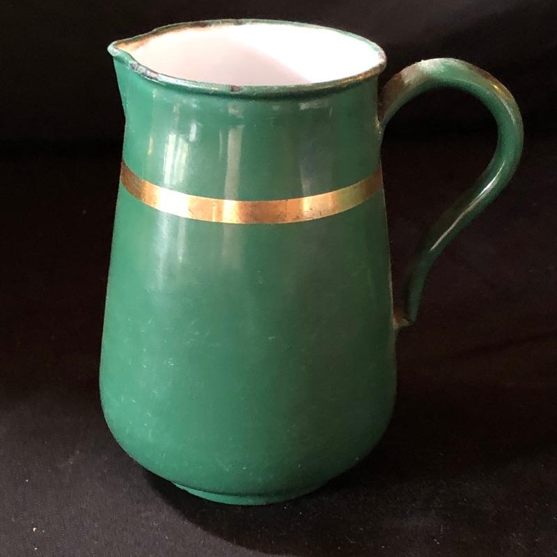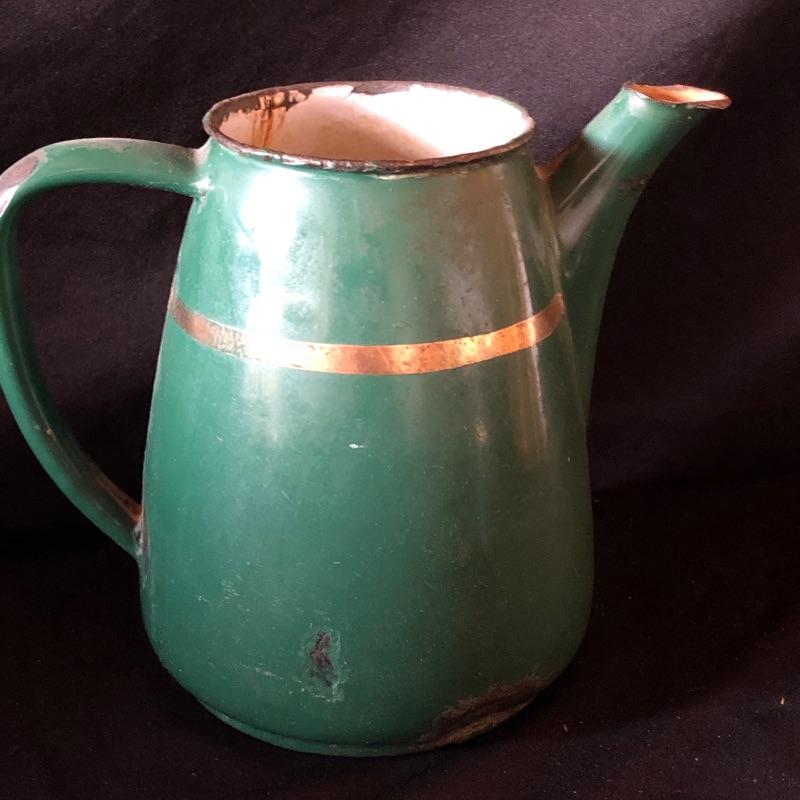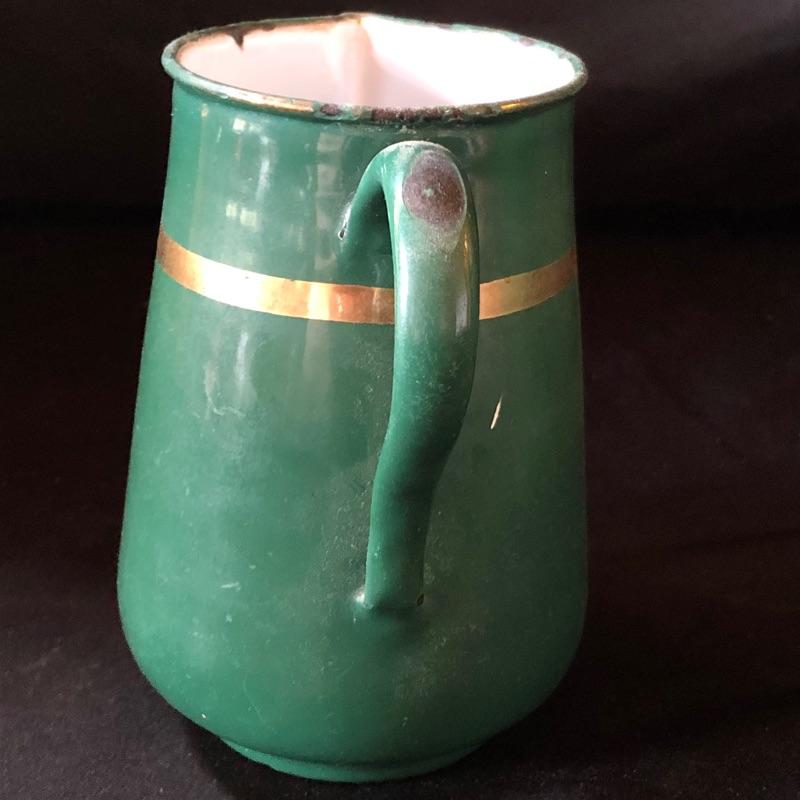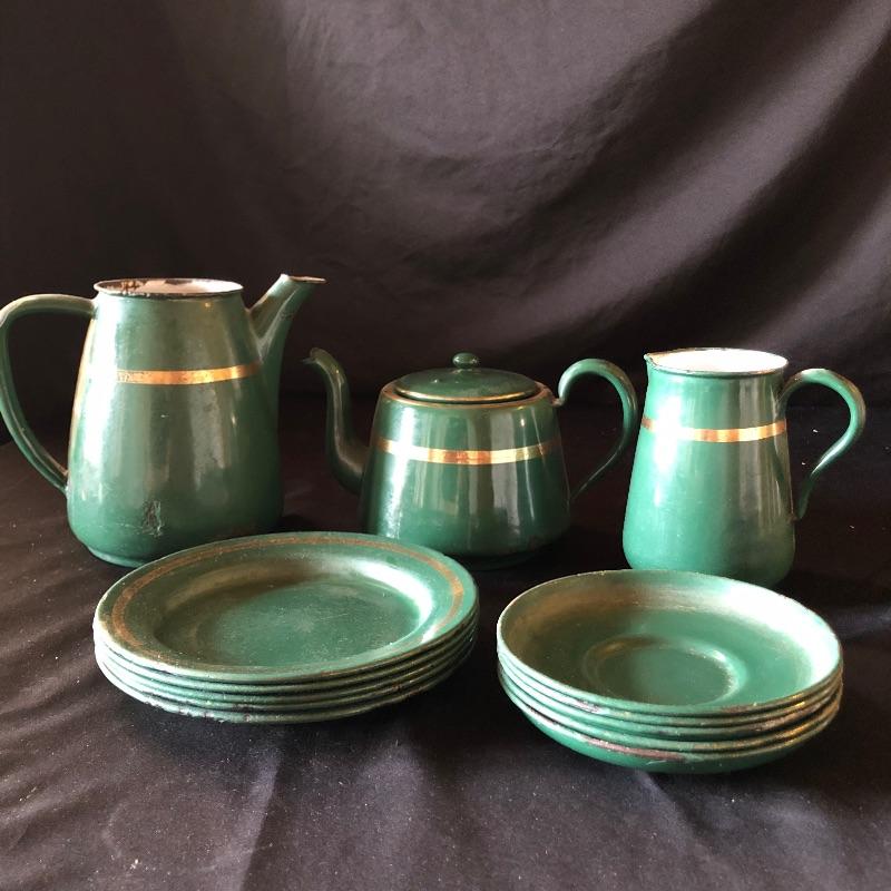 We do not come across green and gold enamel ware too often! This 22 piece set includes a teapot, medium and larger pitchers, 5 each of saucers and side plates. All pieces have some amount of rust, see images. There is a makers mark on all pieces, most of which is illegible.