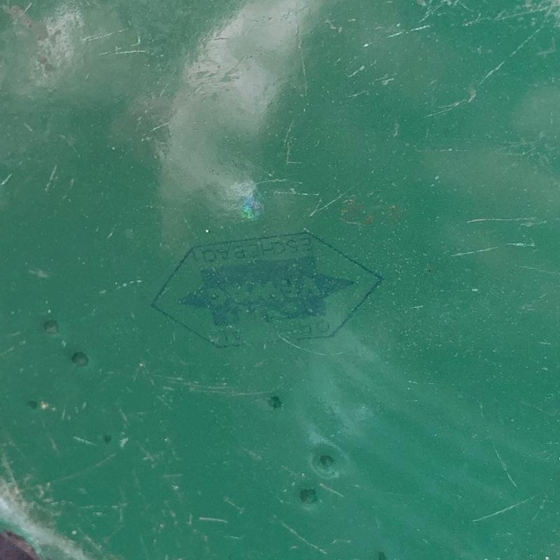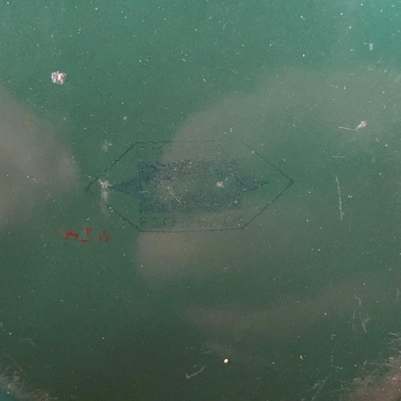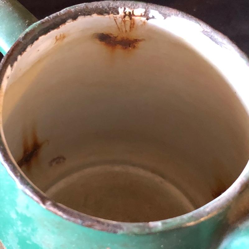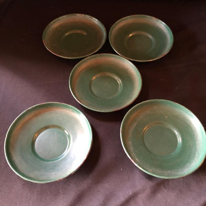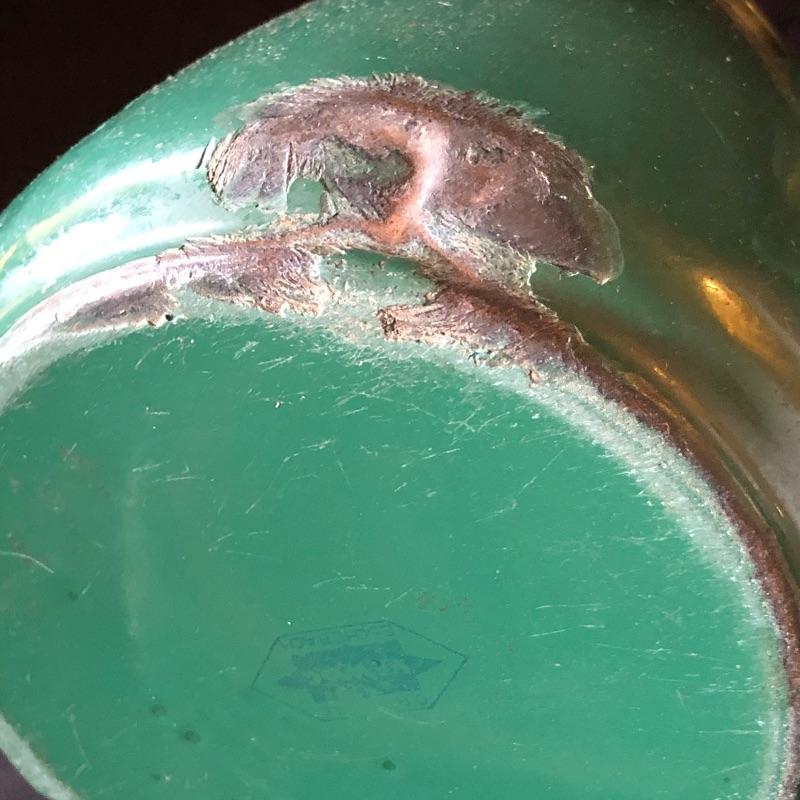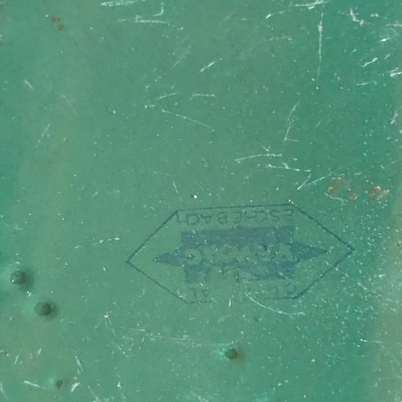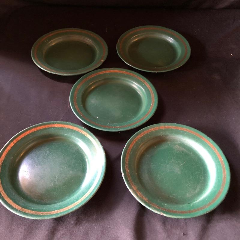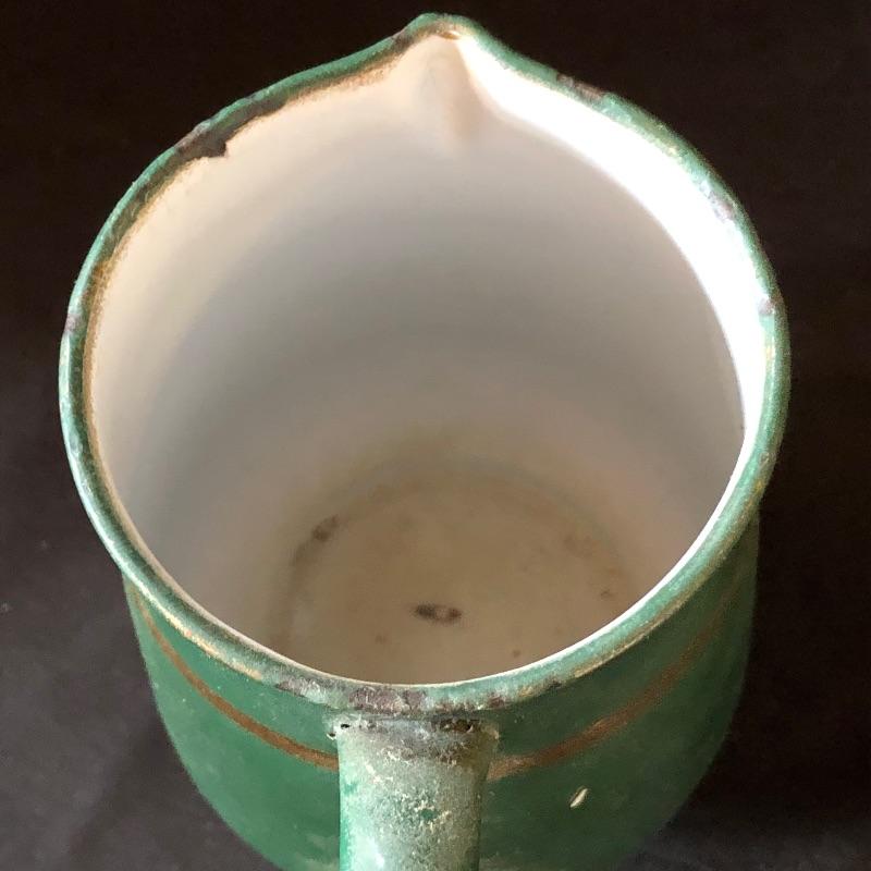 We do not come across green and gold enamel ware too often! This 22 piece set includes a teapot, medium and larger pitchers, 5 each of saucers and side plates. All pieces have some amount of rust, see images. There is a makers mark on all pieces, most of which is illegible.