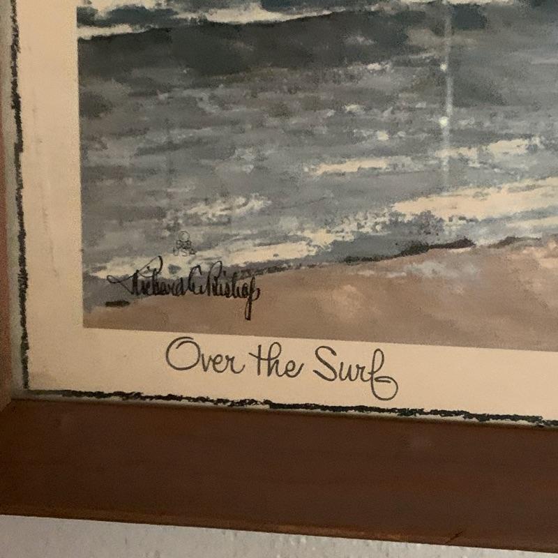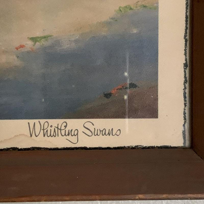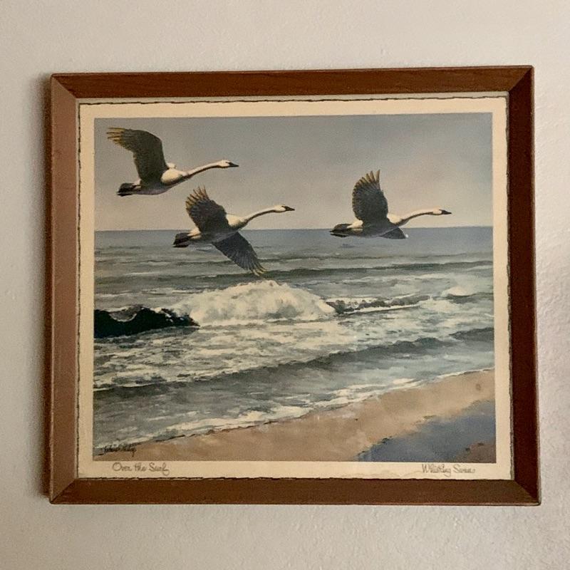 Vintage MCM print, "Over the Surf, Whistling Swans" by Richard E. Bishop. Wooden frame, measures 16 1/4" x 14 1/2." Some wear typical for age. Bottom right front shows possible water stain. Backing has been removed.