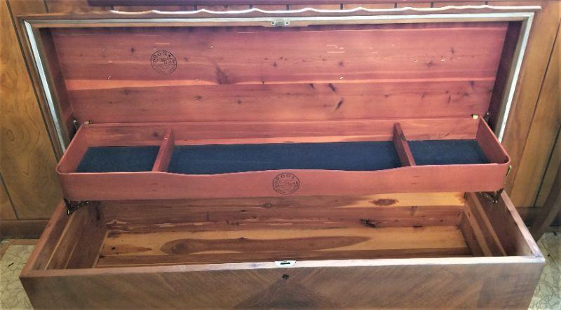 This is a nice one - vintage Roos Sweetheart Cedar chest - super clean inside - push button latch works fine (no key). Removeable inside tray. Only a bit of age-related wear to outside - looks good. 47.5" long, 19" deep, 21" tall. Probably 1940's.