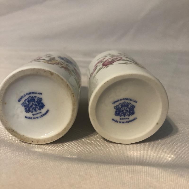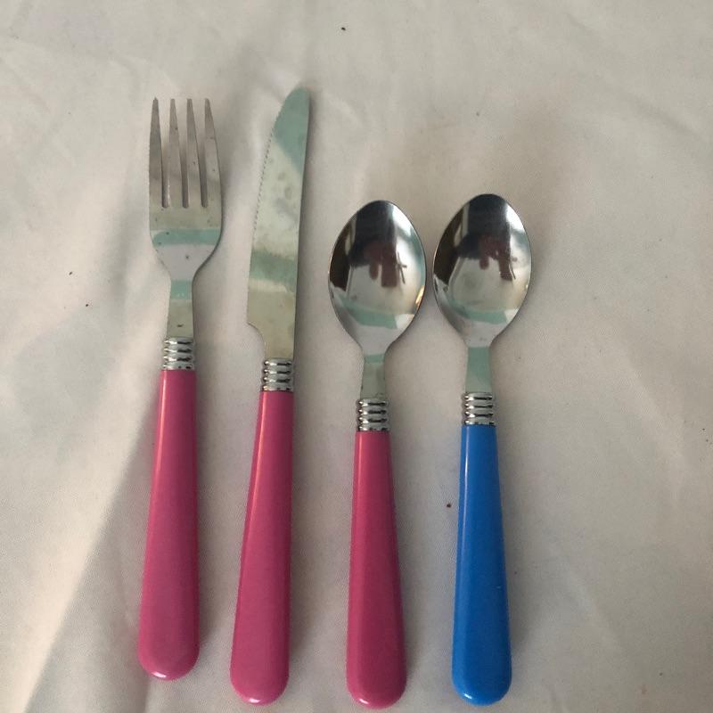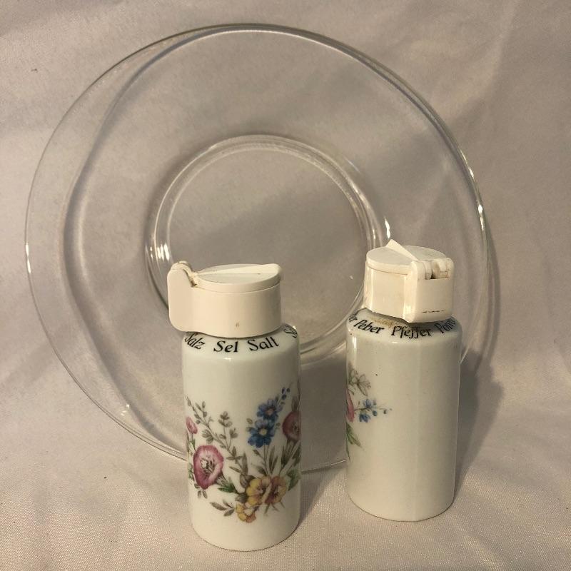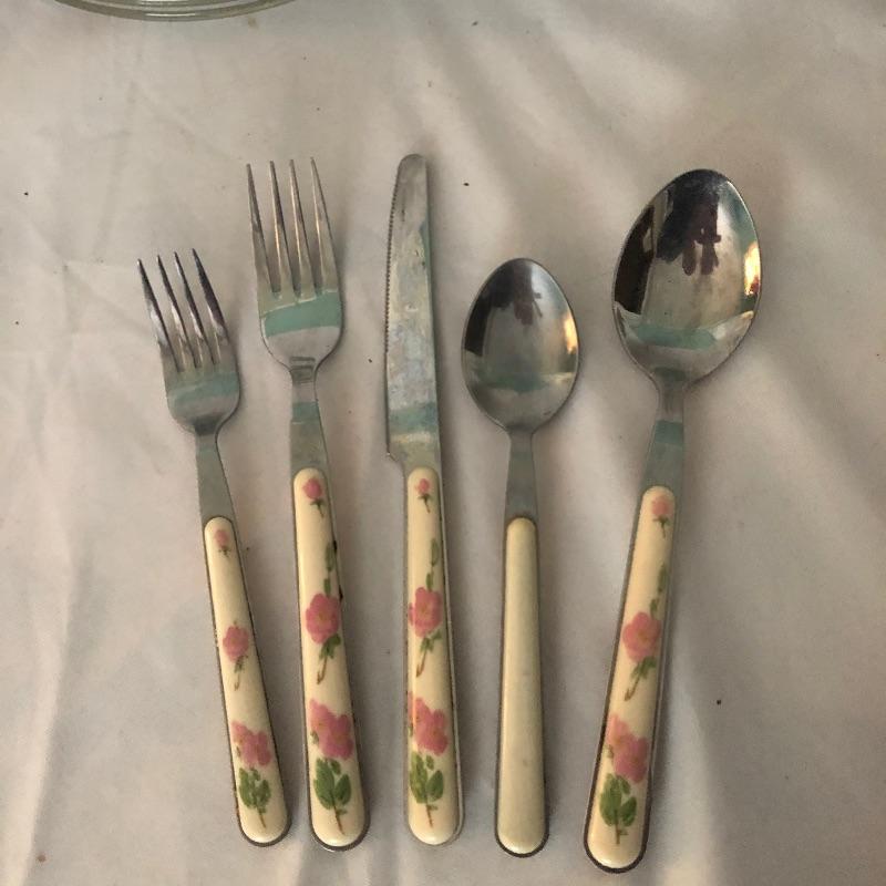 Kitchen accessories include seven 8” clear glass plates, five slightly smaller clear glass plates and two 7” plates of the same style. The silverware is Franciscan stainless steel with a floral patterned handle and consists of eight salad forks, five dinner forks, seven large spoons and four small spoons. Small spoons lack the floral pattern. In addition are an assortment of four small utensils in pink and blue. The Gerold-Porzellan salt and pepper shakers are white with floral patterns. Each has a slightly damaged plastic top.