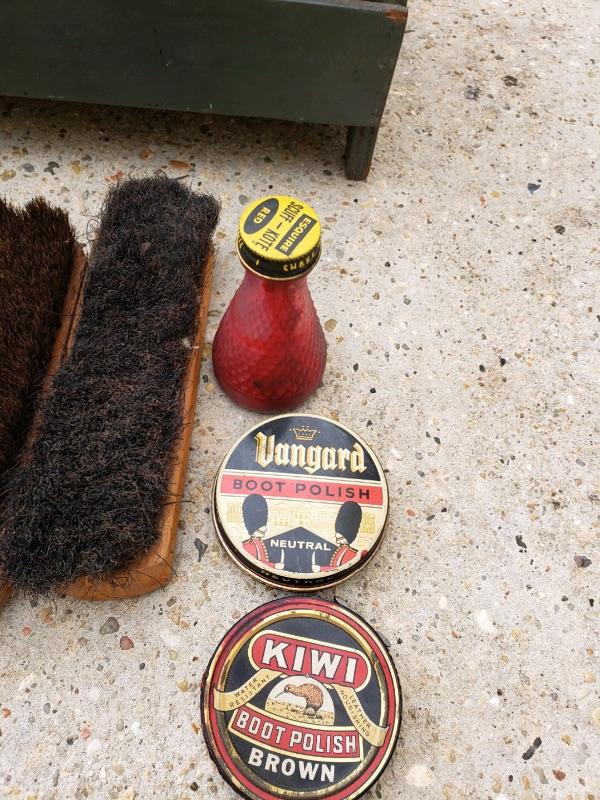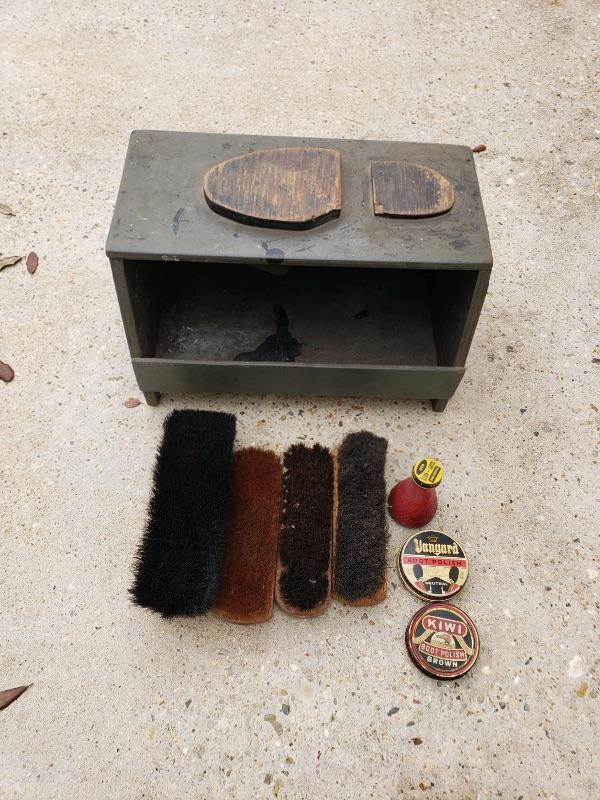 LOT #60. Vintage wooden shoeshine kit with accessories.