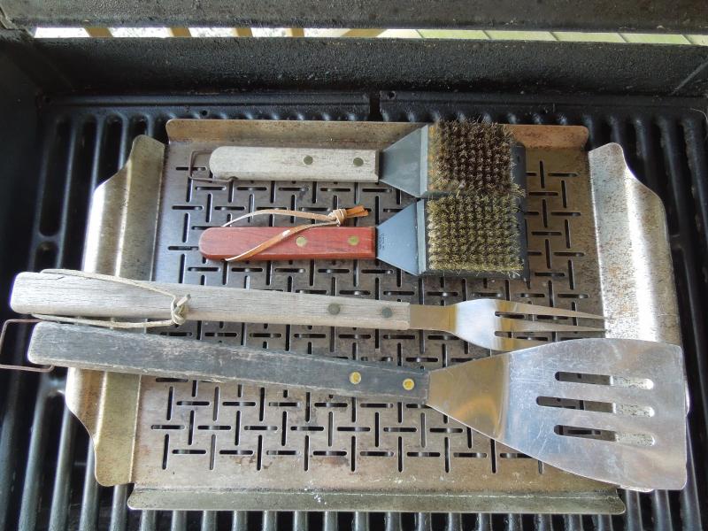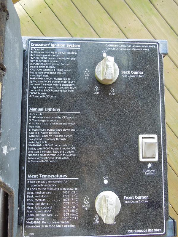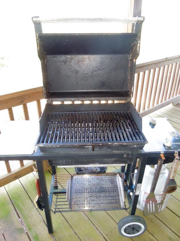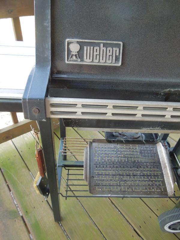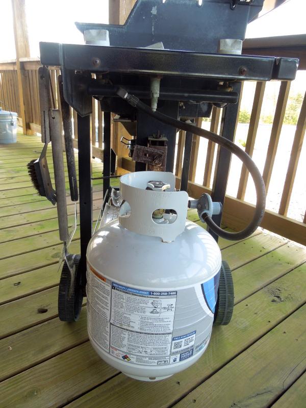 One shelf. 45" W x 19" D x 40" H. 22" x 14" grilling surface. Striker not working. Fairly clean, some minor grease, very little rust. Knobs are dirty. Extra empty propane tank added after photo. No