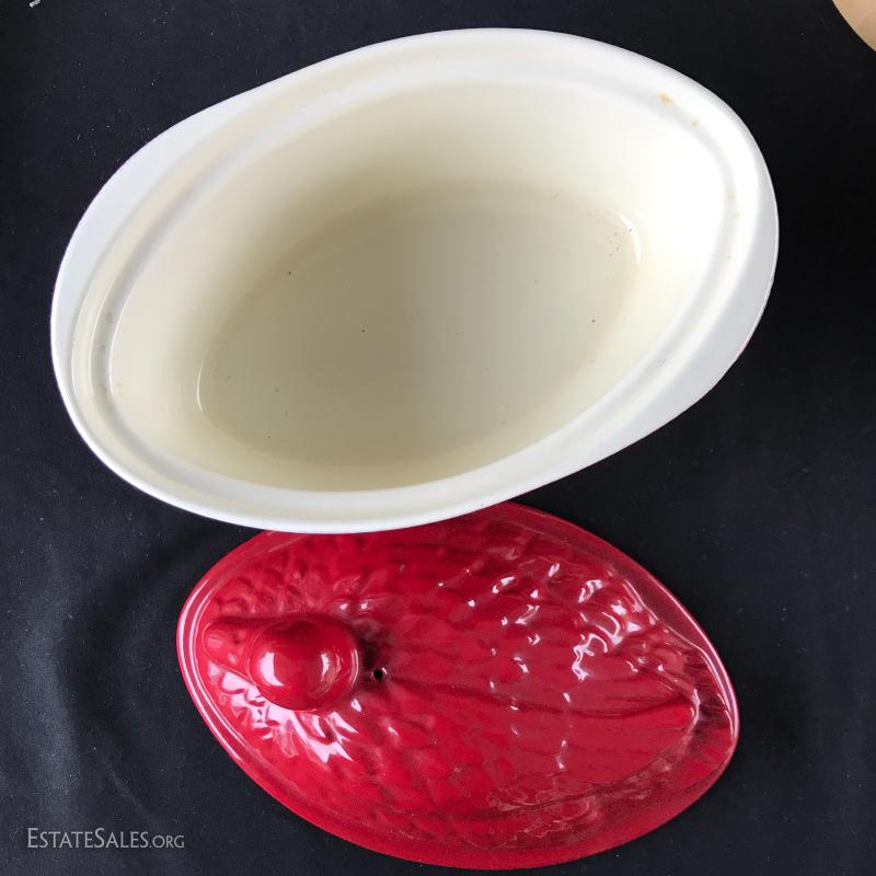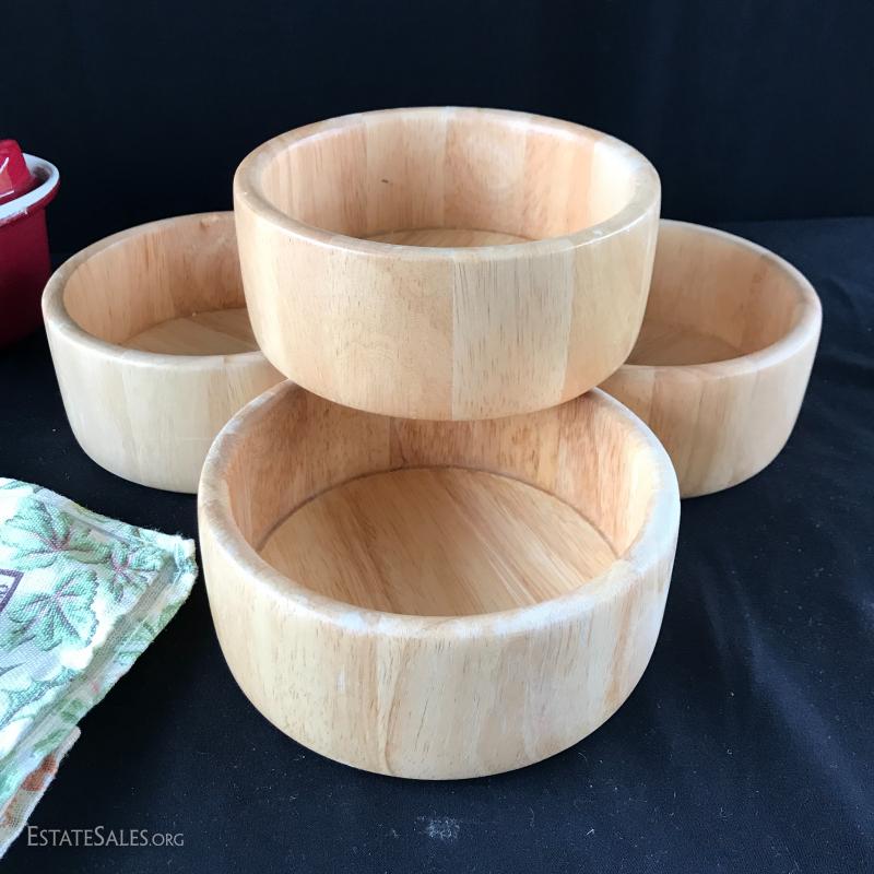 Set of four wood bowls, 6” diameter. Kitchen towels in garden design, two of each and like new. Red dish with chicken design on lid, 9.5”l x 6.5”w x 5”h. Shipping available or local pick up in Asheville, NC.