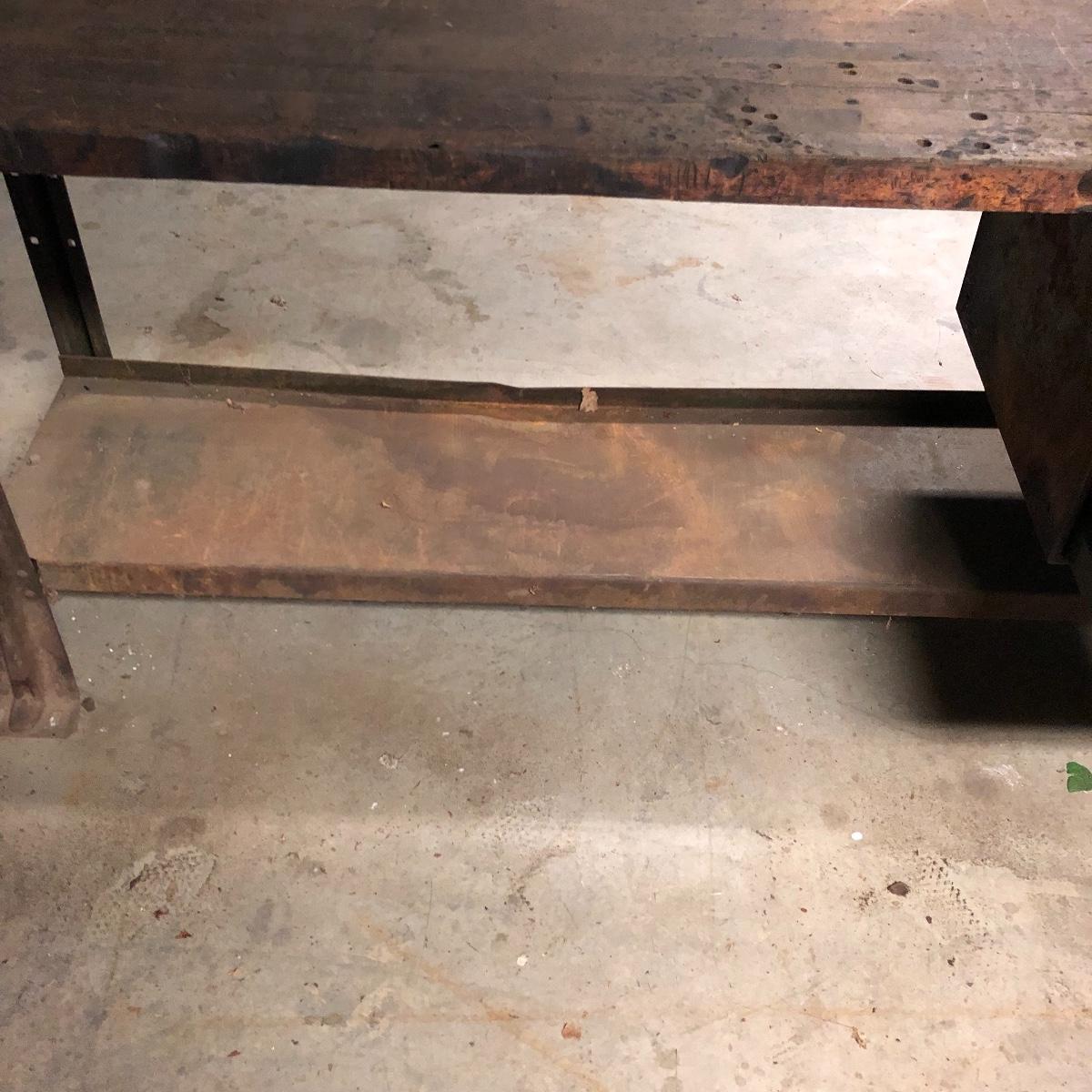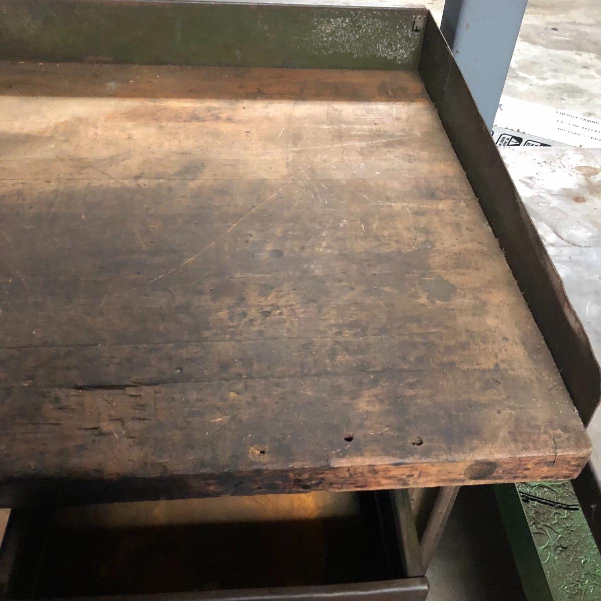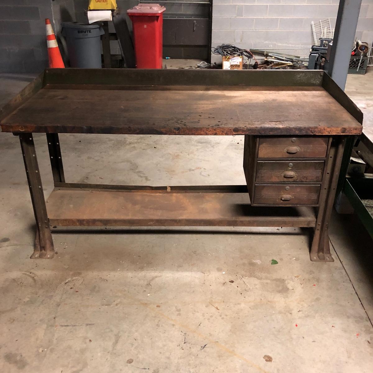 This bench has a 1 1/2” thick wooden top and a heavy metal frame with metal shelf and metal drawers underneath. the Bench measures 31” x 73” x 35”. Bring help as item is substantial.