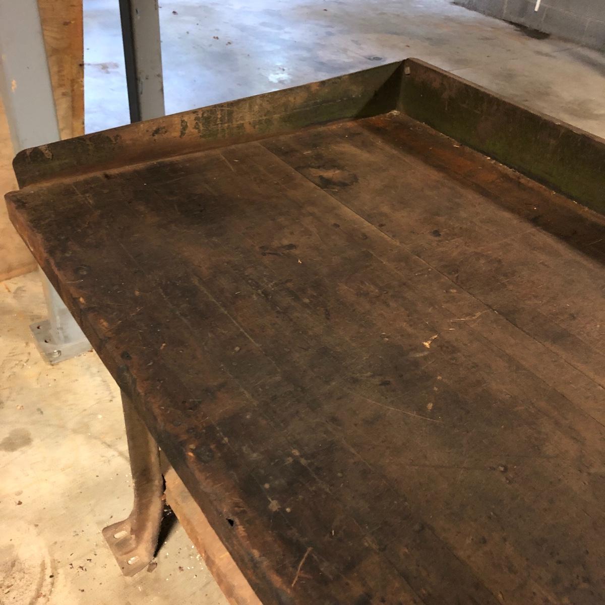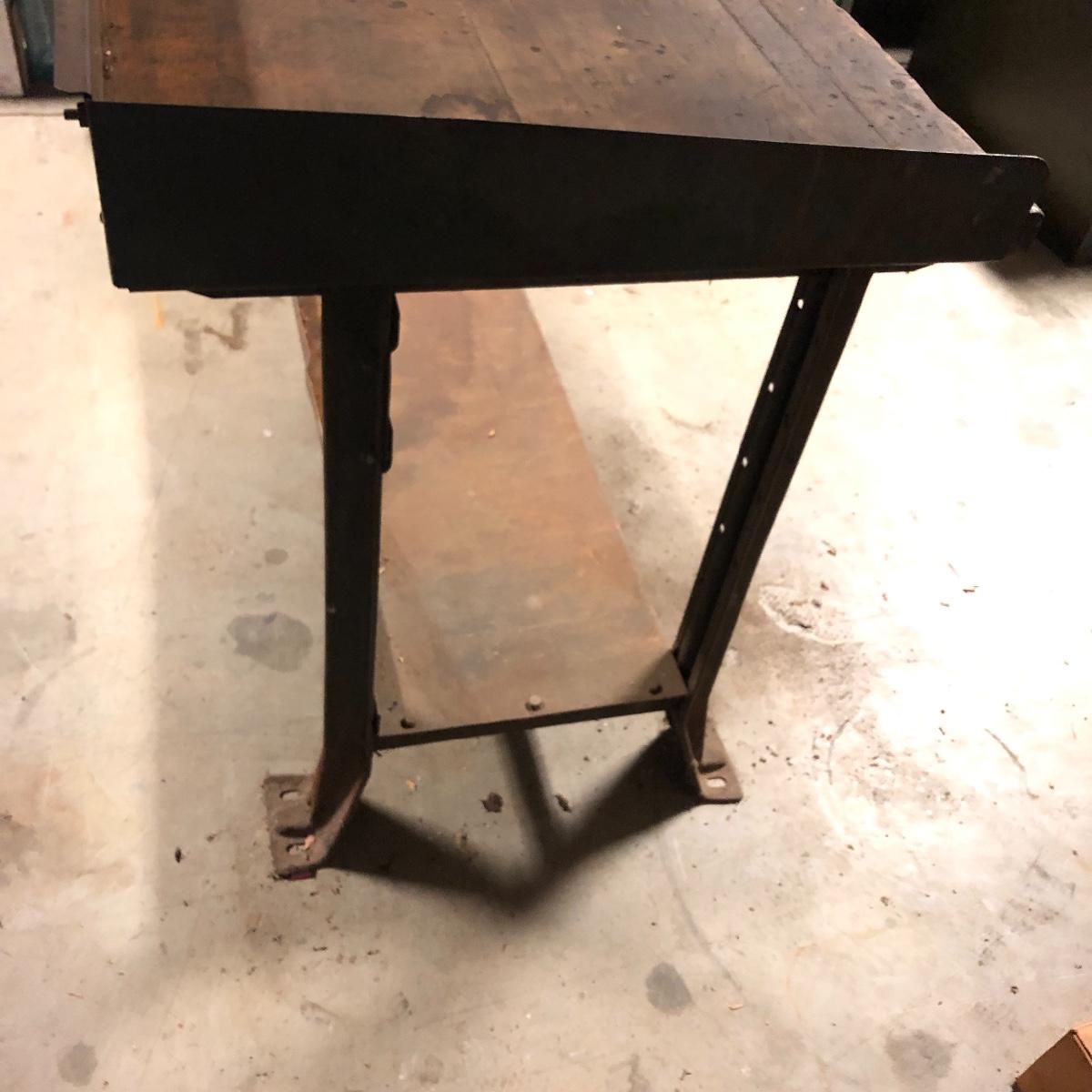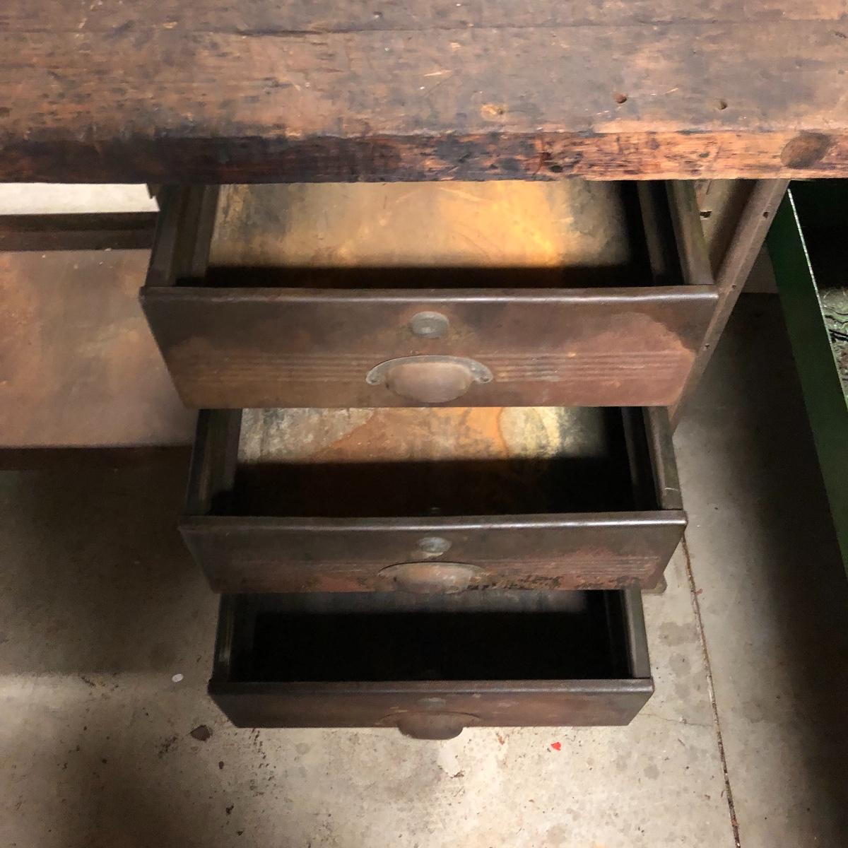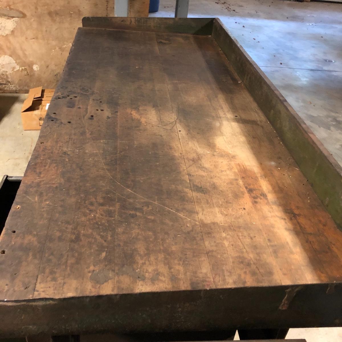 This bench has a 1 1/2” thick wooden top and a heavy metal frame with metal shelf and metal drawers underneath. the Bench measures 31” x 73” x 35”. Bring help as item is substantial.