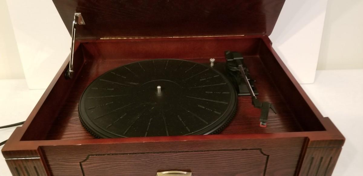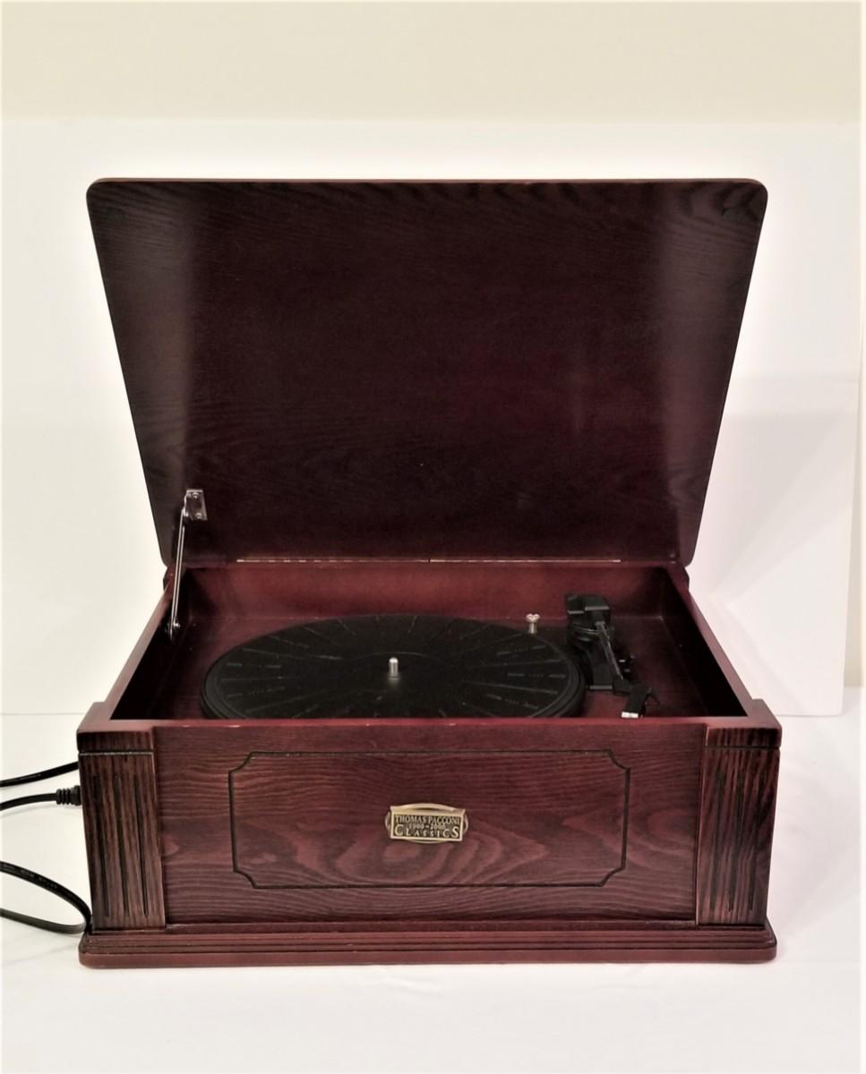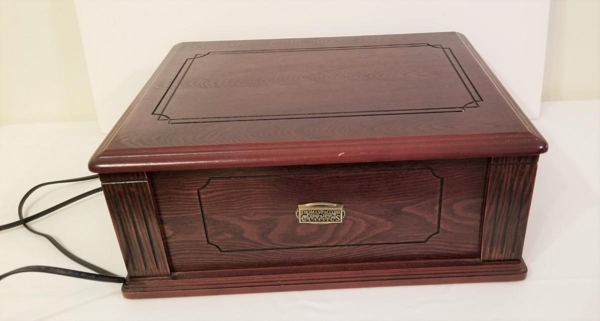 Thomas Pacconi Working turntable in old-style wooden cabinet. 17" across, 13.5" deep, 7" tall.