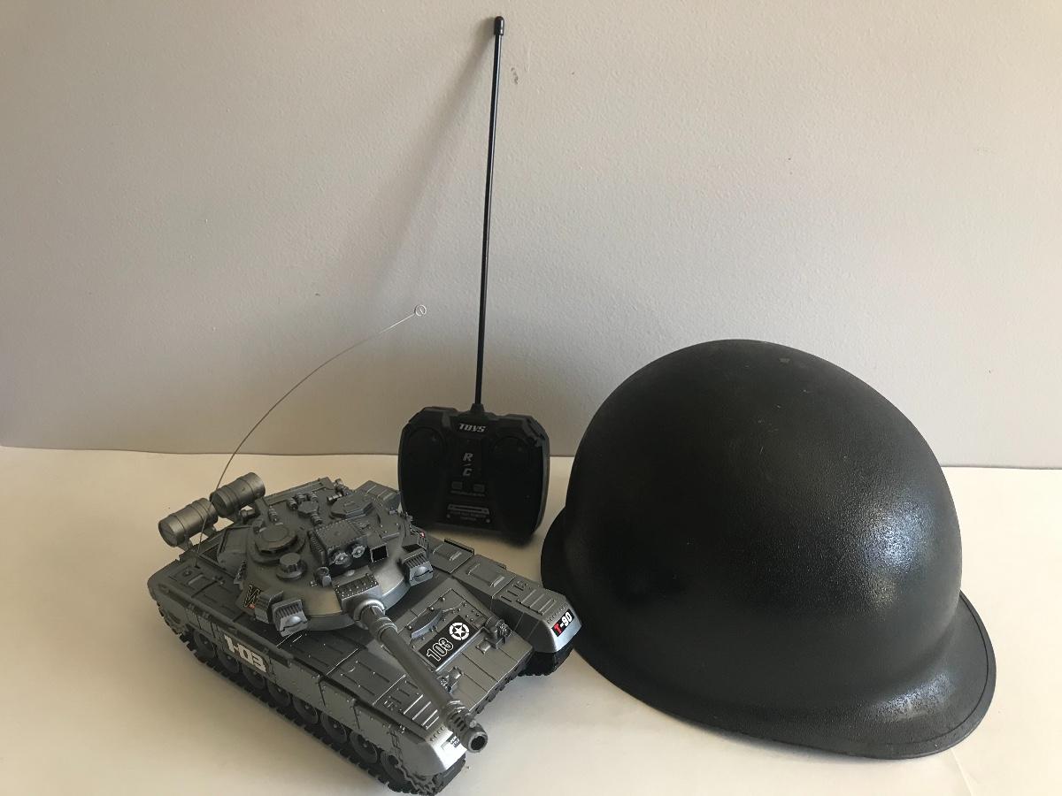 Remote control tank, and a WWII helmet. Please see all pictures for content of the lot, condition of the lot, and measurements if taken. Pictures are the best representation of the items listed and items are untested unless indicated in description. Thank you for looking and have fun bidding!