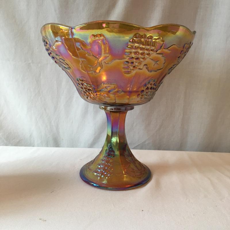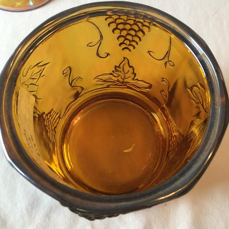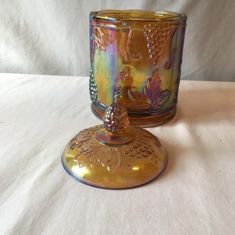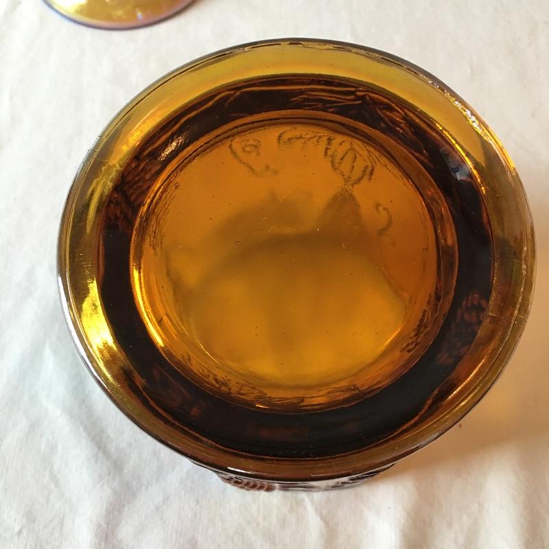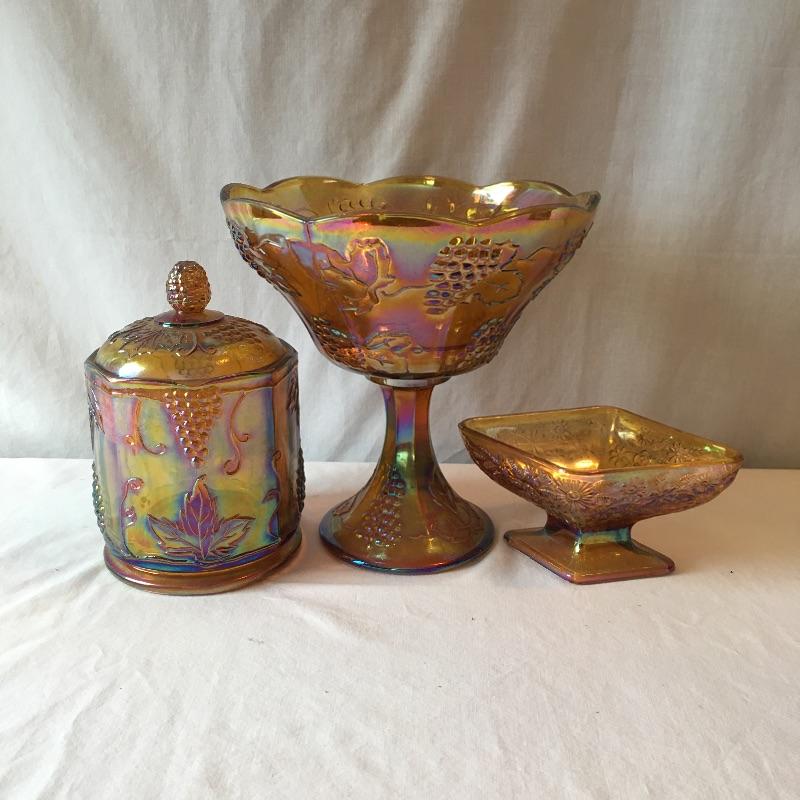 Amber Carnival Glass includes jar with lid, small dish and large pedestal dish that measures 8.25”D x 8.25” tall. Love the sheen coming off these pieces.