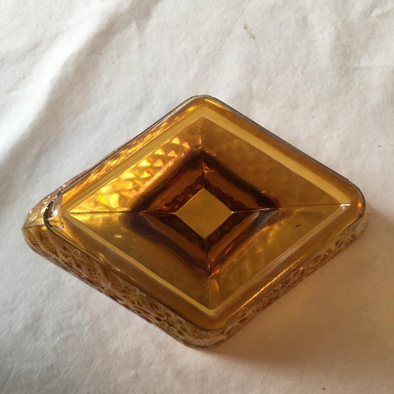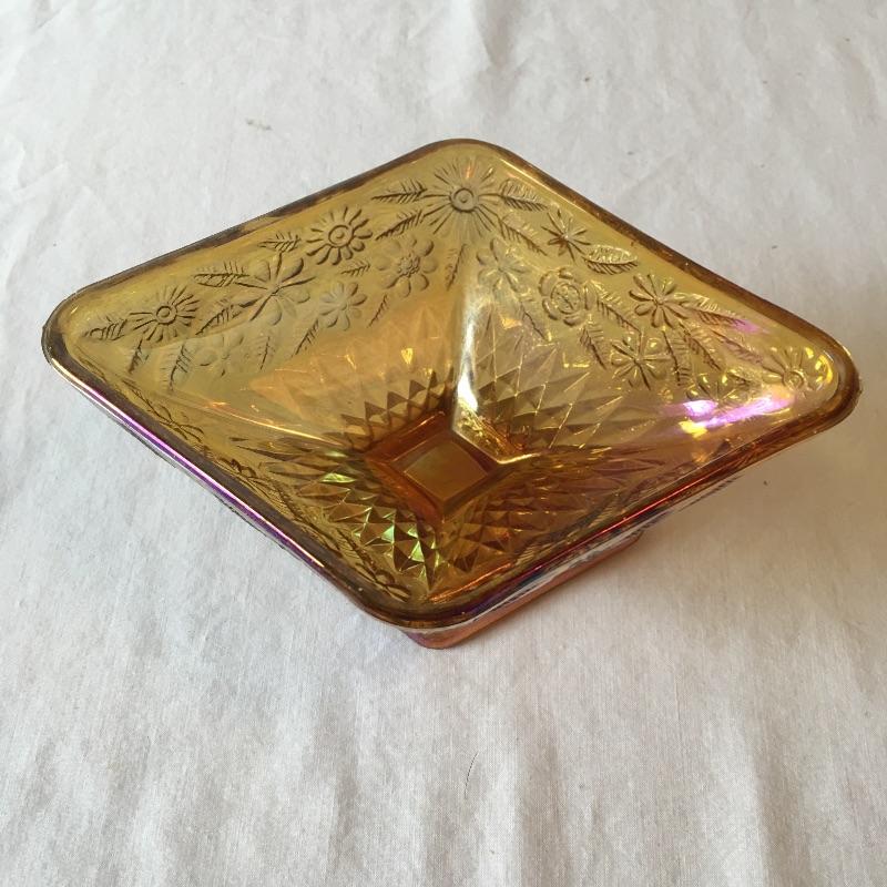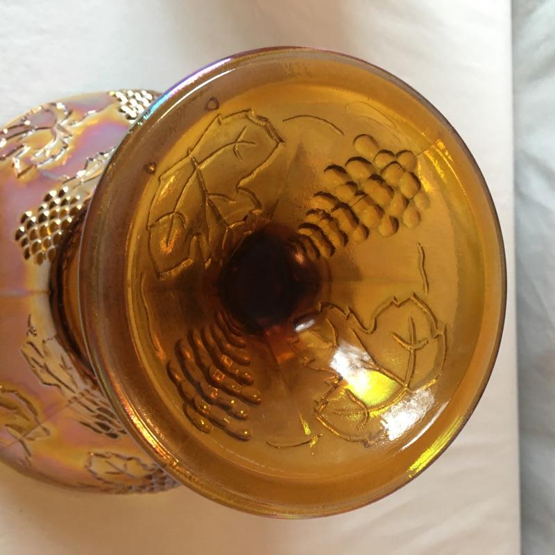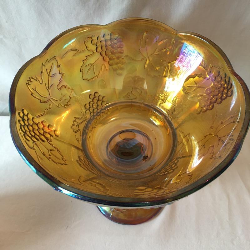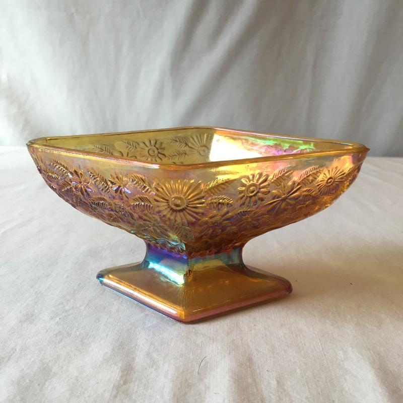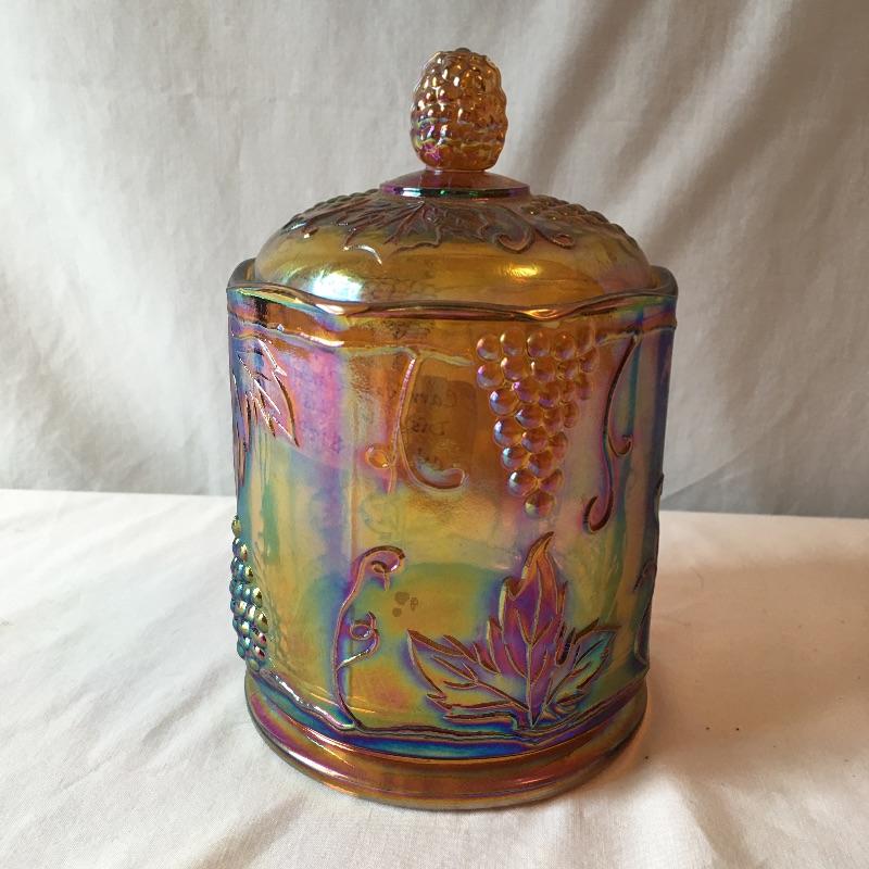 Amber Carnival Glass includes jar with lid, small dish and large pedestal dish that measures 8.25”D x 8.25” tall. Love the sheen coming off these pieces.
