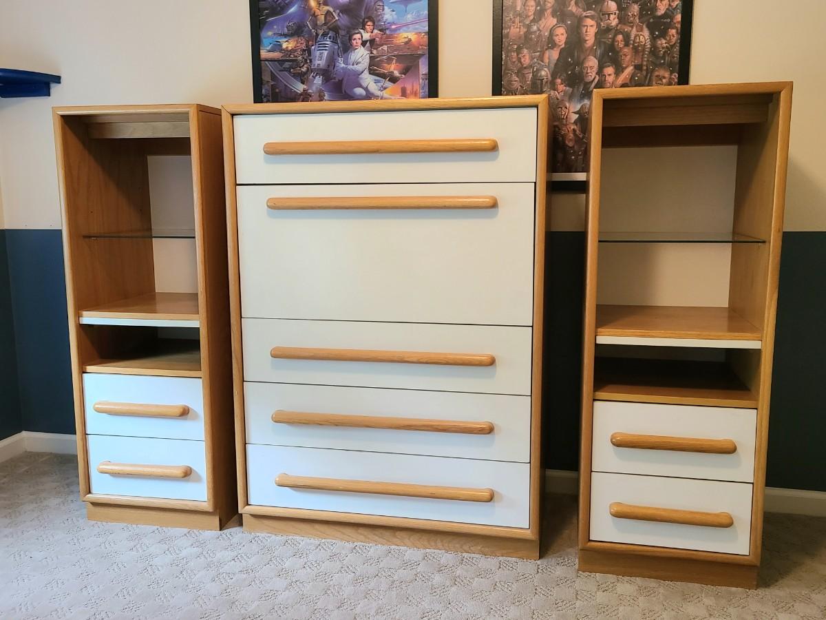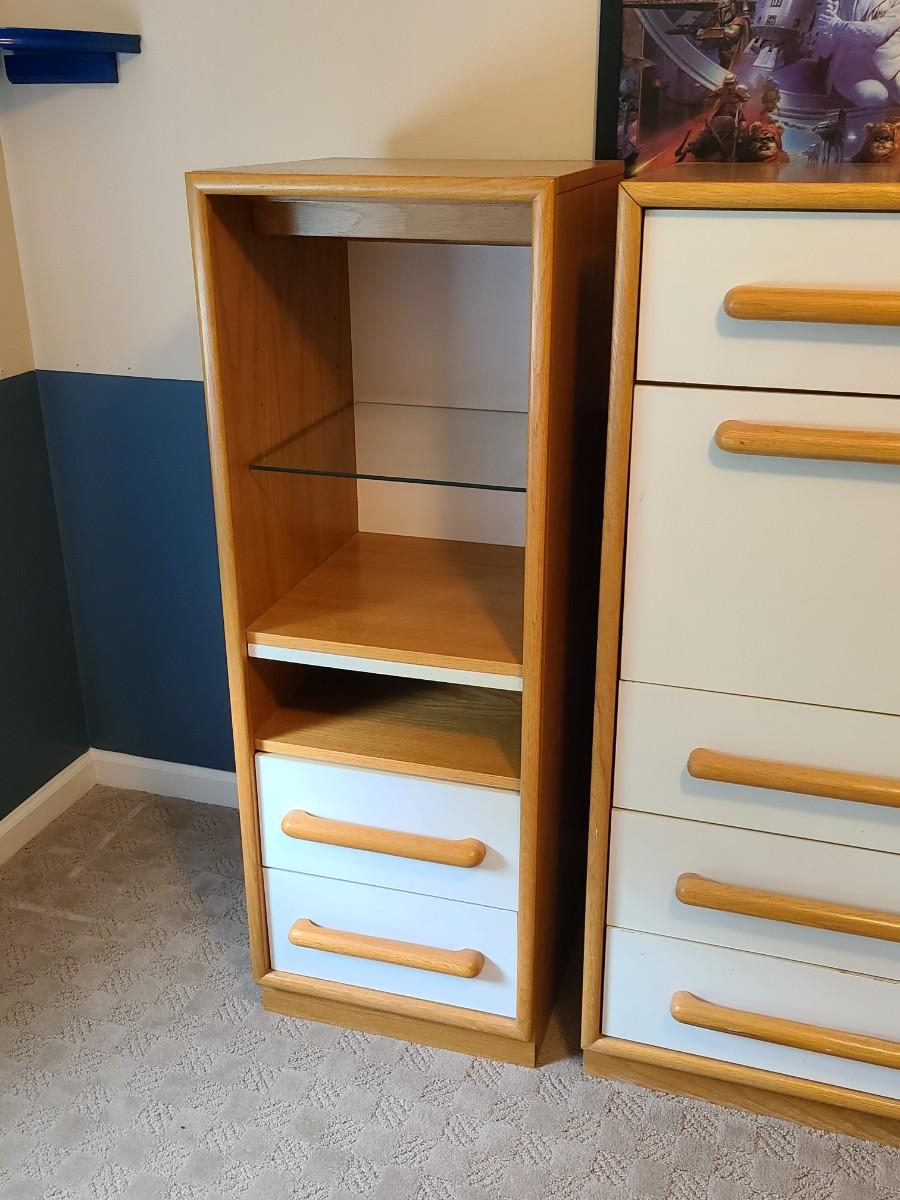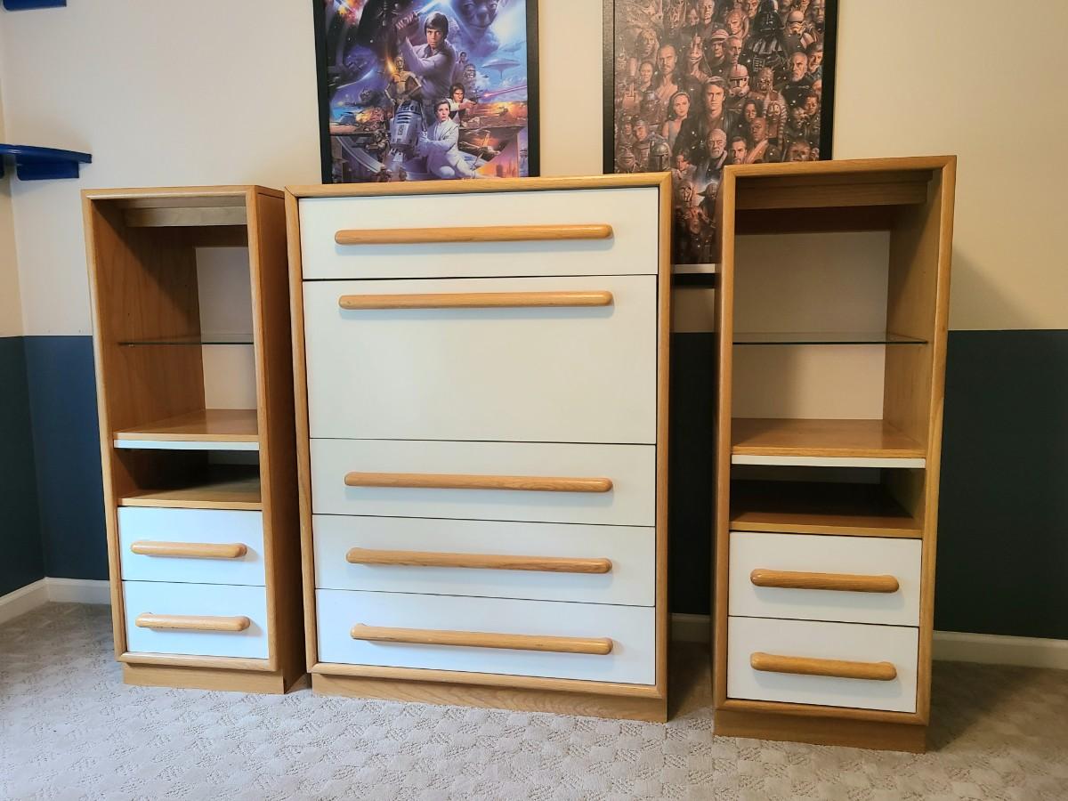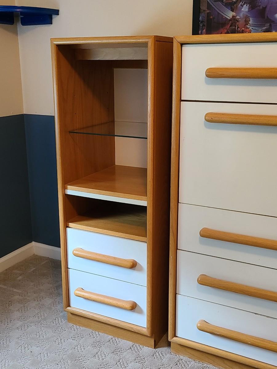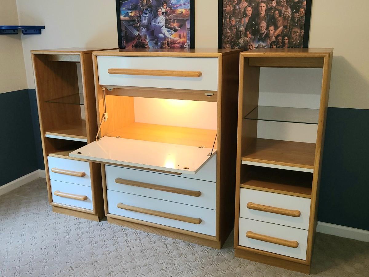 This set is solid and perfect for a bedroom or office space. Flip down lighted desk space and lighted bookshelves with drawers. Use in one room or three! Please see all pictures as they are the best representation of the items. The pictures show condition, measurements if taken, and what is included in the lot. Due to the large amount that we photograph and the time frame, we are not always able to take measurements. All items unless noted, are pre-owned and have been used. If you purchased furniture, you must bring help. We do not allow one person to carry large furniture out on their own. Bring help, tools and a truck for the safety of our client’s homes, and your personal safety. Any damages that result to the property including walls, and floors due to moving of the furniture will be charged to the buyer. Company policy. Thank you.