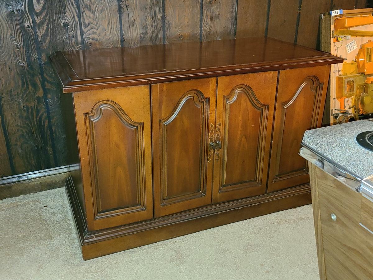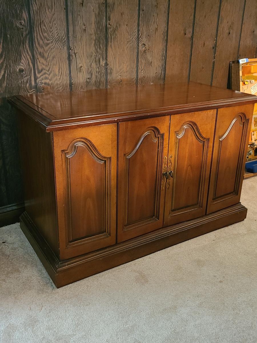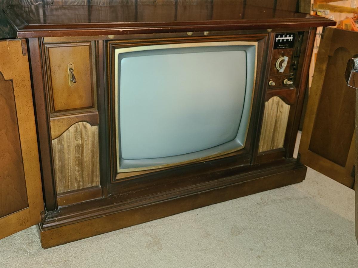 This vintage console was used as a table. It does have the TV inside, but the cord has been cut and it would need to be rewired. It is located in the basement and would need to be carried up one set of stairs. Please see all pictures as they are the best representation of the items. The pictures show condition, measurements if taken, and what is included in the lot. Due to the large amount that we photograph and the time frame, we are not always able to take measurements. All items unless noted, are pre-owned and have been used. If you purchased furniture, you must bring help. We do not allow one person to carry large furniture out on their own. Bring help, tools and a truck for the safety of our client’s homes, and your personal safety. Company policy. Thank you.