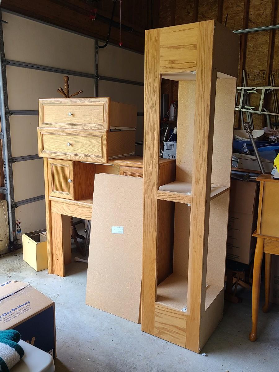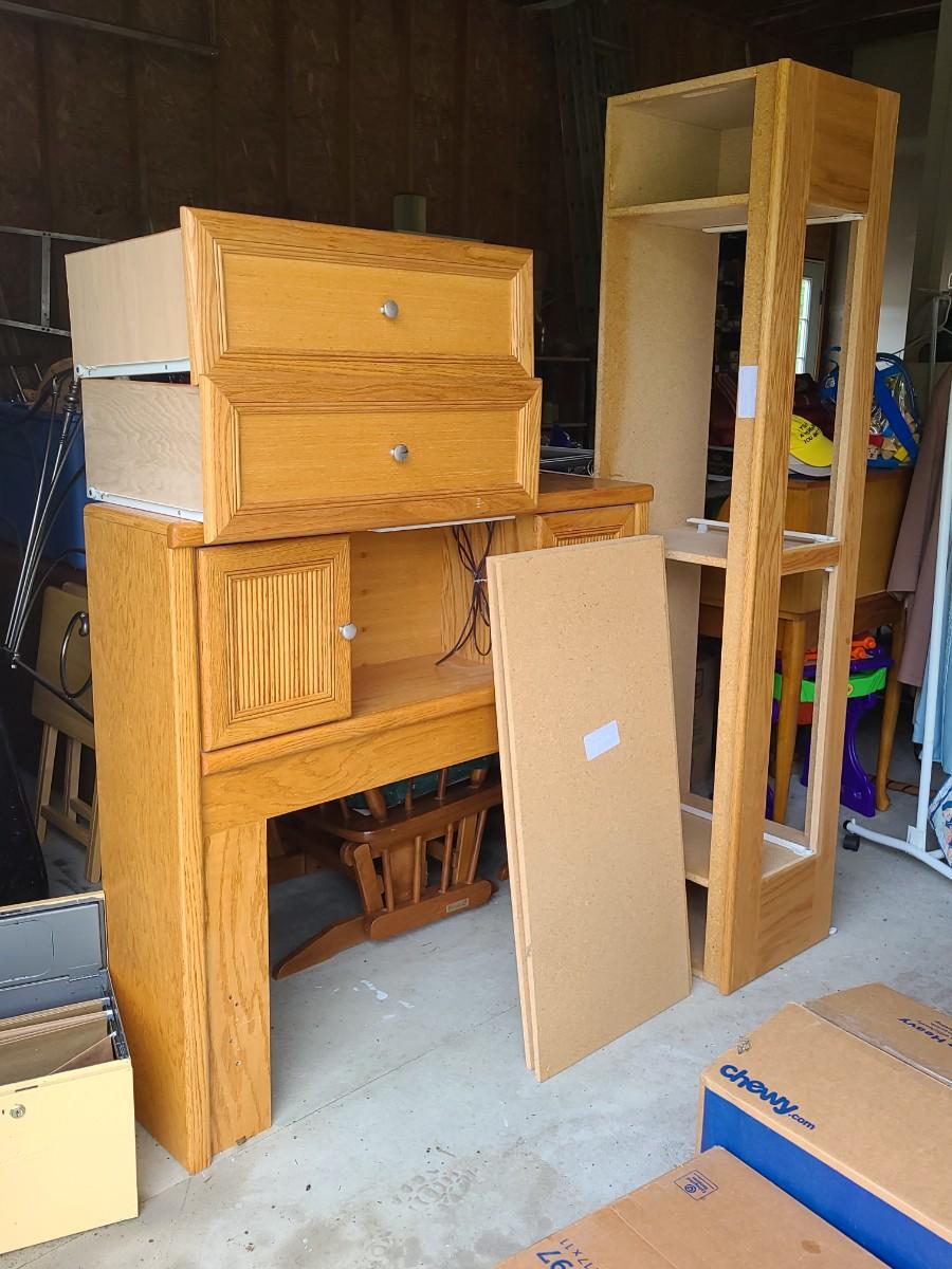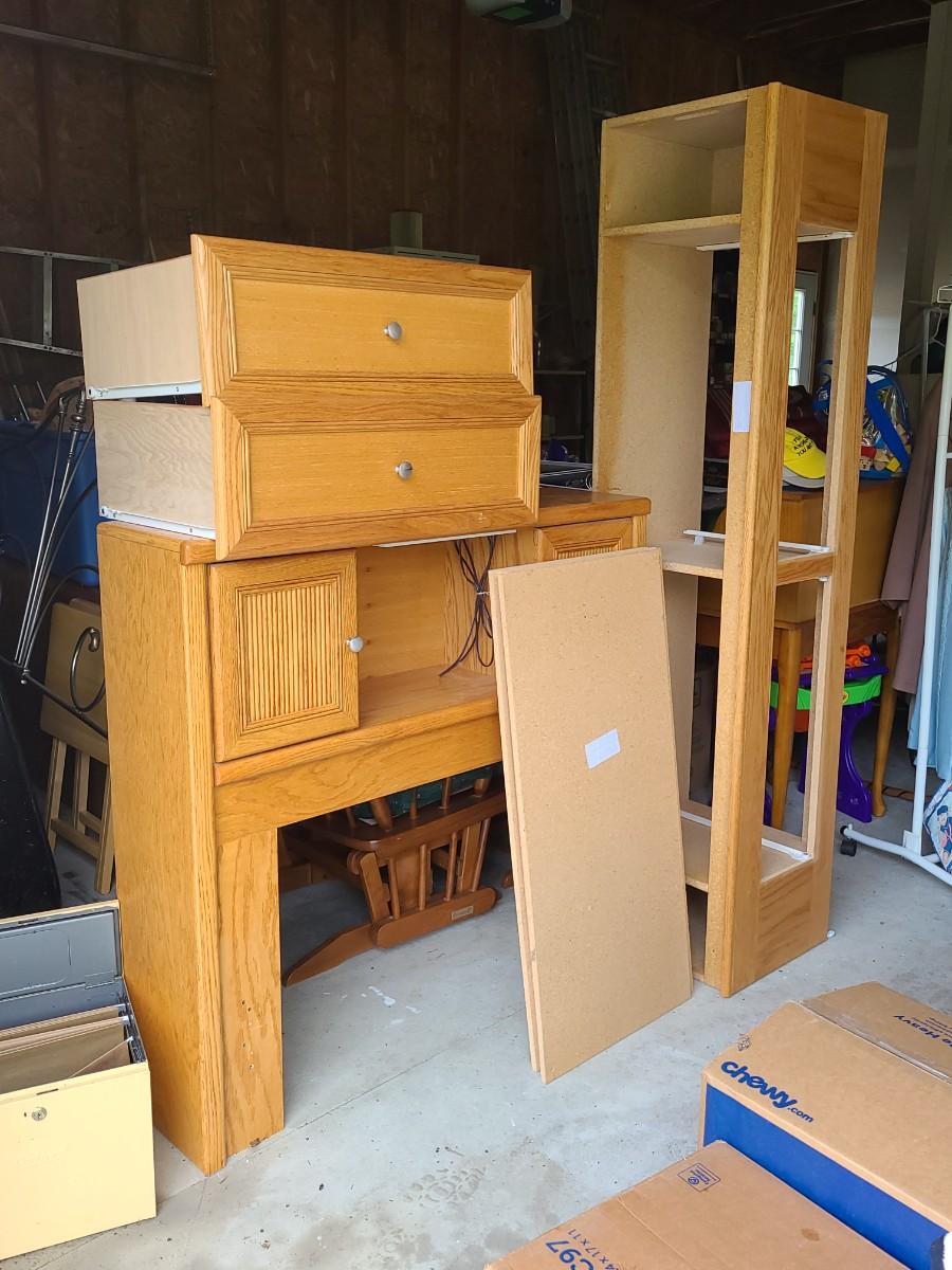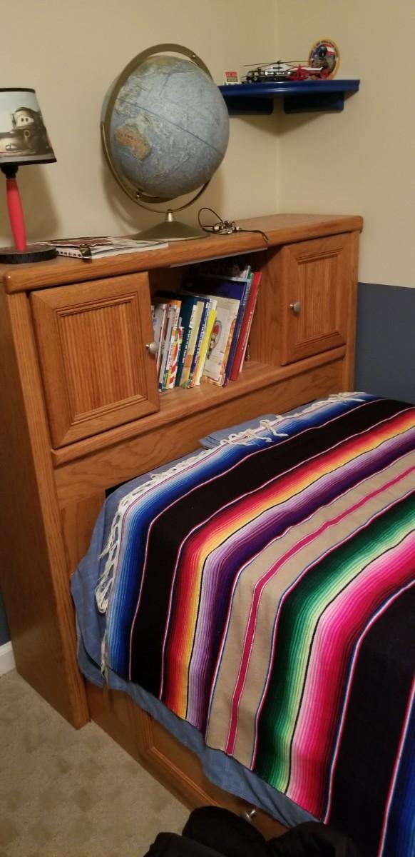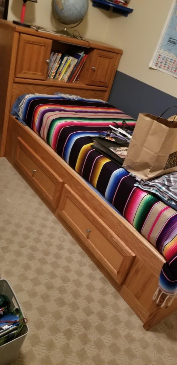 This is a solid piece of furniture and is functional as well as great design! Unisex oak/honey color. Has bookshelf/ shelf back, the platforms for bed so no bowstring needed, and drawers for underneath. Ready to load in your truck!
