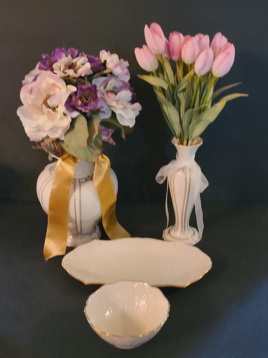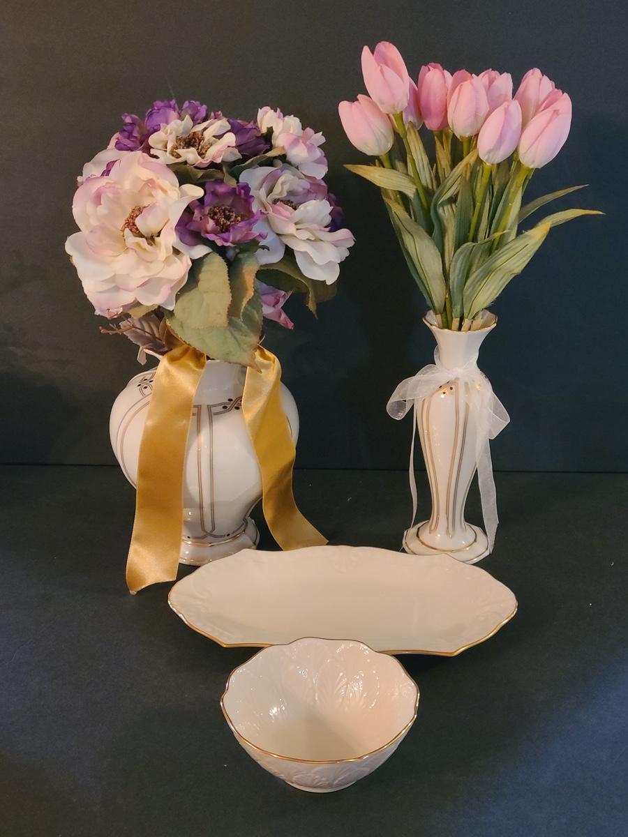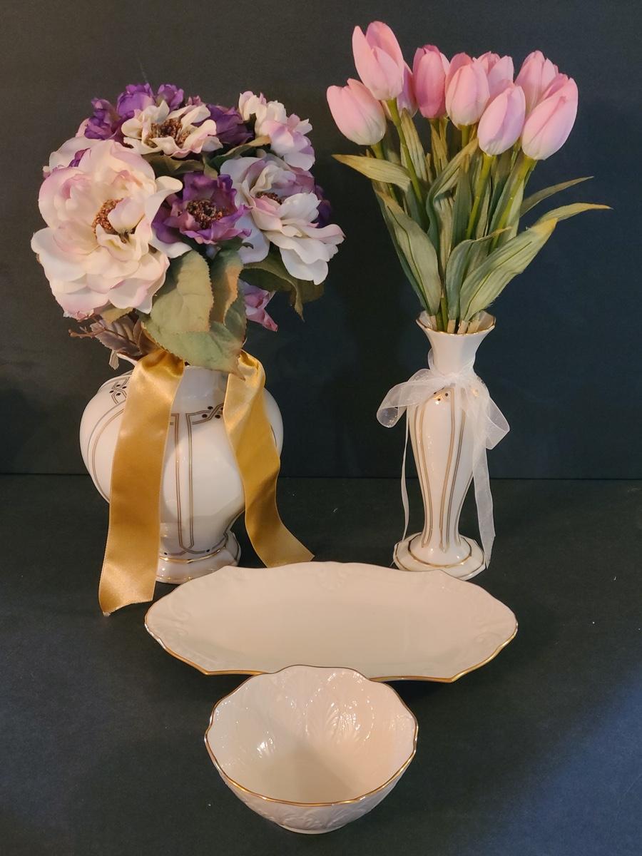 Lovely Lenox vases with accent trays and florals. Please see all pictures as they are the best representation of the items in the lot, the condition of the lot, and will show measurements if taken. If purchasing furniture you must be able to move yourself with your own help, and truck.