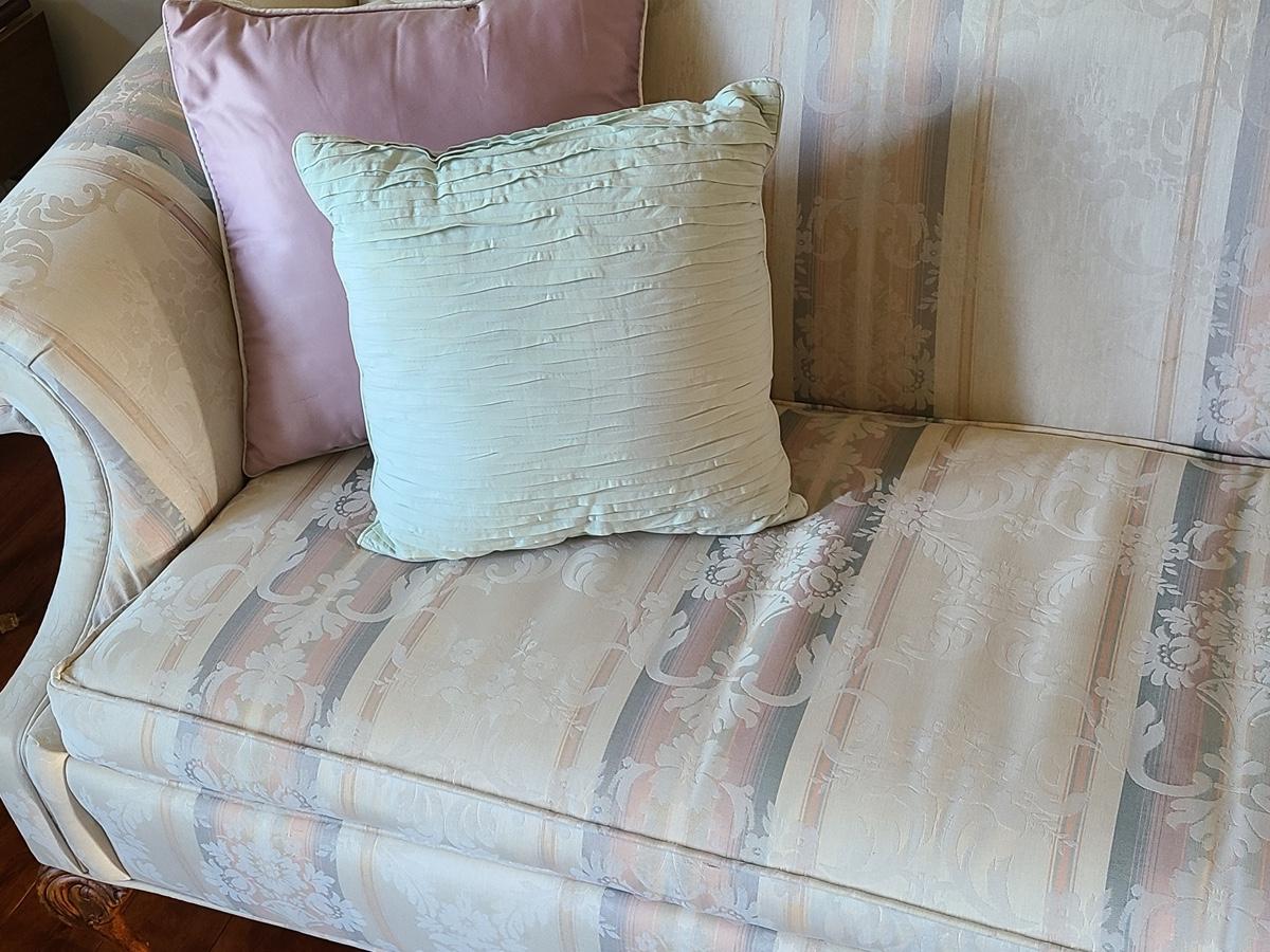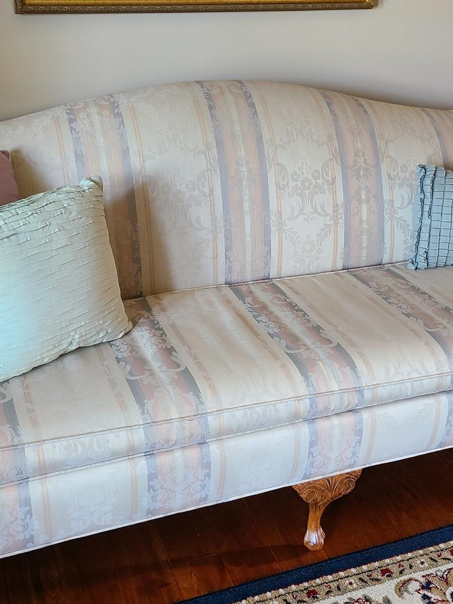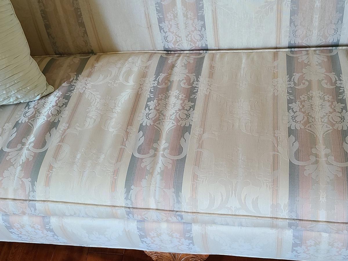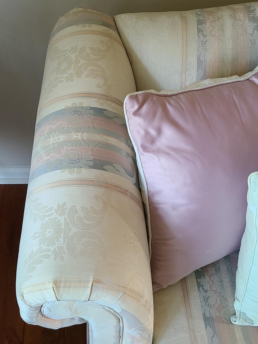 This is a beautiful parlor/entryway couch that is in excellent condition. Soft beiges, pinks and blues. Please see all pictures as they are the best representation of the items in the lot, the condition of the lot, and will show measurements if taken. If purchasing furniture you must be able to move yourself with your own help, and truck. .