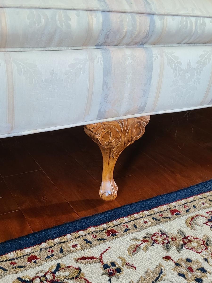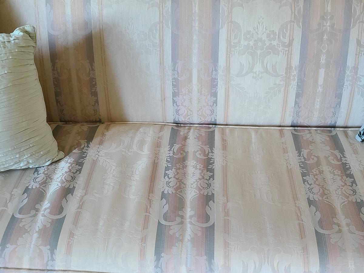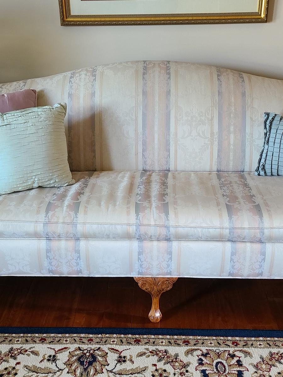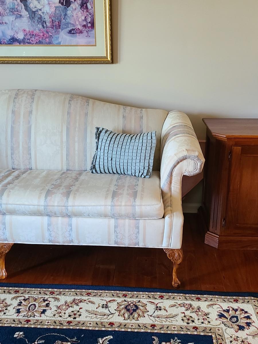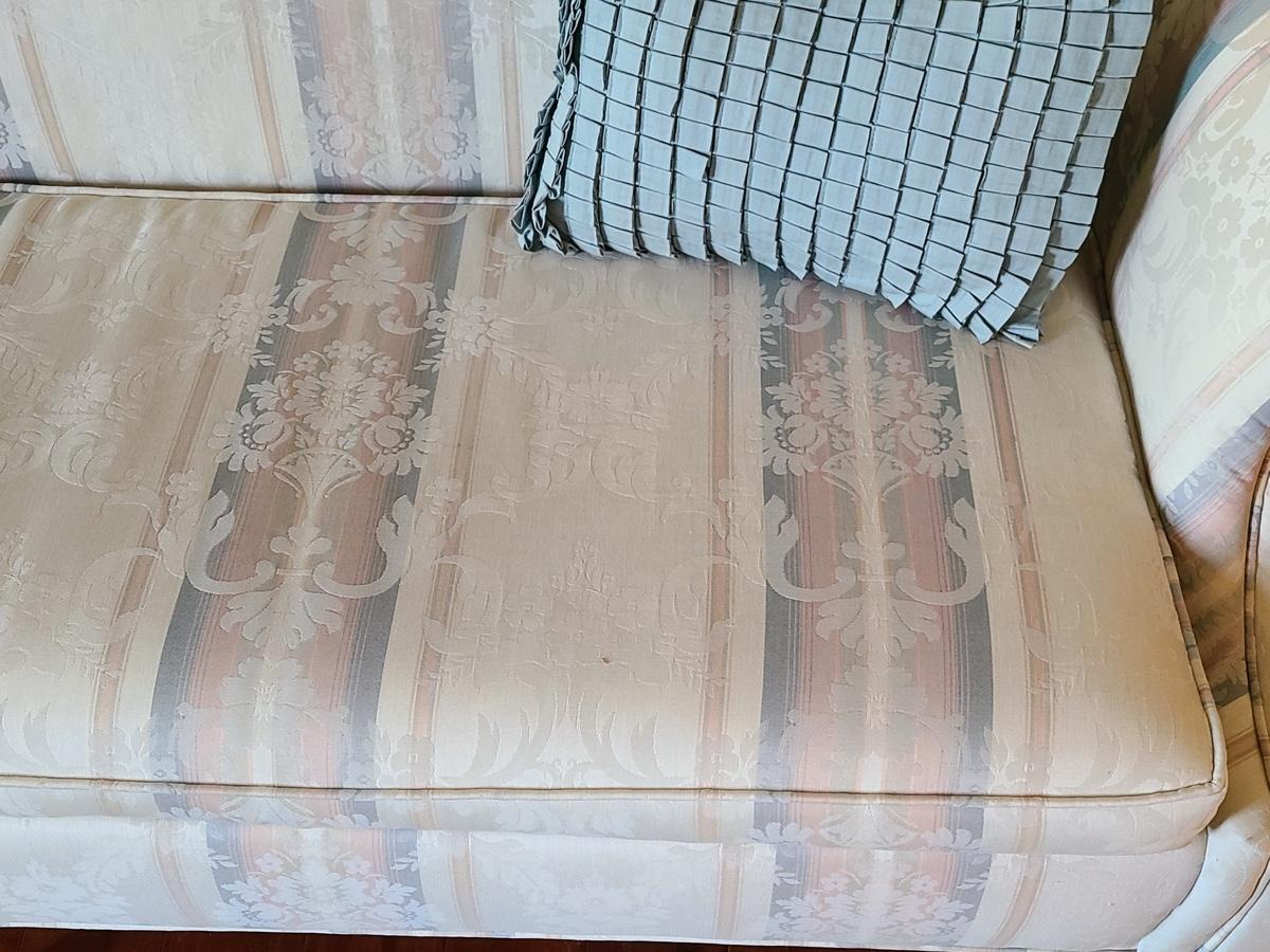 This is a beautiful parlor/entryway couch that is in excellent condition. Soft beiges, pinks and blues. Please see all pictures as they are the best representation of the items in the lot, the condition of the lot, and will show measurements if taken. If purchasing furniture you must be able to move yourself with your own help, and truck. .