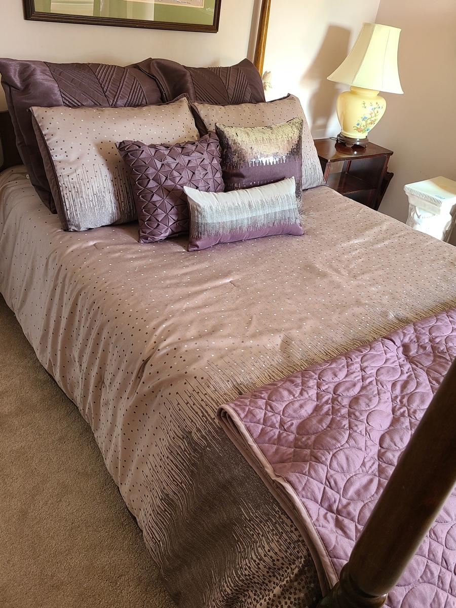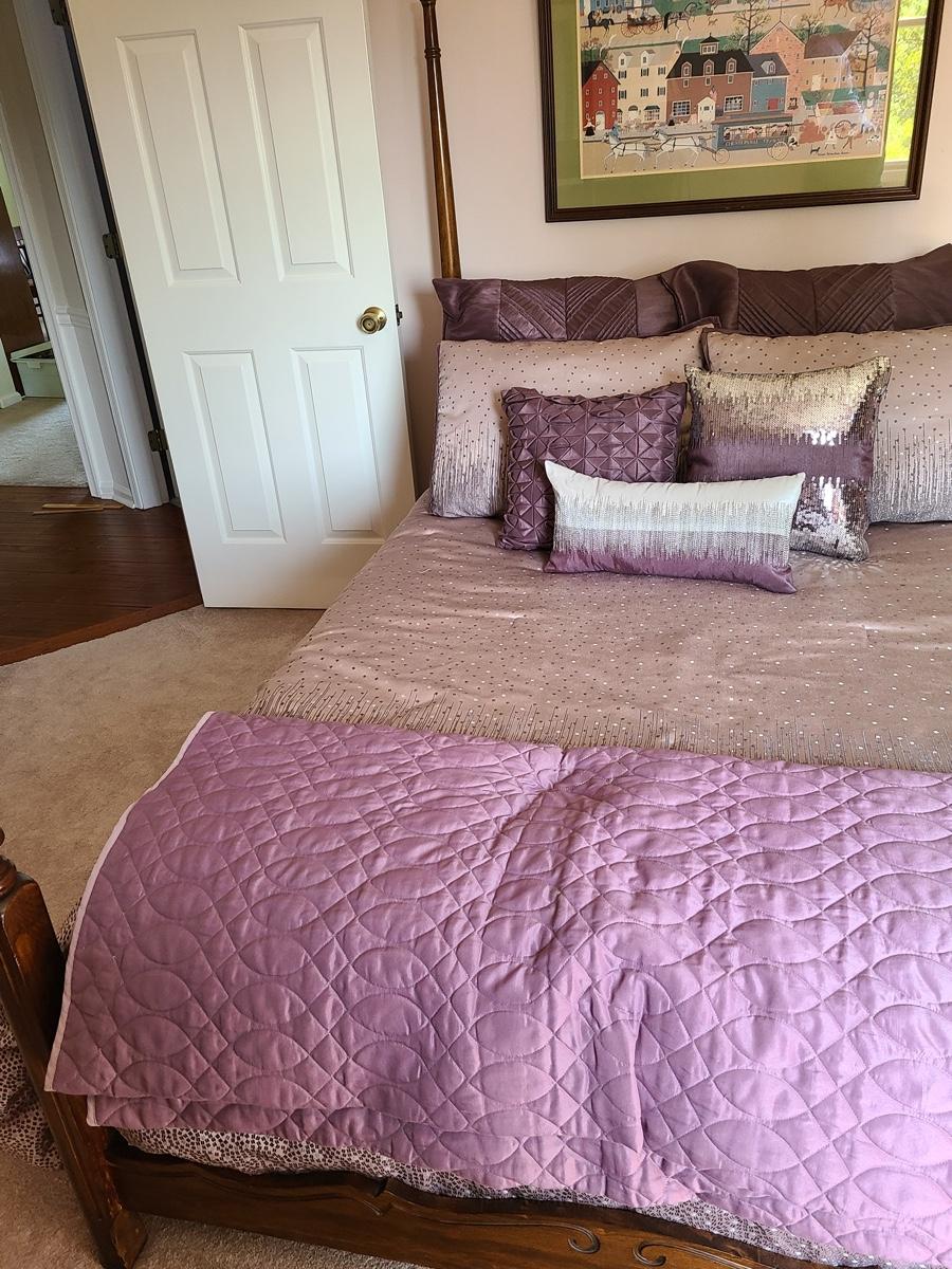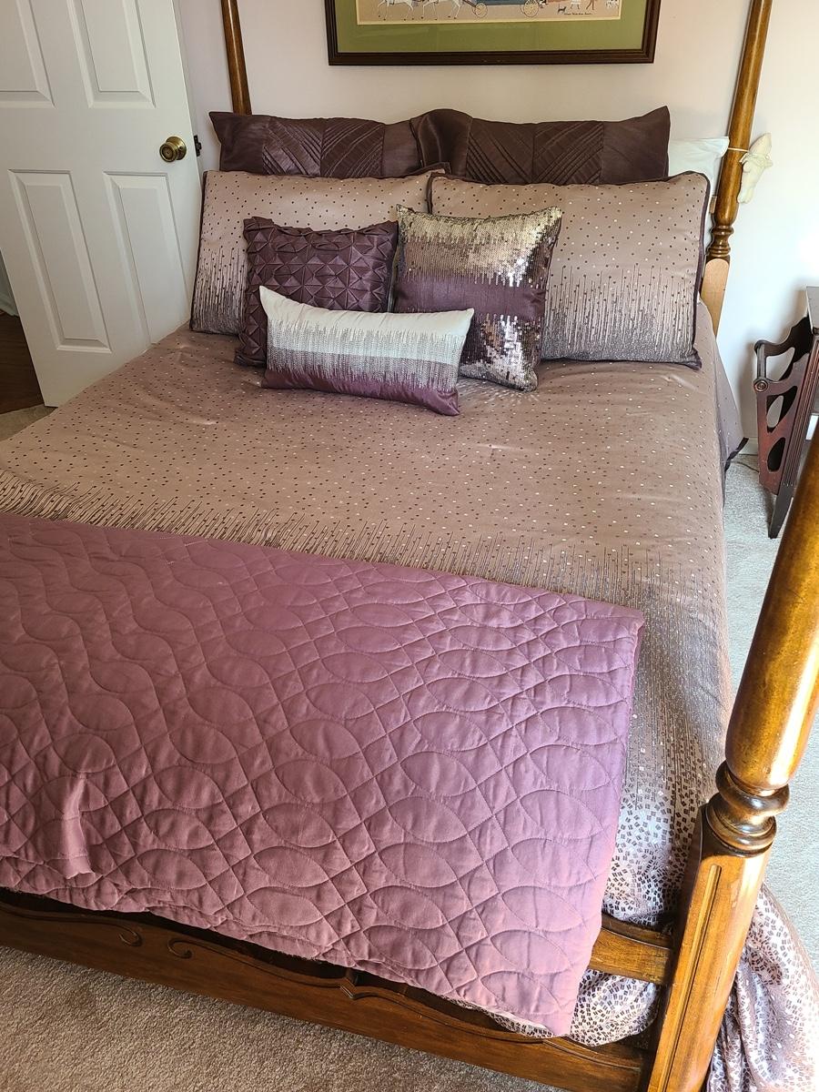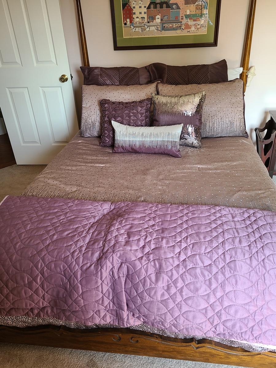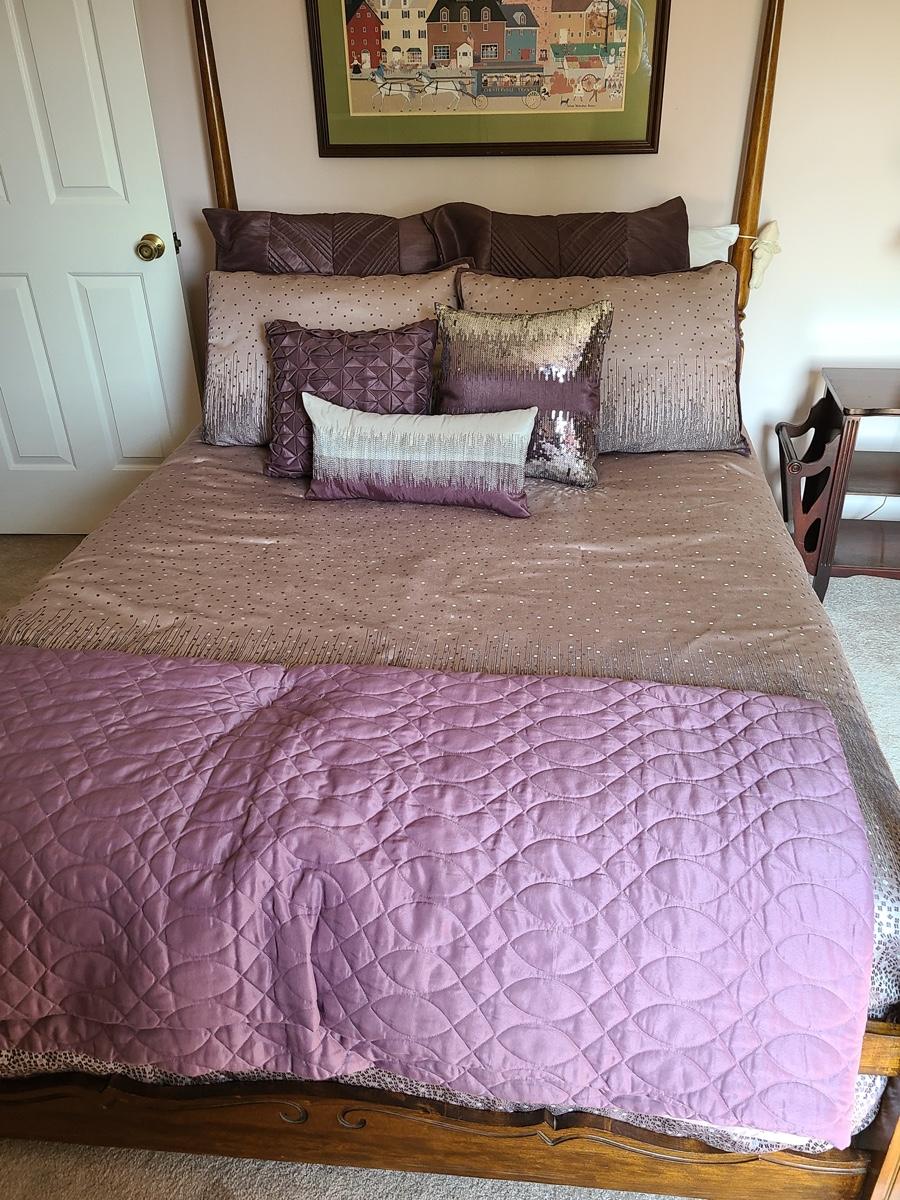 Lovely bedding ensemble in a size queen. This comes with comforter, coverlet, covered bed pillows shown, and accent pillows. This does not come with the white bed pillows or the actual bed/mattress. Just the bedding ensemble in purple hues. Please see all pictures as they are the best representation of the items in the lot, the condition of the lot, and will show measurements if taken. If purchasing furniture you must be able to move yourself with your own help, and truck. .