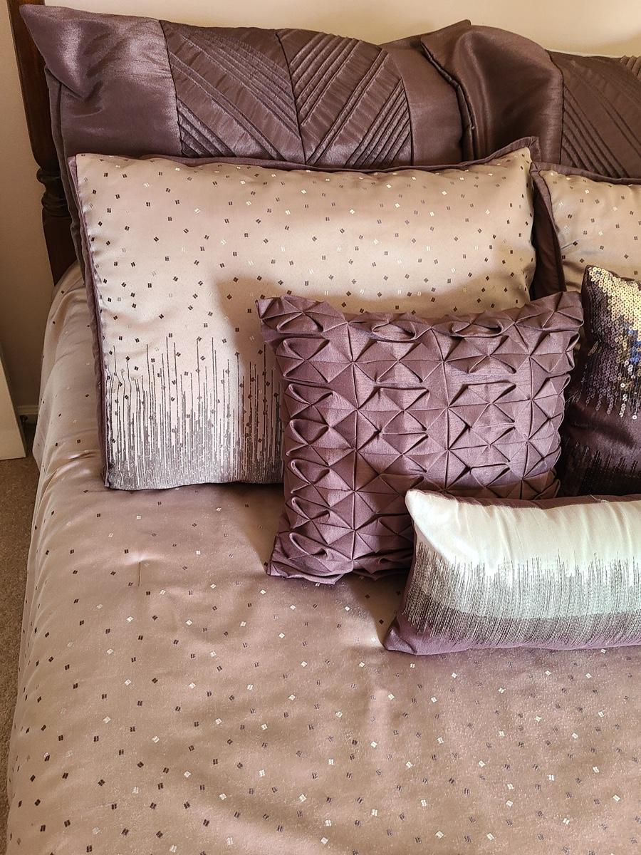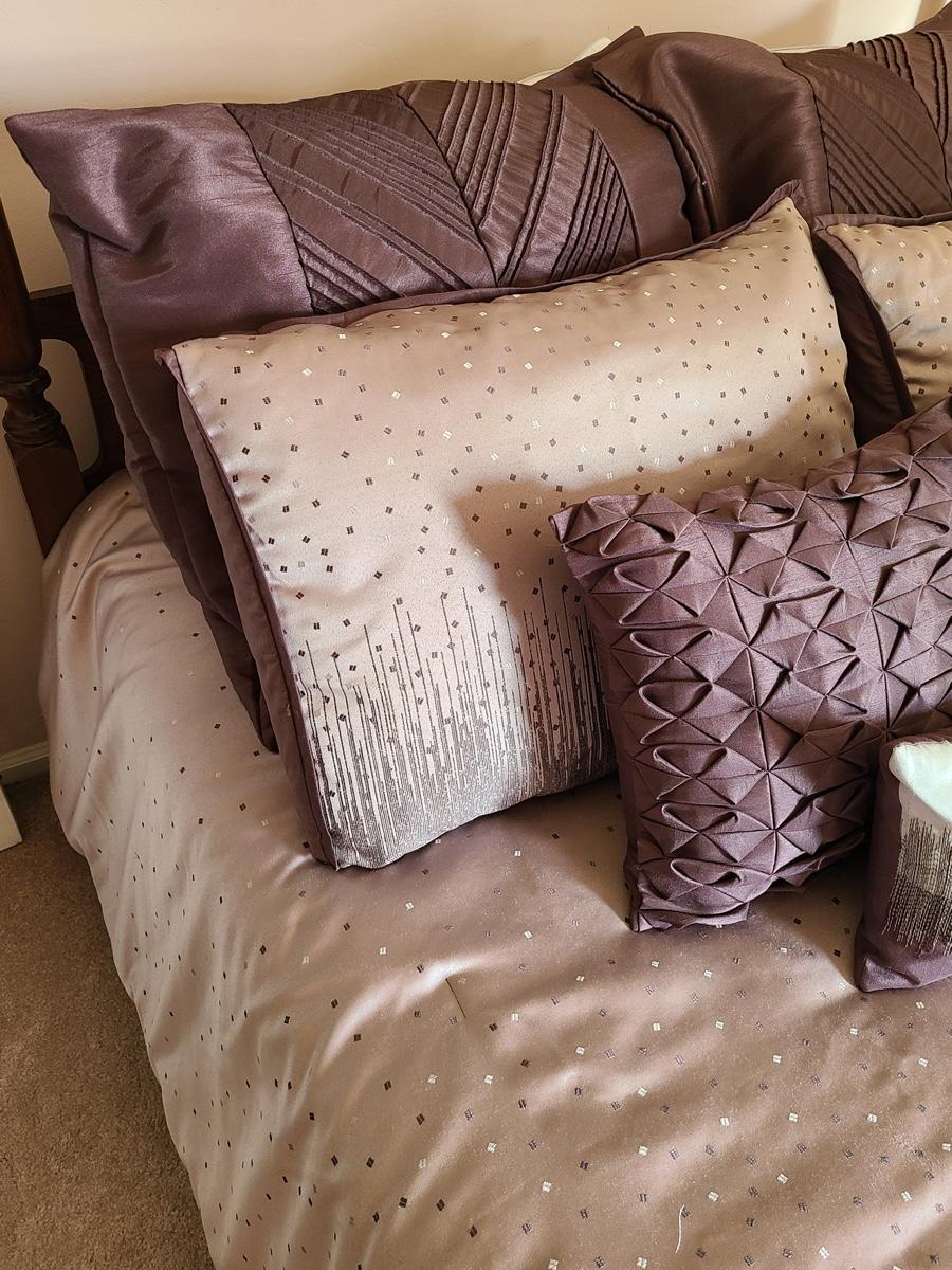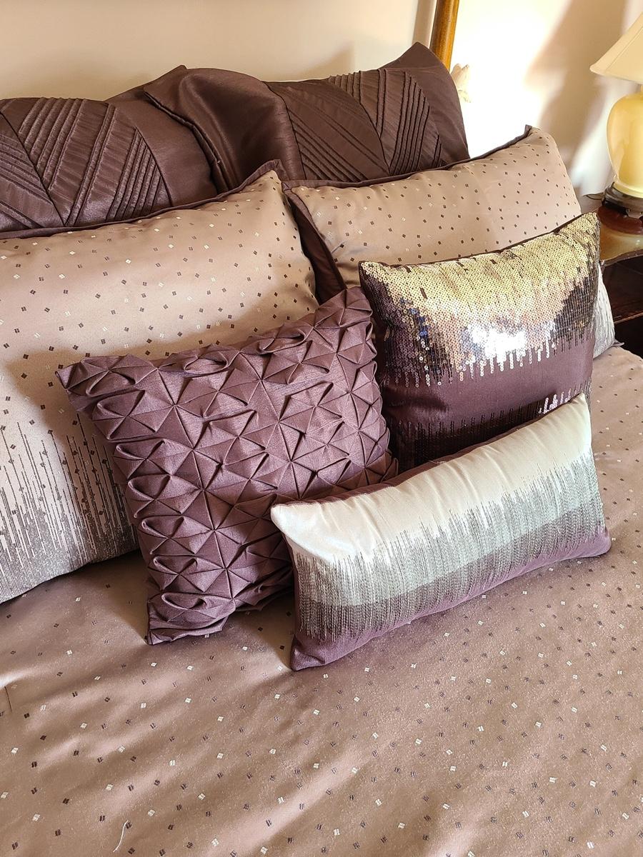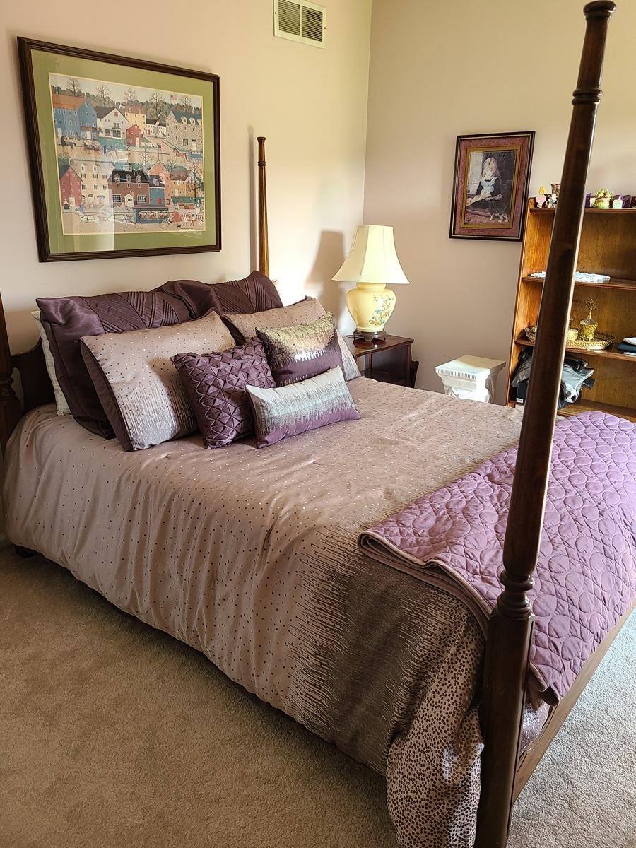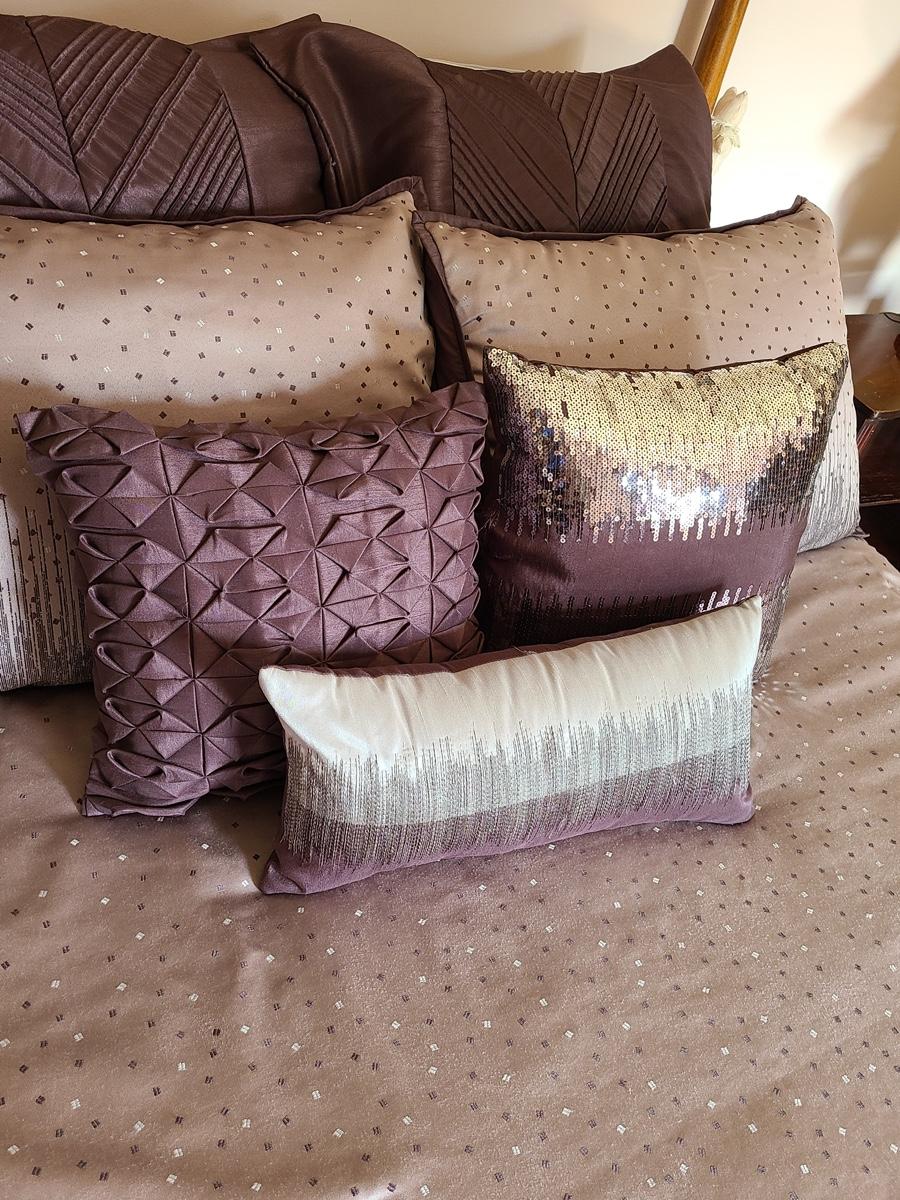 Lovely bedding ensemble in a size queen. This comes with comforter, coverlet, covered bed pillows shown, and accent pillows. This does not come with the white bed pillows or the actual bed/mattress. Just the bedding ensemble in purple hues. Please see all pictures as they are the best representation of the items in the lot, the condition of the lot, and will show measurements if taken. If purchasing furniture you must be able to move yourself with your own help, and truck. .
