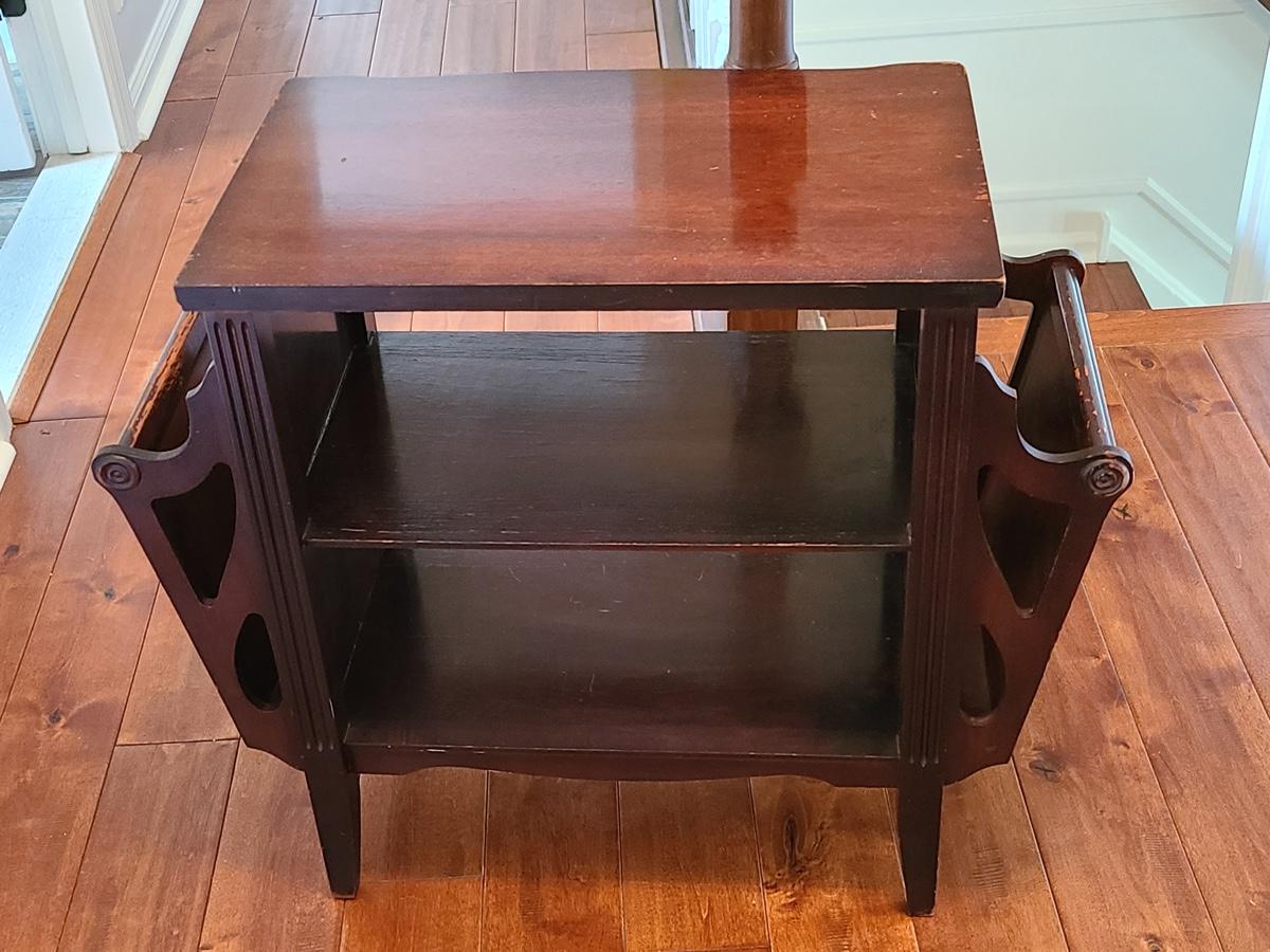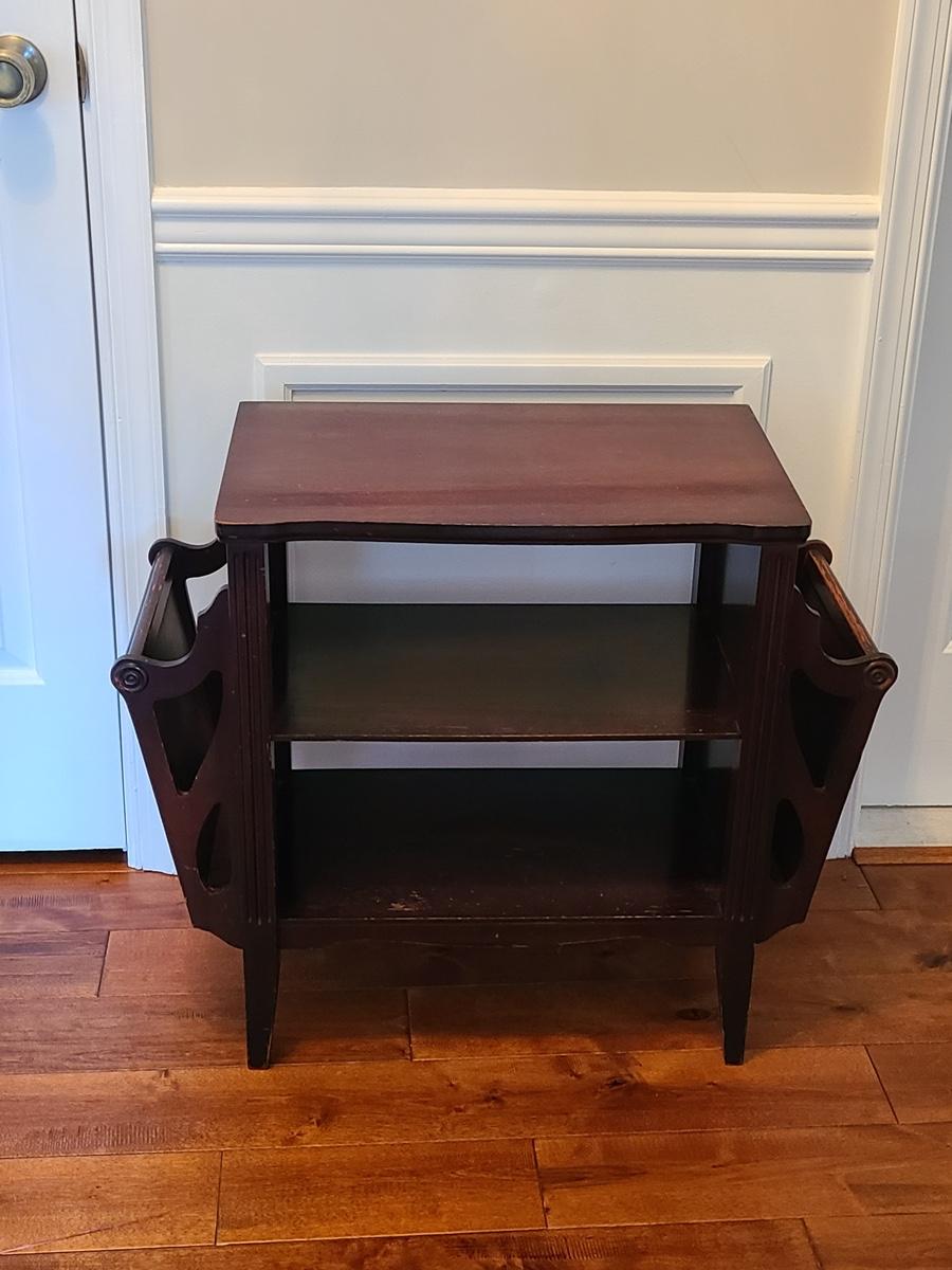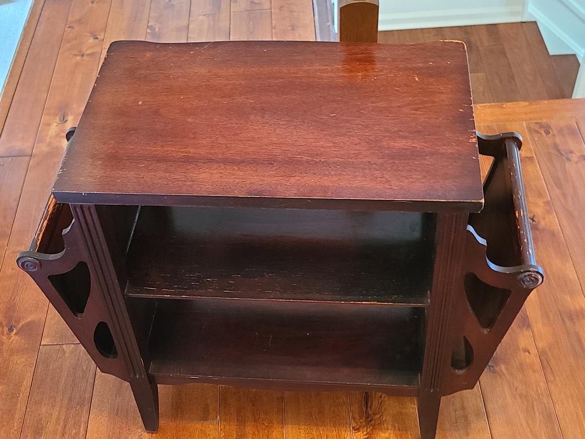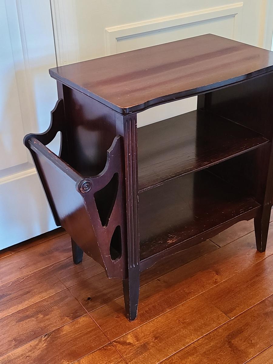 Vintage magazine table, petite in size. Mahogany stained in color. Minor wear due to age. Was used as a nightstand. No measurements. Please see all pictures as they are the best representation of the items in the lot, the condition of the lot, and will show measurements if taken. If purchasing furniture you must be able to move yourself with your own help, and truck. .