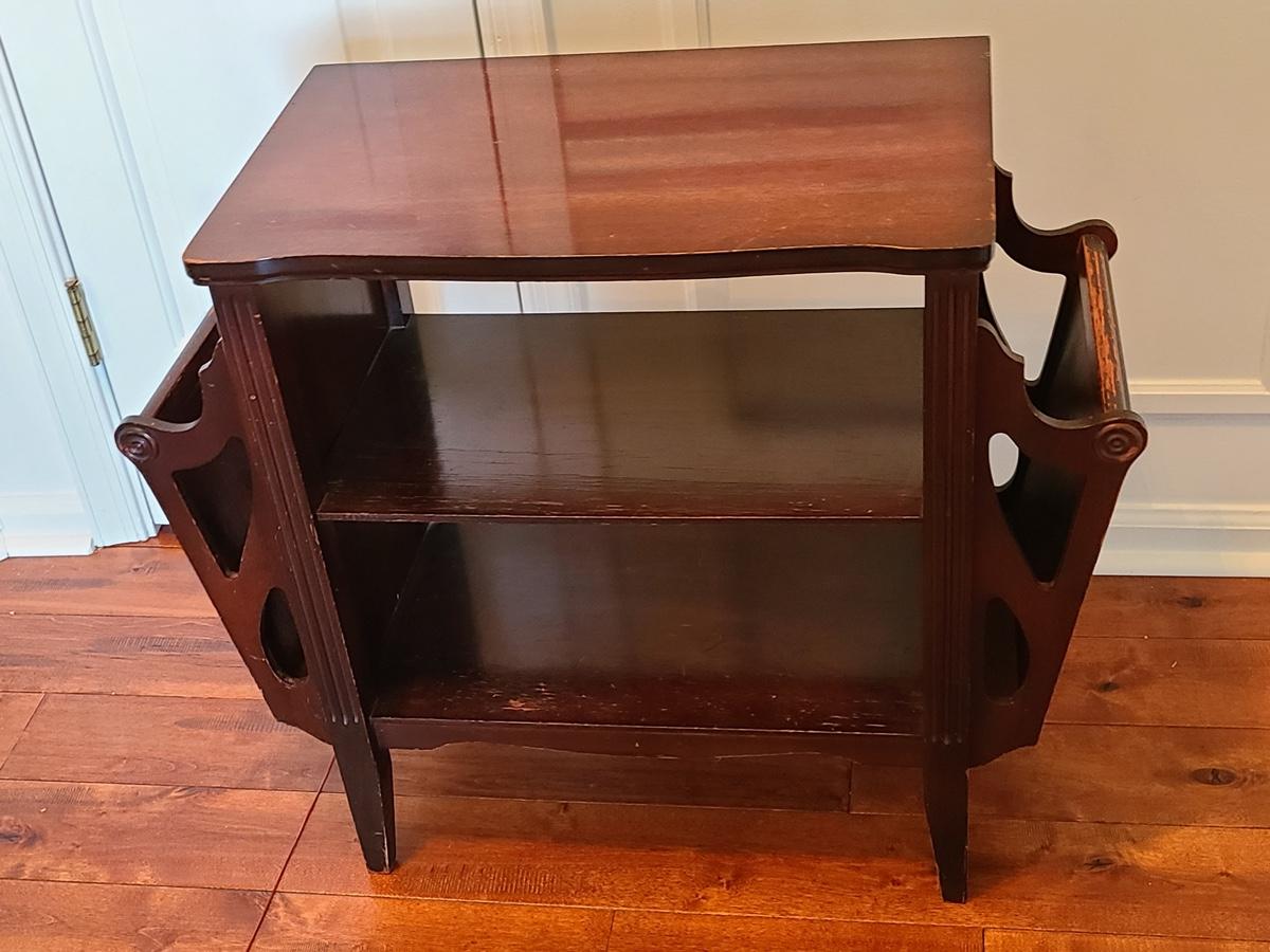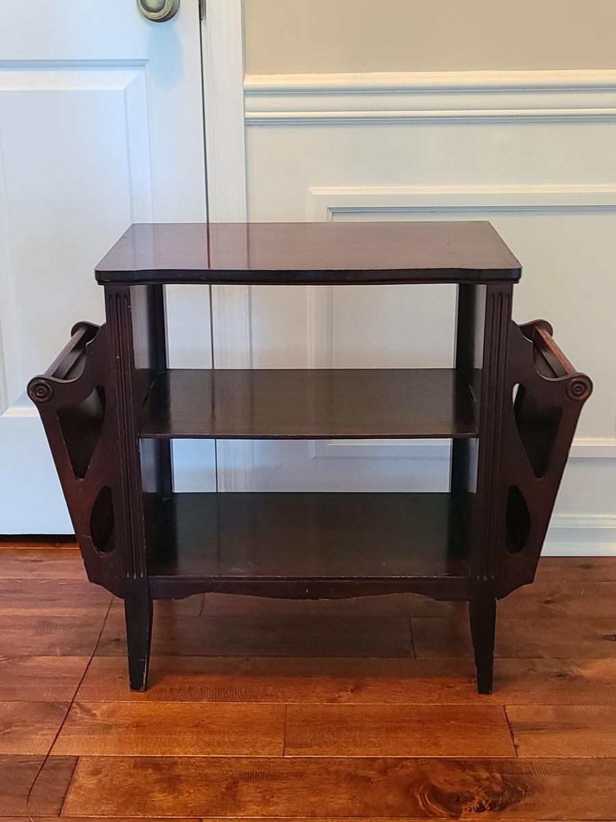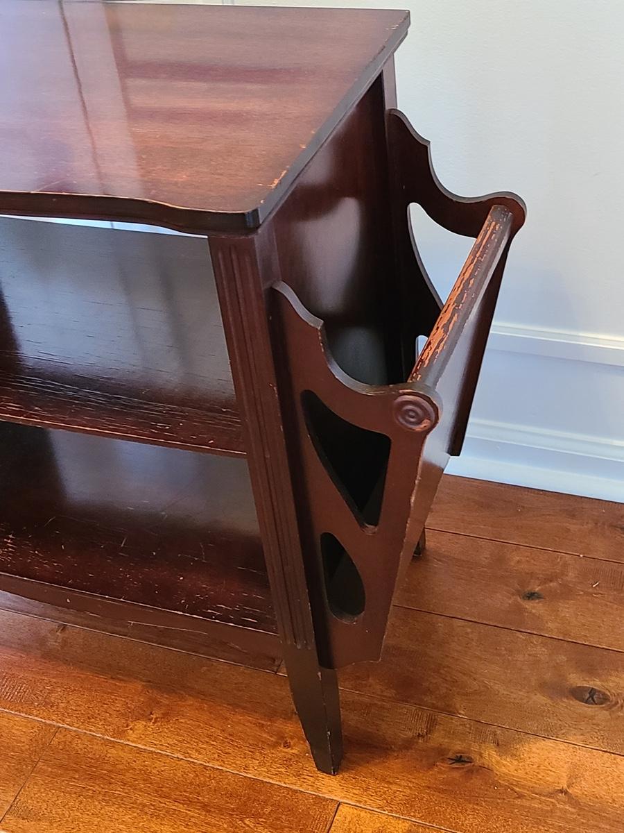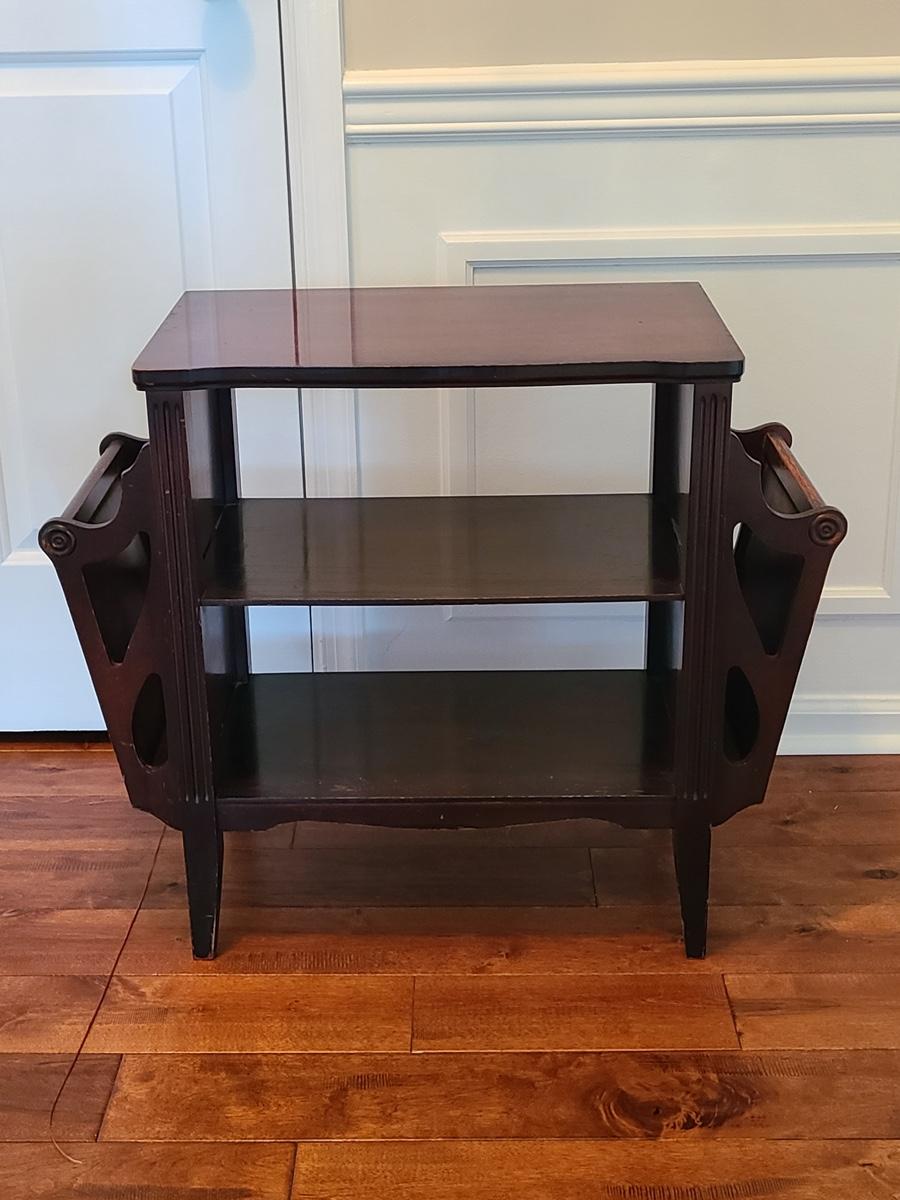 Vintage magazine table, petite in size. Mahogany stained in color. Minor wear due to age. Was used as a nightstand. No measurements. Please see all pictures as they are the best representation of the items in the lot, the condition of the lot, and will show measurements if taken. If purchasing furniture you must be able to move yourself with your own help, and truck. .