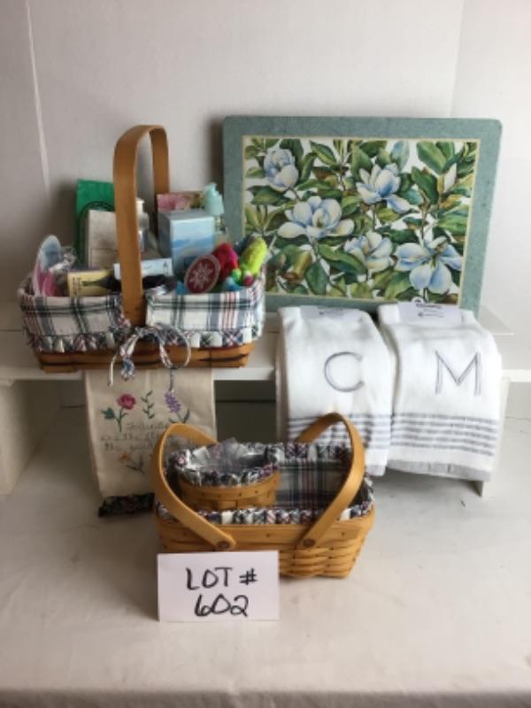 Longaberger Pie basket, Oregano basket and Woven Memories Basket. Candles, two pair of lounge socks, Yardley soap, four Simply Venus razors, foot scrubs and more