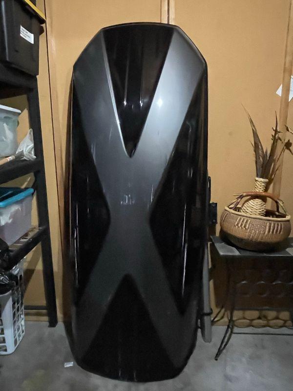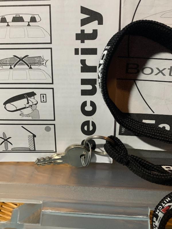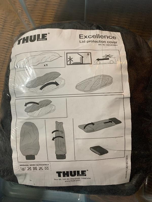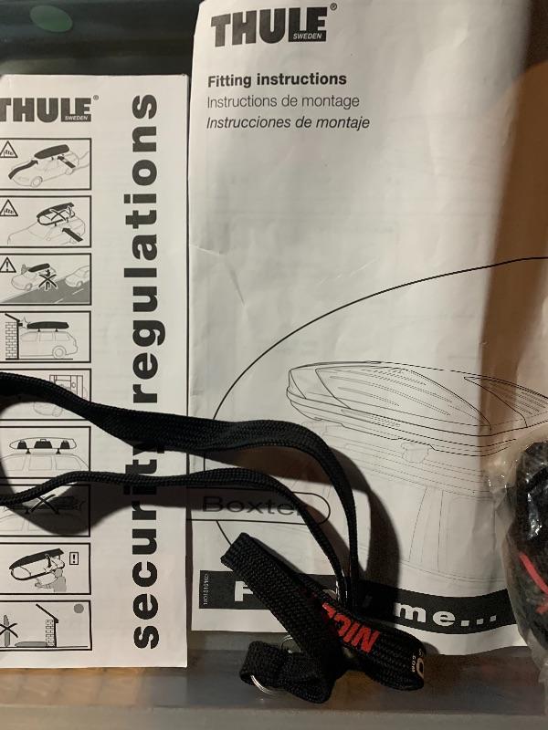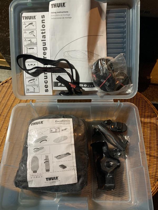 Thule car storage container comes with cover, instructions and rack connect for vehicle. And 2 keys