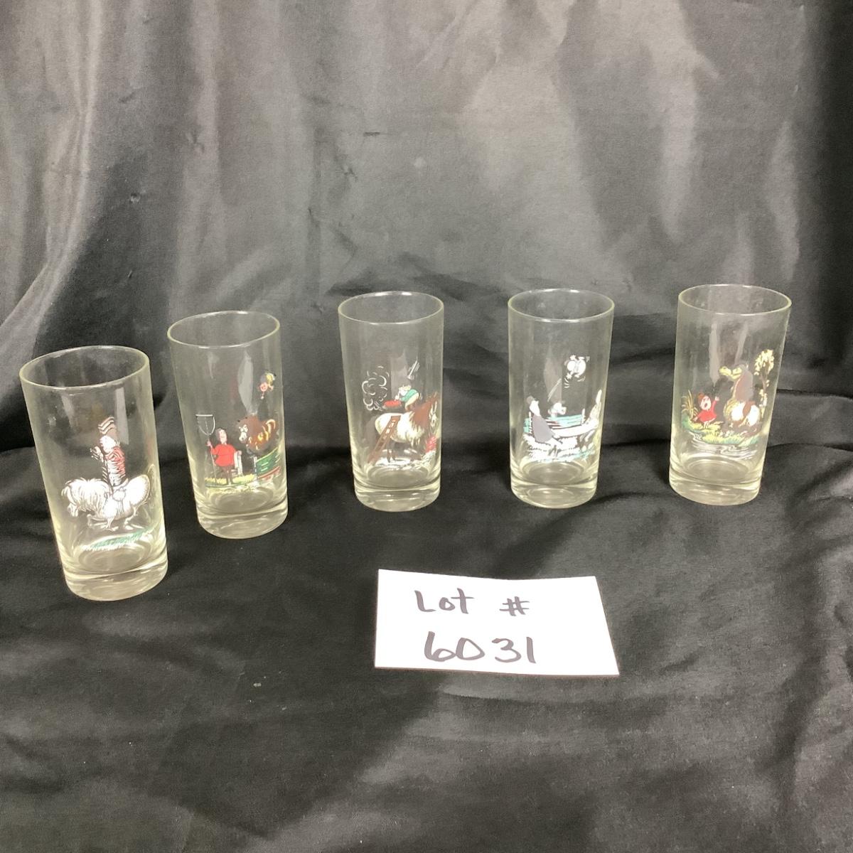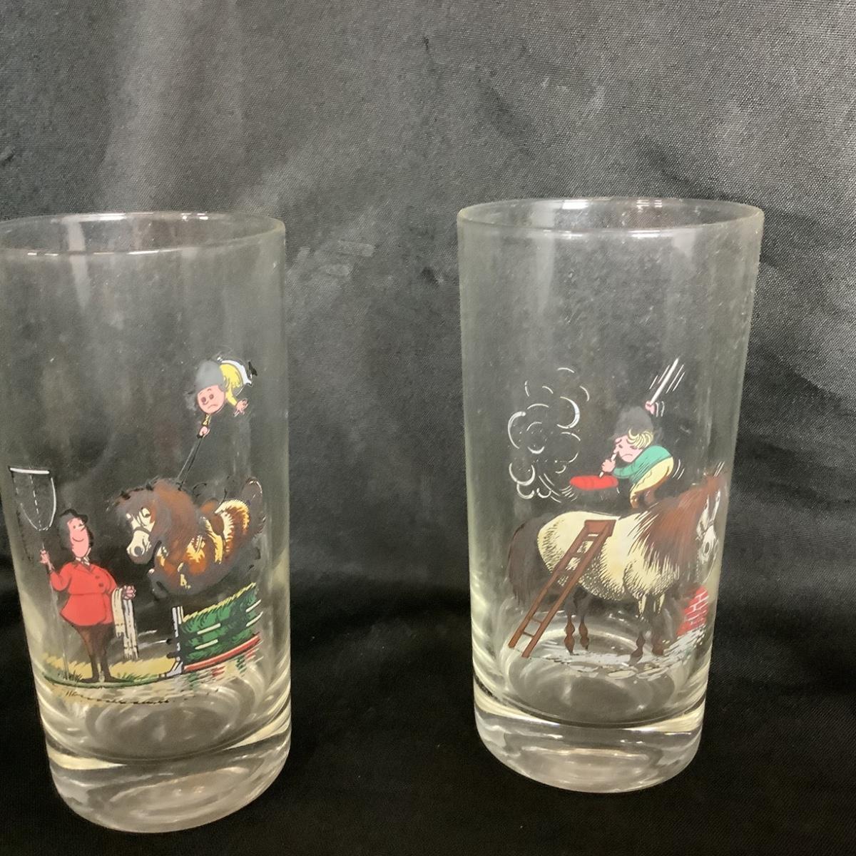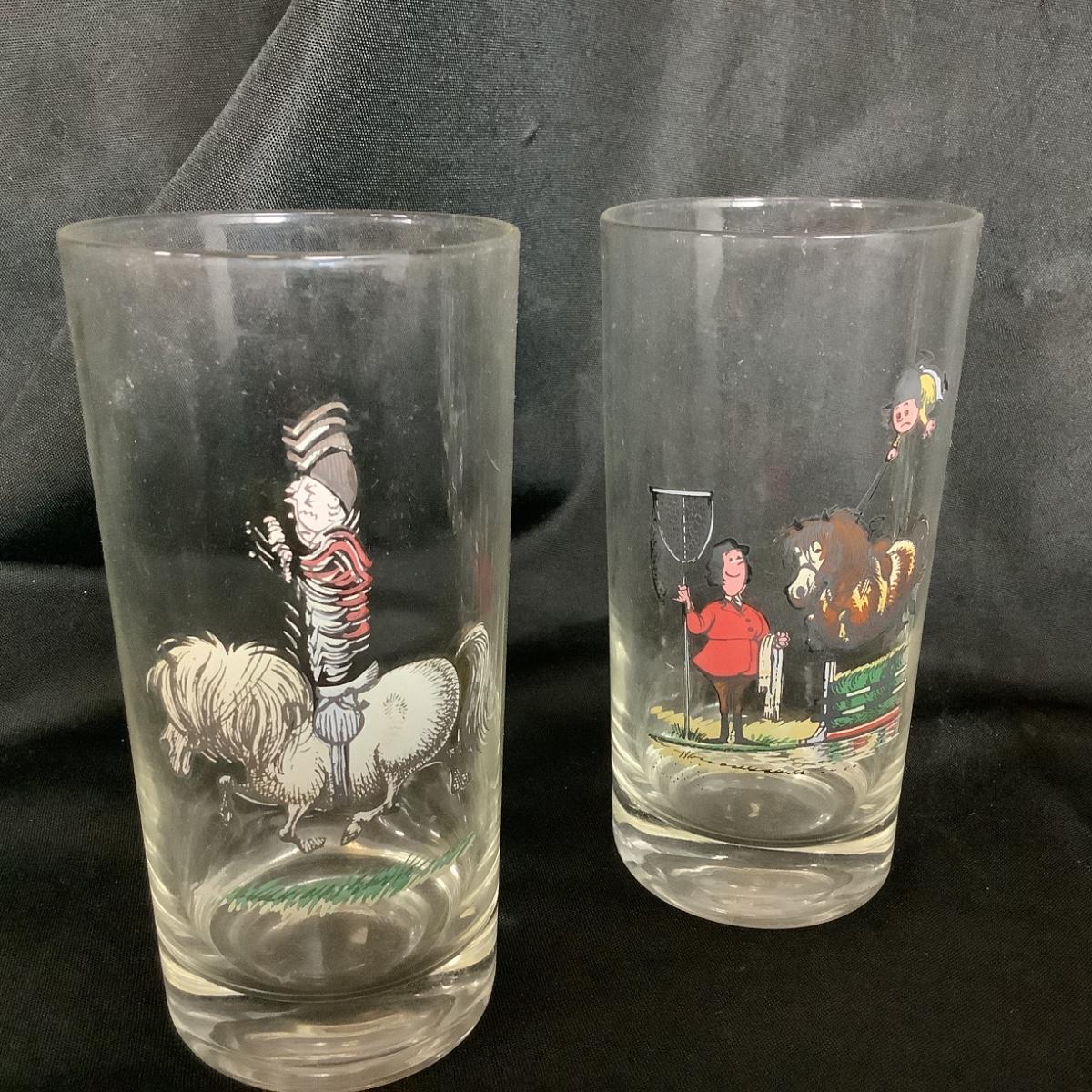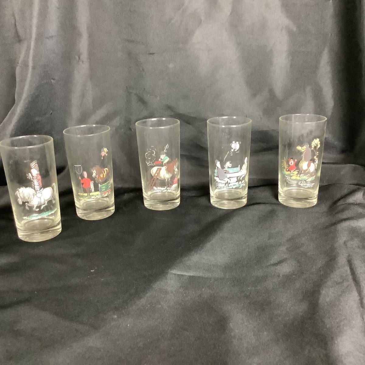 Lot. 6031. Set of Five Vintage Mid Century Modern Norman Thelwell, Horse & Rider Pony Highball Cocktail Glasses Tumbler