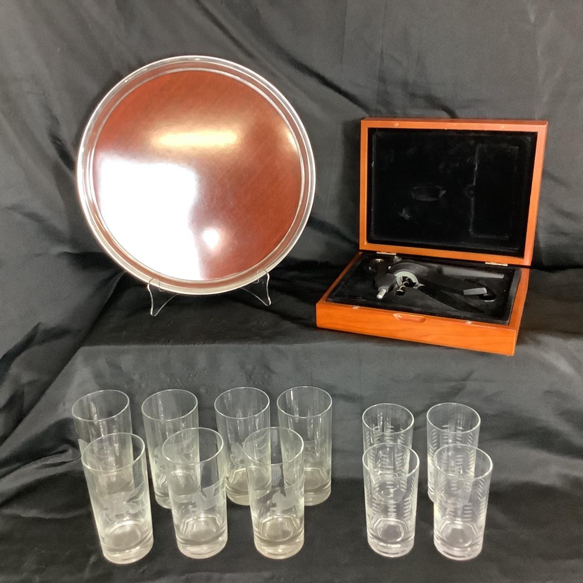Lot  6035. Lot of Mid Century Pegasus Glass Set, Serving Tray, Wine Opener