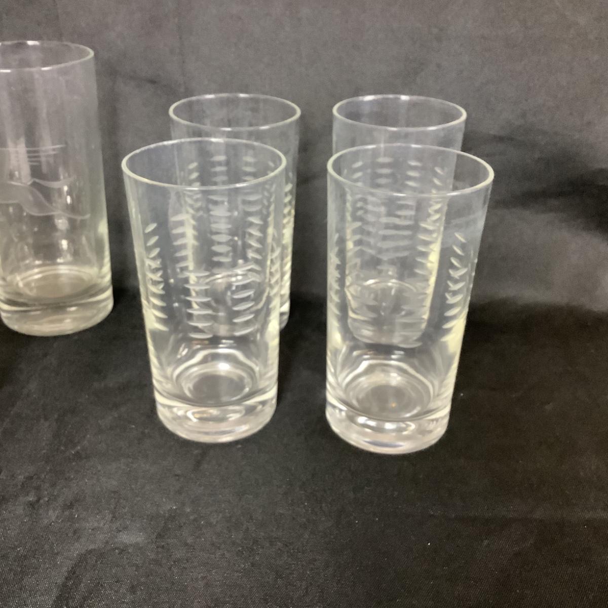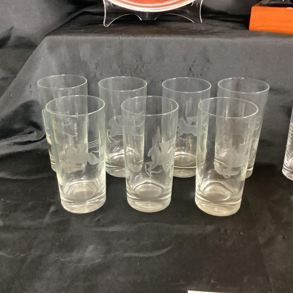 Lot of Mid Century Modern Etched Pegasus,Glass Set 7/ Serving Tray / Wine Opener in Wooden Case